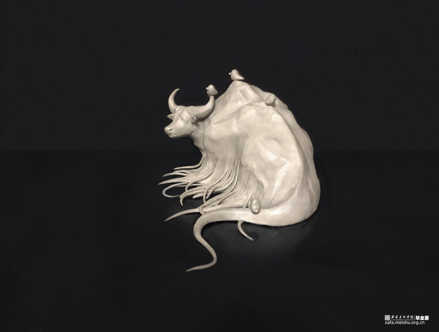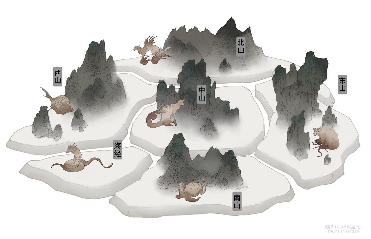毕设以山海经为主题,根据山海经中所描述的异兽形象,再结合传统造型元素以及自己的想象进行再设计,意在创作出属于这个时代的,属于自己的神话故事体系。底部的陆地与海洋板块采用熏烧的方式,渐变晕染,泼墨留白,给人一种中国山水画式水墨韵味的感觉,神兽部分采用陶泥混色剂素烧的方式,与熏烧的底座板块更完美的融合,展现一种古朴而原始的美丽。每个山海板块相互独立又互有联系,如同一张小地图般组合在一起,塑造一个光怪陆离,奇幻的山海经世界。