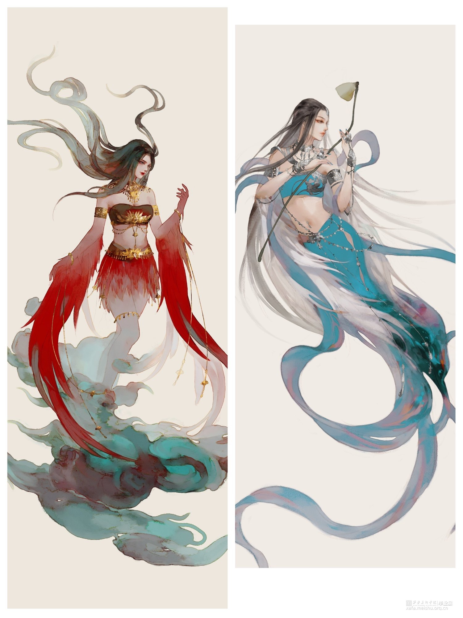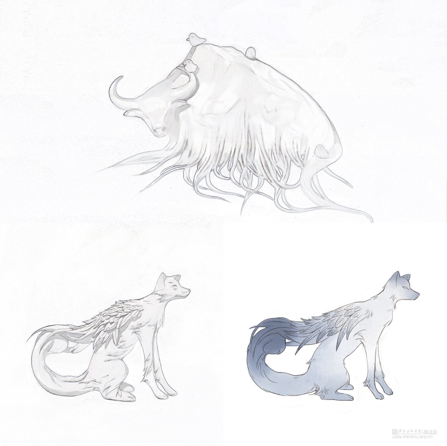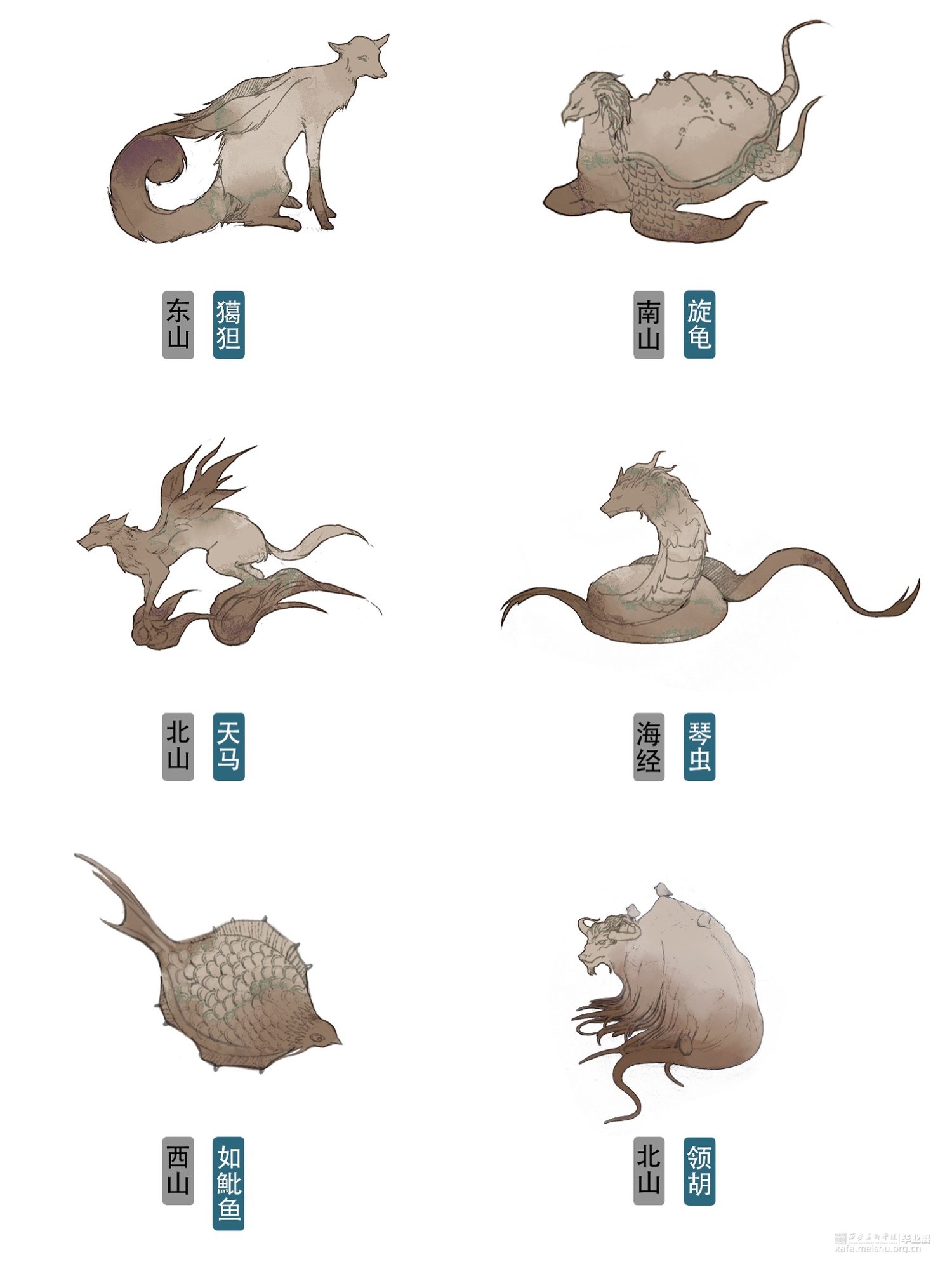 创作过程中自己还设计了一些不好塑造的以人类形象为主的造型,采用人物插画这种艺术形式来展示山海经中的另一面,配合制作出来的异兽形象使得整体作品的展示更加丰富多彩。插画不做实物,仅做展示。