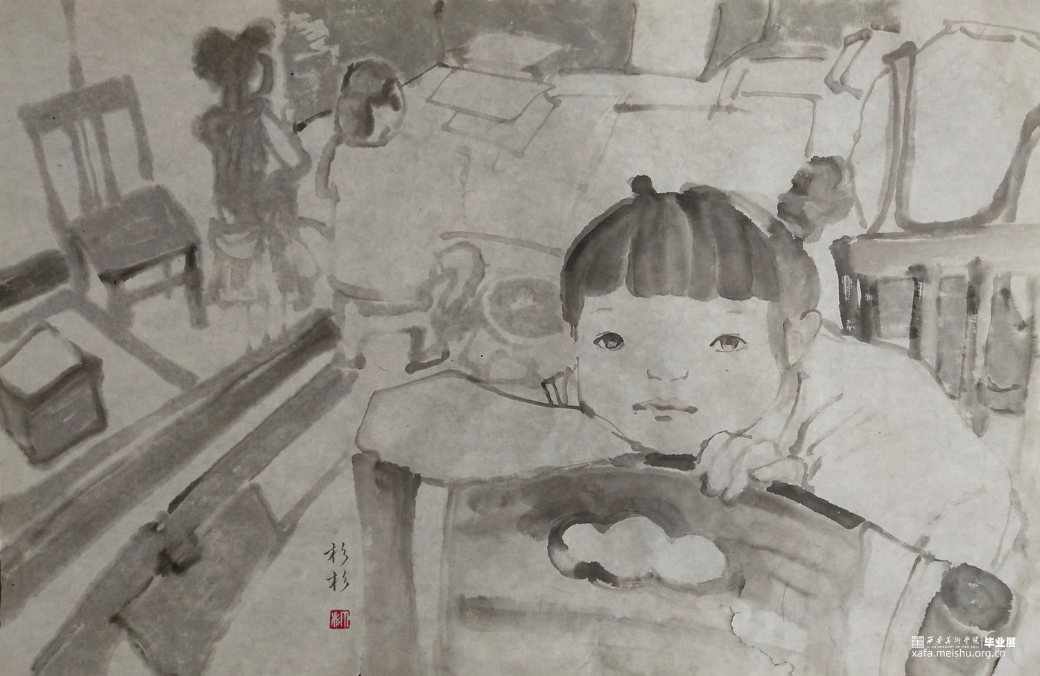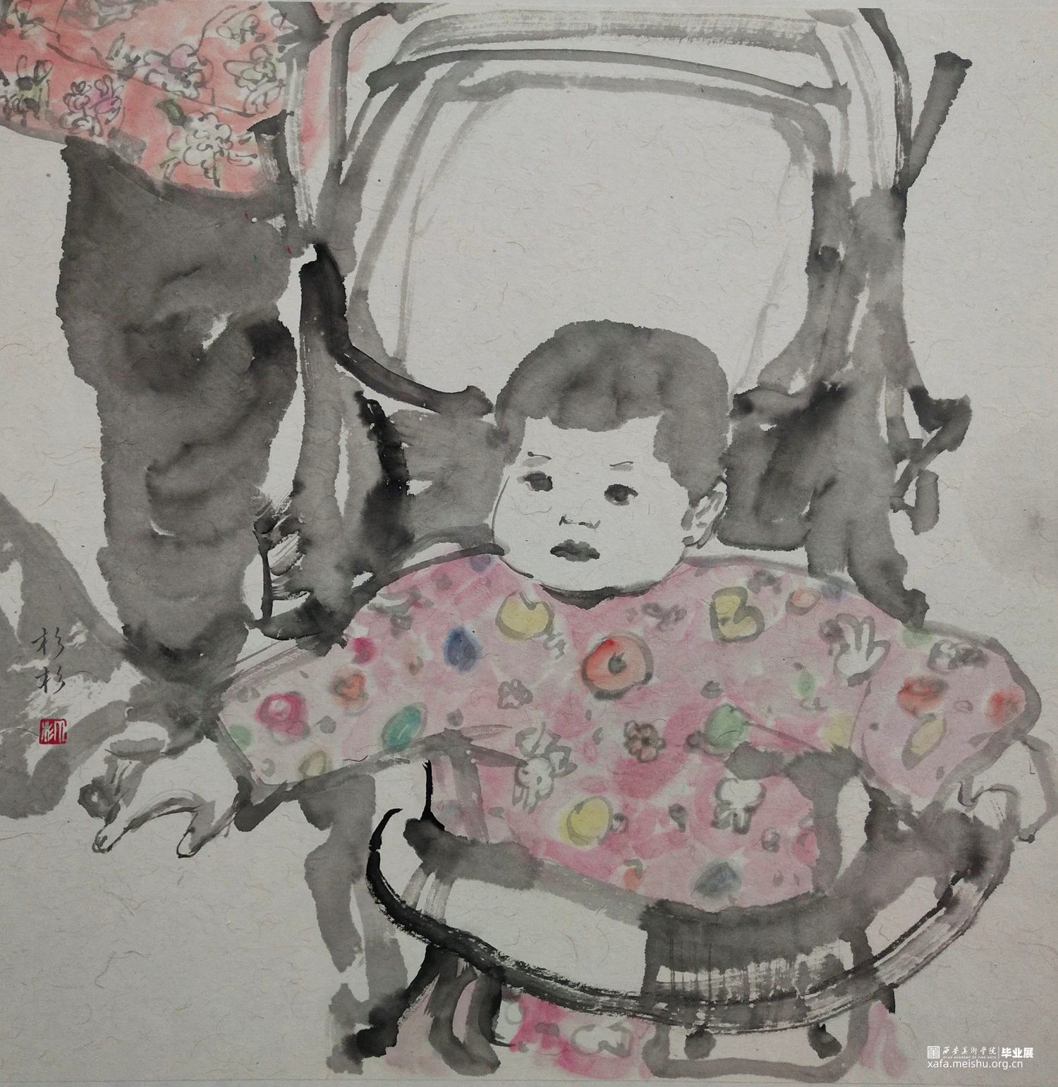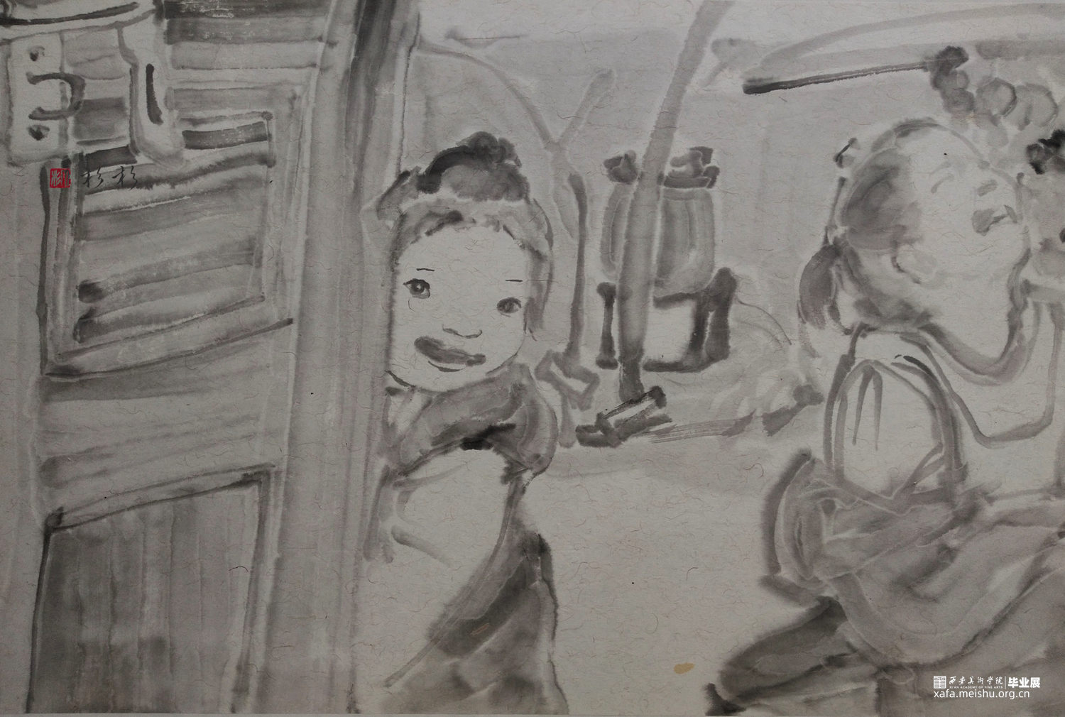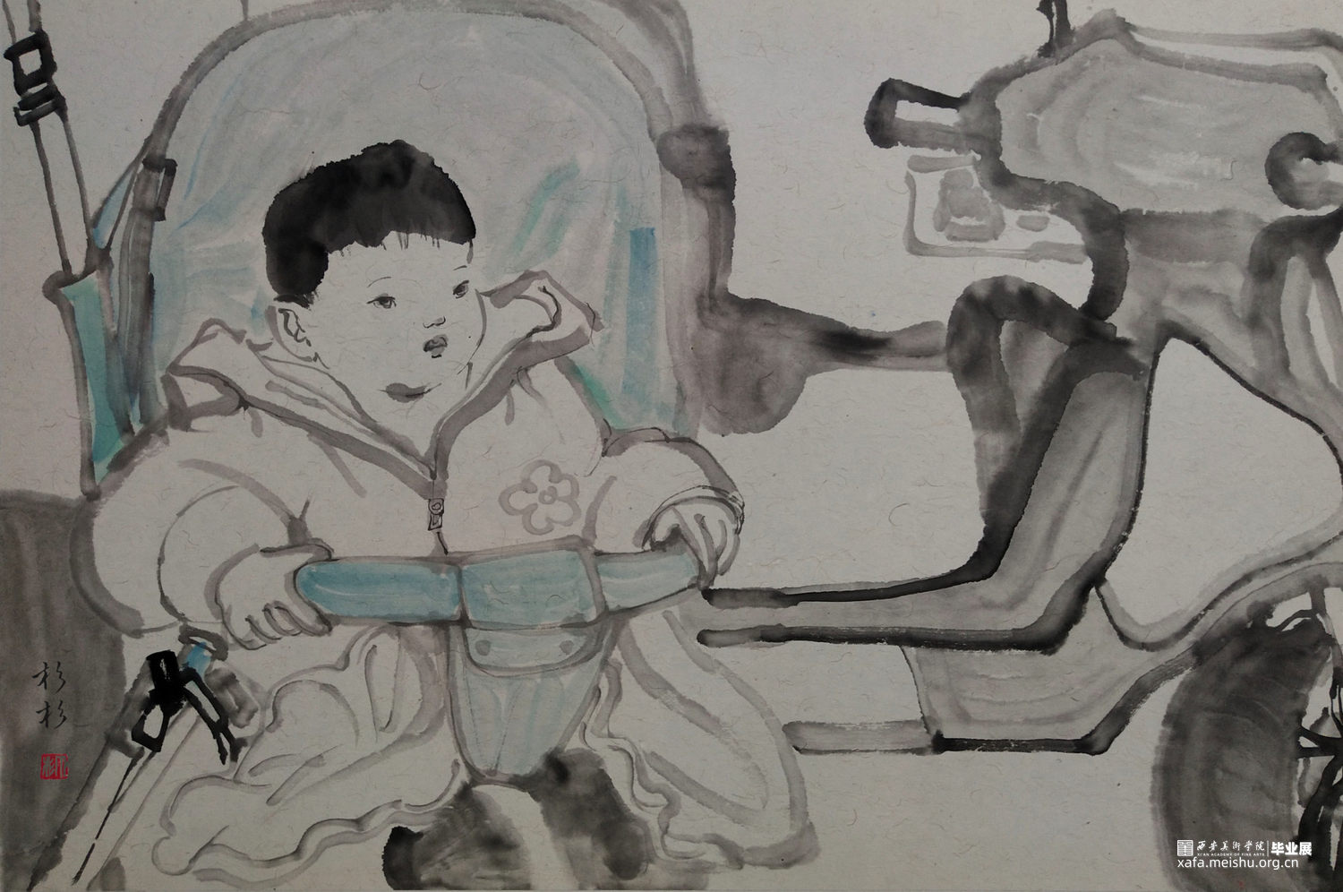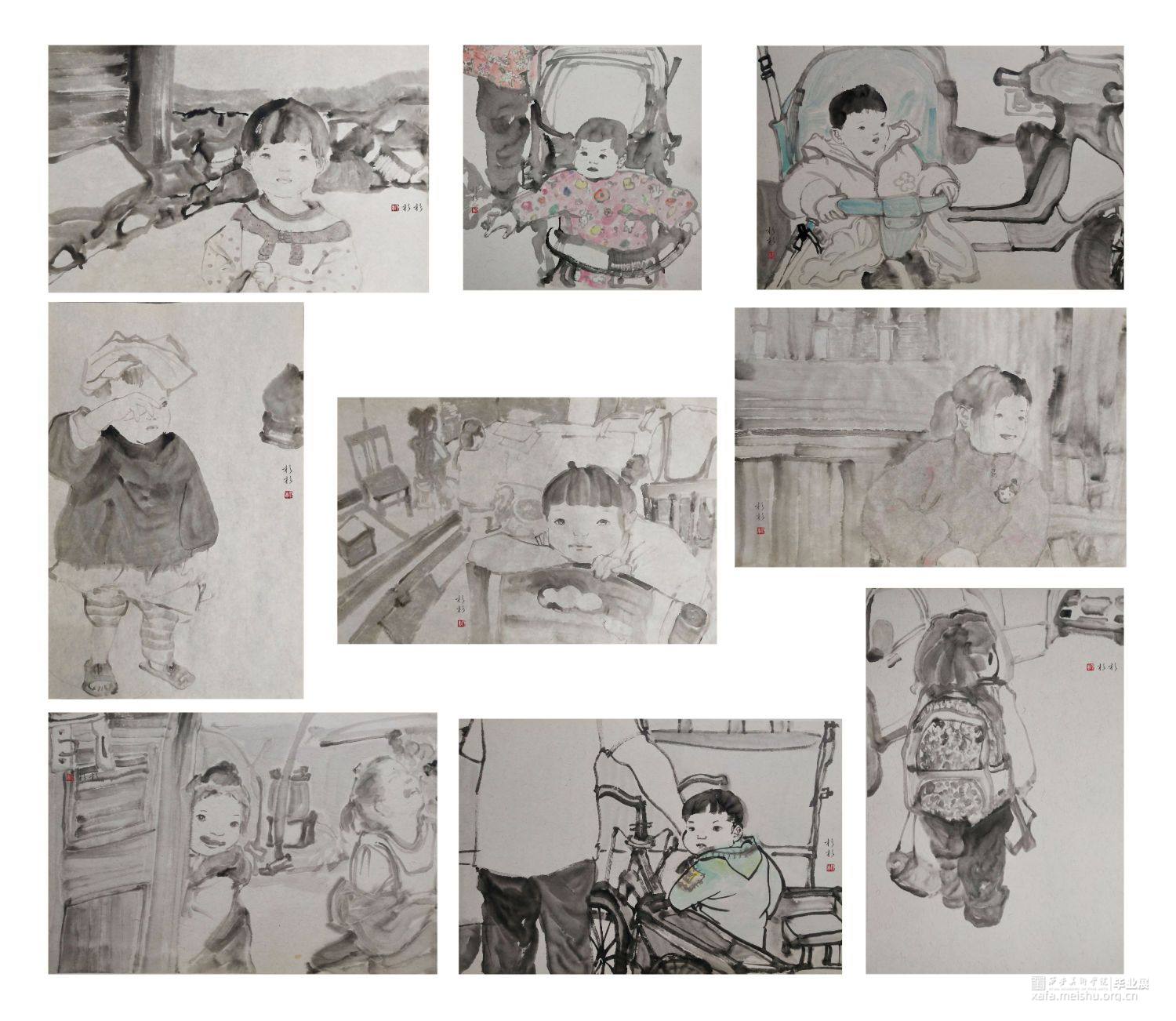 ←家 学校→是我在贵州写生的小山村墙上看到的一个用粉笔画的已经退了色的小涂鸦,也许是孩子也许是父母老师或是大一点的孩子写给小一点的孩子,告诉他往这边走是去学校,往这边是回家的方向。是我的灵感来源,想到了小的时候上学路上的一些回忆,这个小小的旧旧的图案坚定可靠的陪伴着那个小山村孩子们的成长,这次作品围绕着家与学校与路上好奇的观察着这个世界的孩子们来展开,是我对孩子们的好奇的好奇。