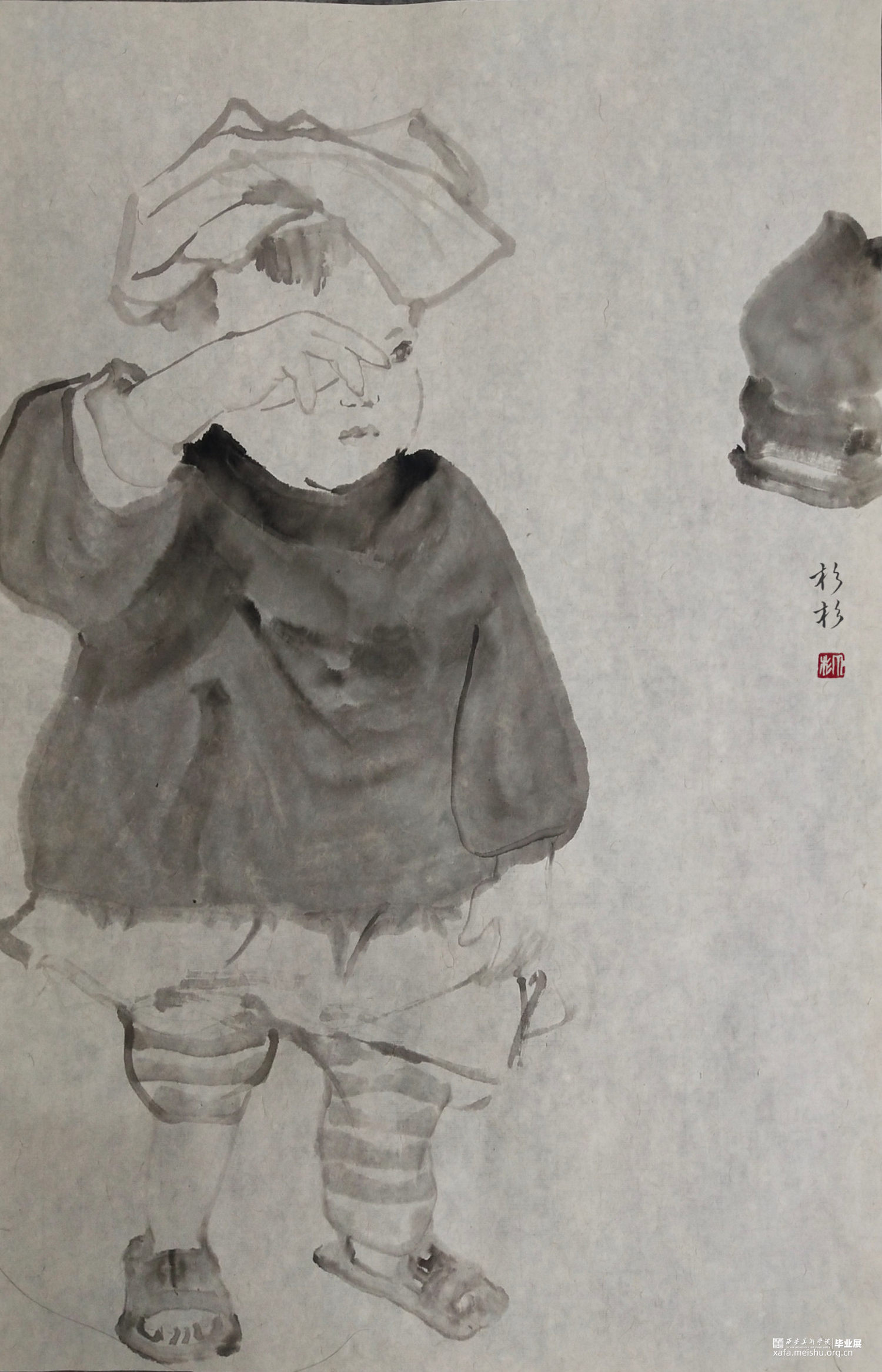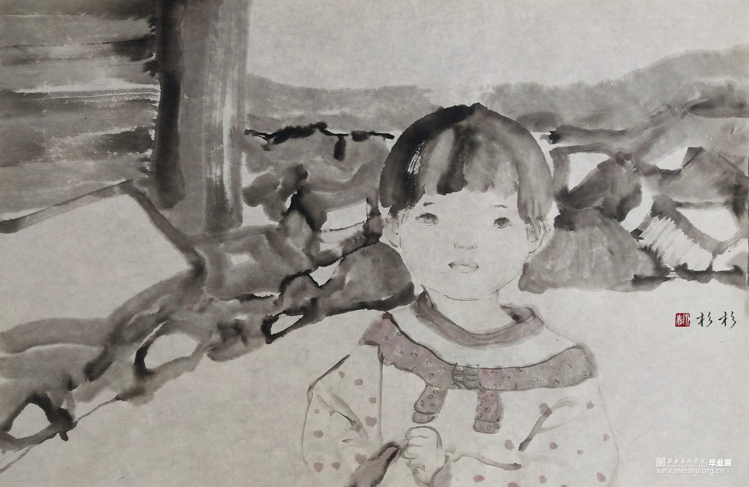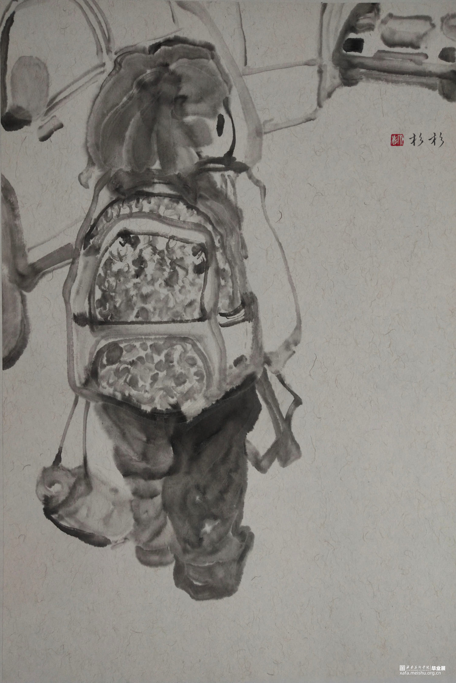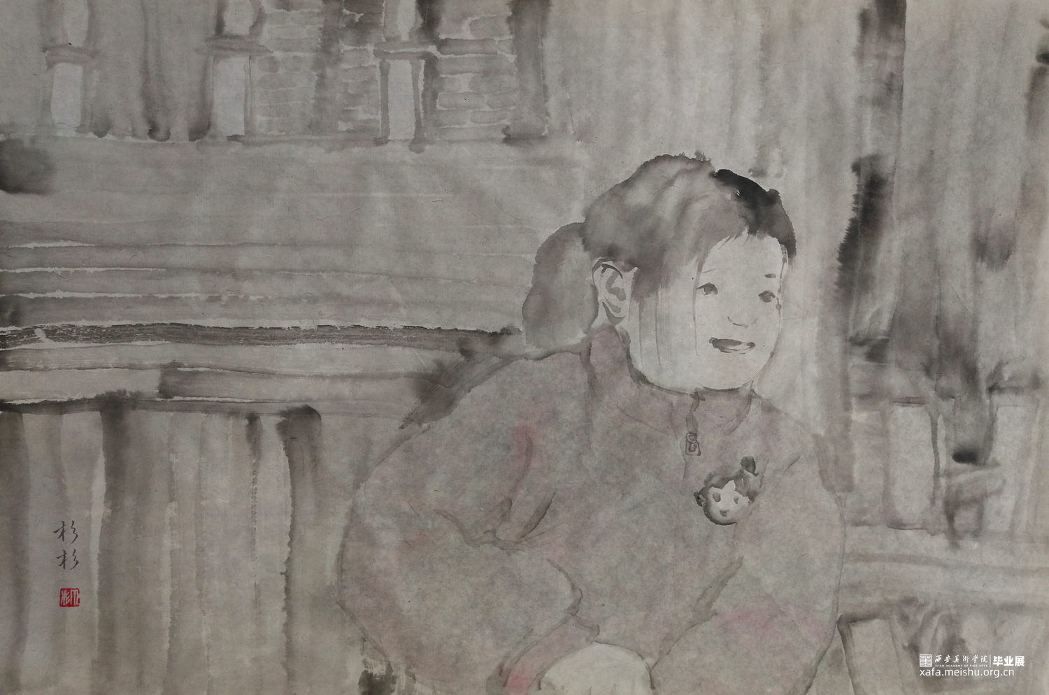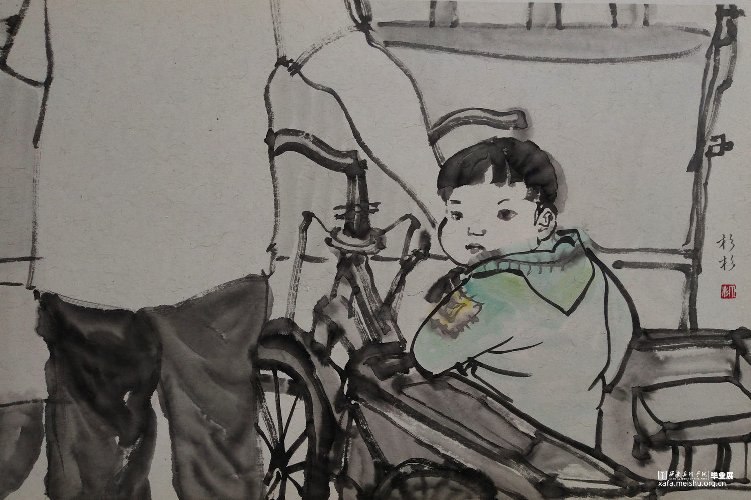 ←家 学校→是我在贵州写生的小山村墙上看到的一个用粉笔画的已经退了色的小涂鸦,也许是孩子也许是父母老师或是大一点的孩子写给小一点的孩子,告诉他往这边走是去学校,往这边是回家的方向。是我的灵感来源,想到了小的时候上学路上的一些回忆,这个小小的旧旧的图案坚定可靠的陪伴着那个小山村孩子们的成长,这次作品围绕着家与学校与路上好奇的观察着这个世界的孩子们来展开,是我对孩子们的好奇的好奇。
