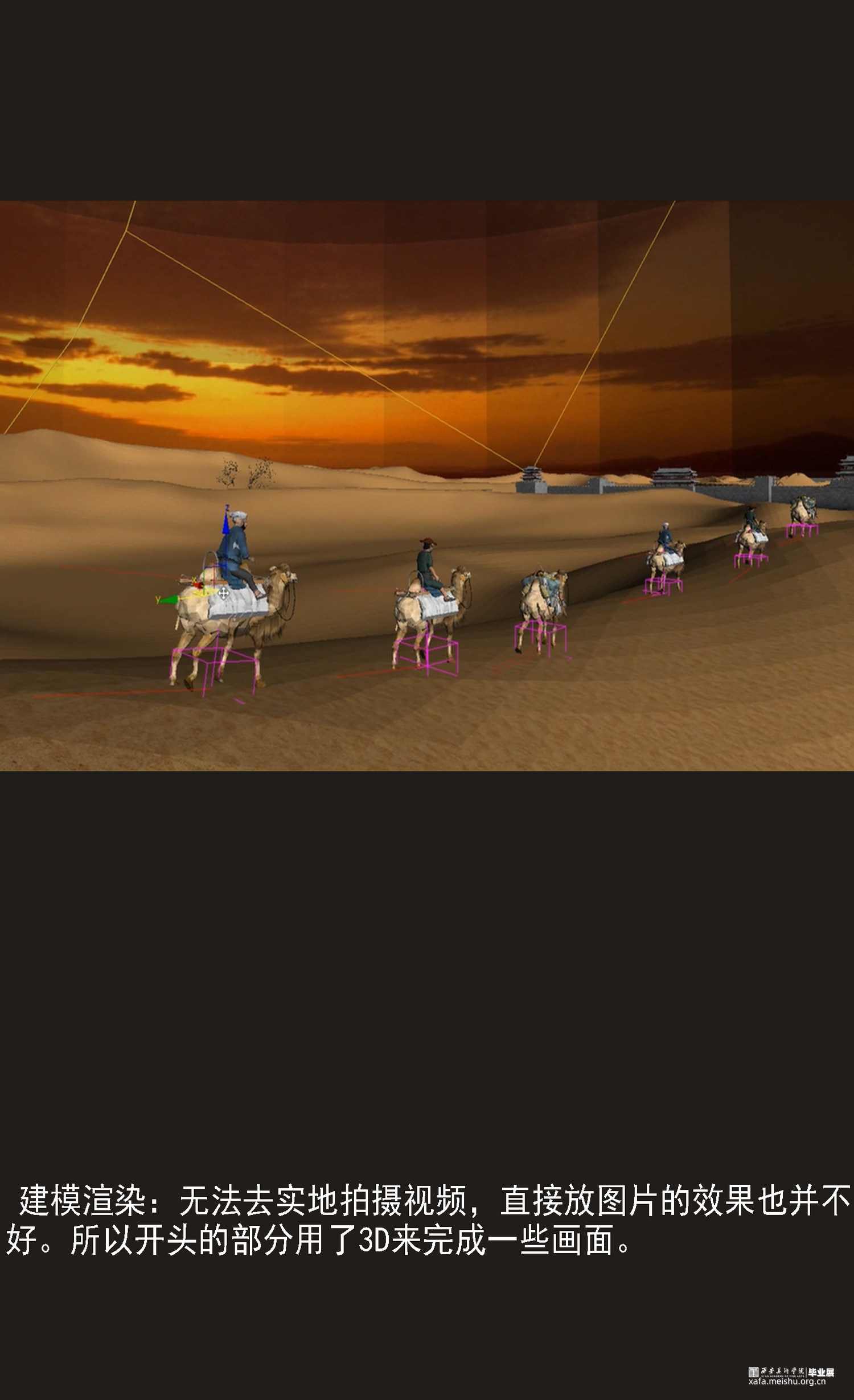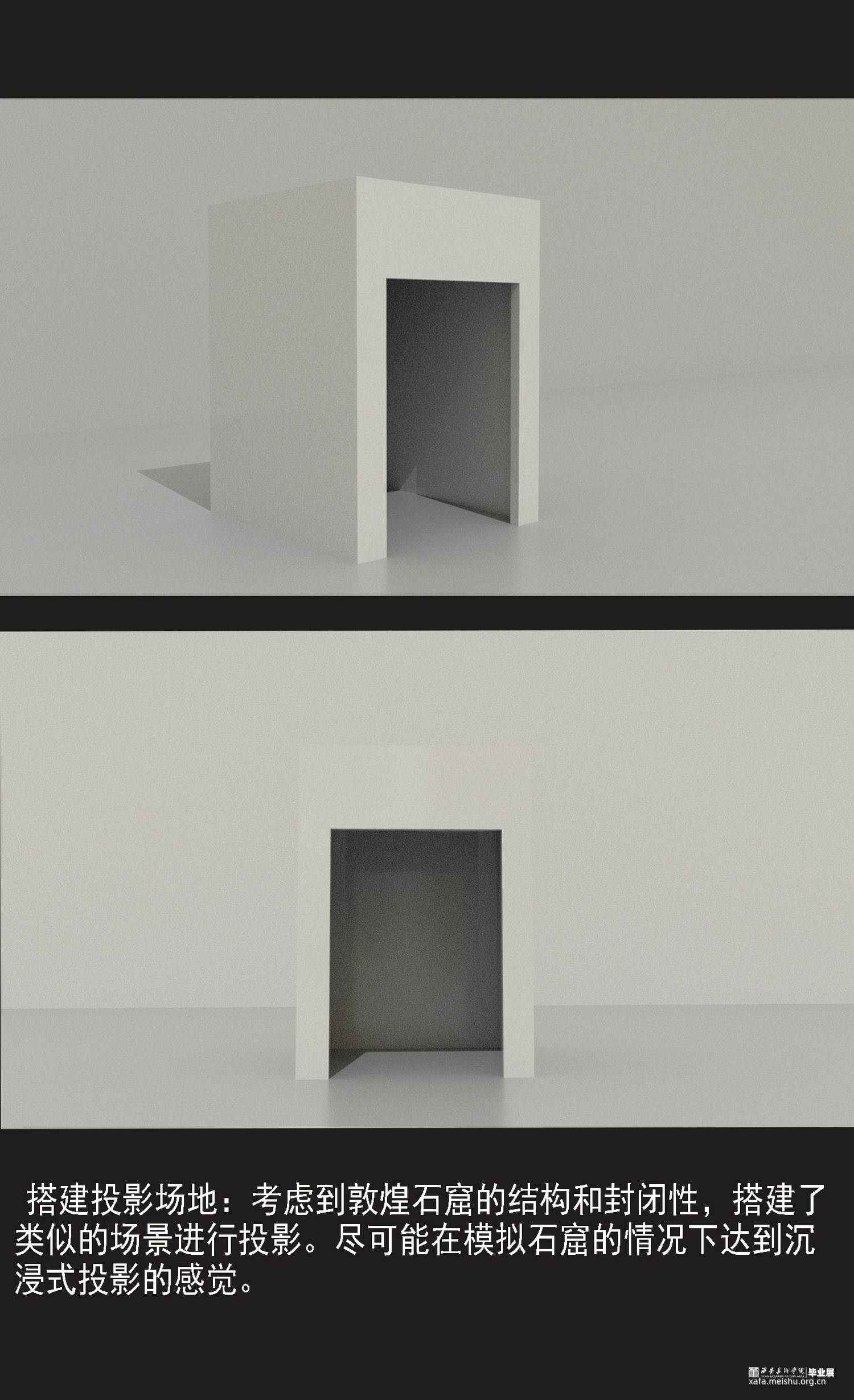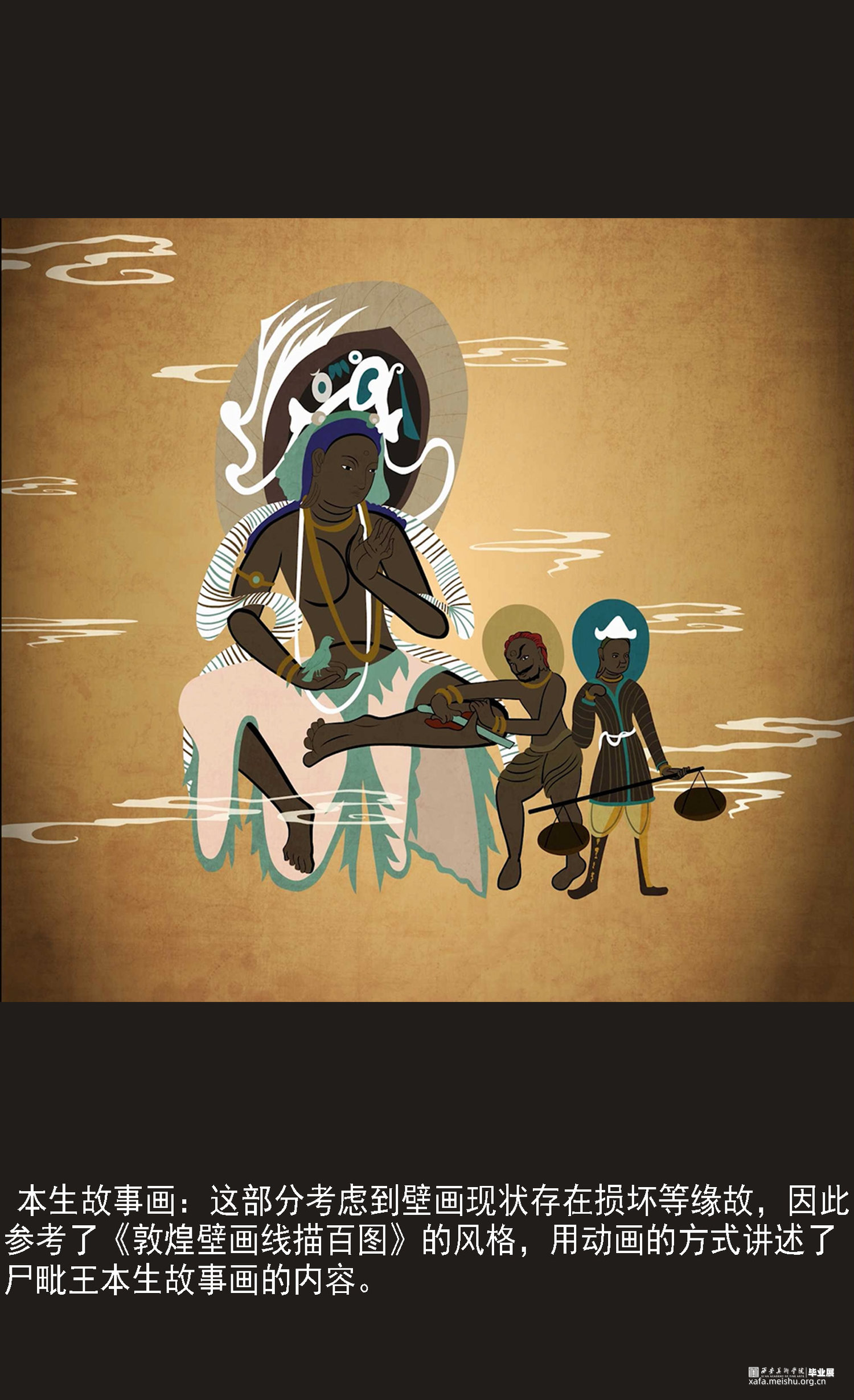 本作品意在表达将敦煌传统艺术与建筑投影结合起来,以这种形式带给大家传统文化的魅力。希望通过作品,可以将敦煌壁画的魅力传达给观众,同时也希望提起观众对这些传统艺术的重视和保护。