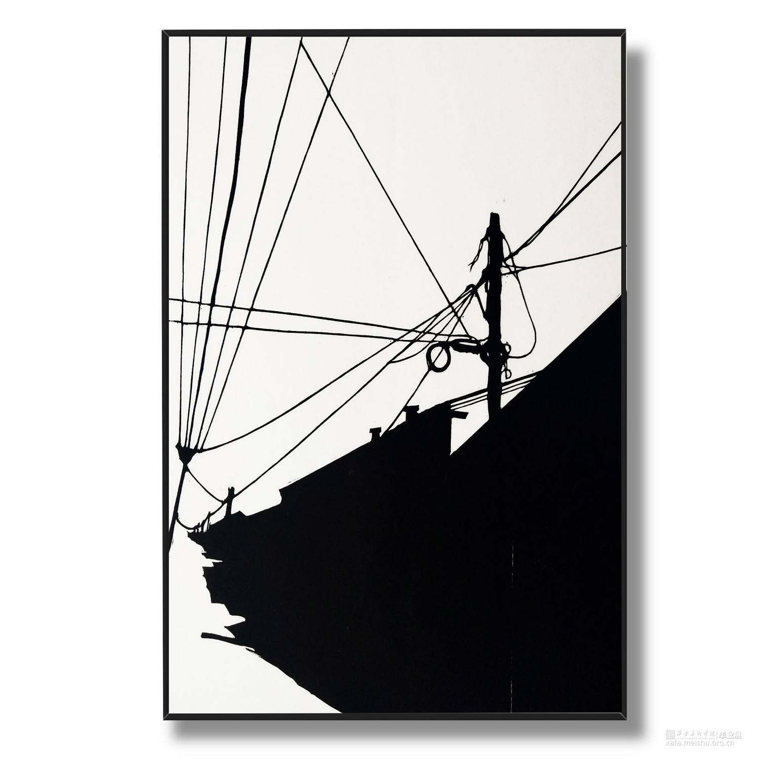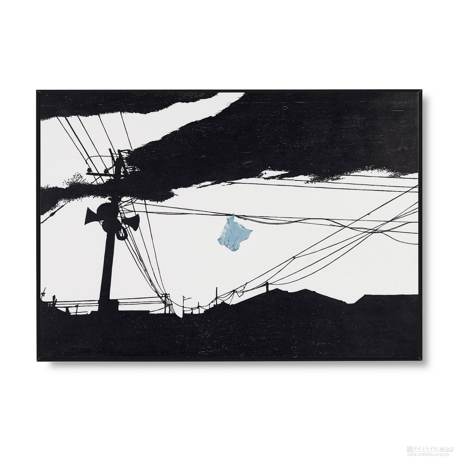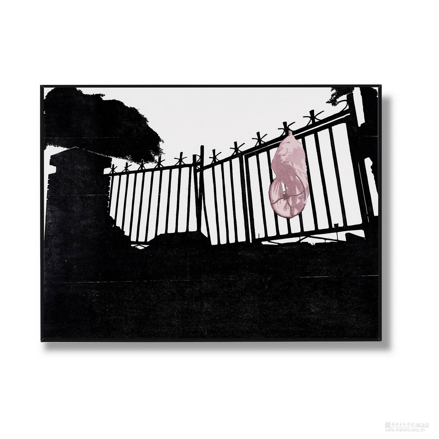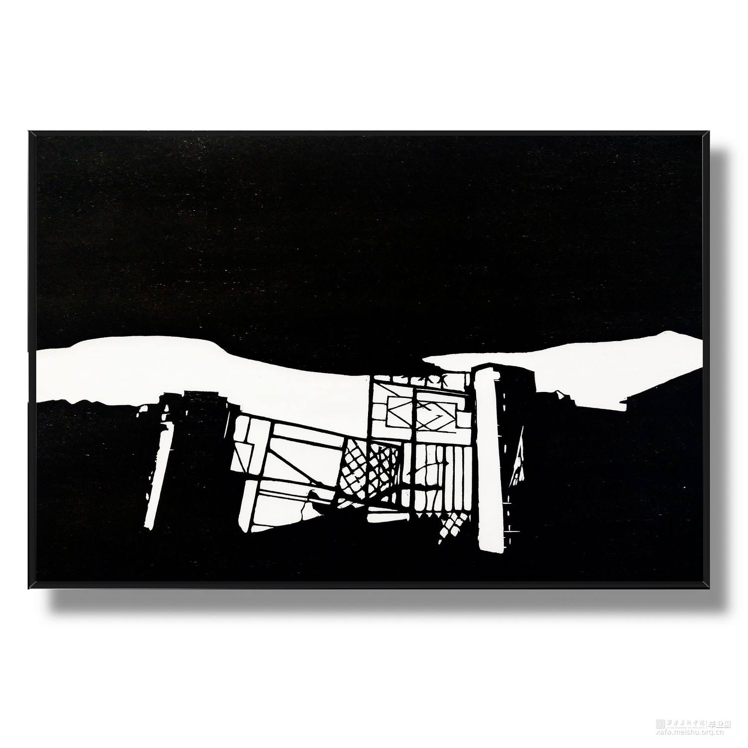 城市发展,旧房屋不断被拆,大部分房屋已经人去楼空,仅仅留下残缺的时间痕迹。村民搬离农村去往城市生活,昔日的生活气息消失不见。在我的生活环境中,通过作品与当下社会变迁发生互动,拆迁的废墟转换为超现实主义社会空间,以一种特殊定义去表达内心对昔日生活的憧憬。时间记忆让自己对乡村有了无数情感,而如今城市的街道、社区却不像家一样温暖,也让往日的生活变成了永恒记忆。作品由4幅《墟境》和8幅《场景》两部分构成,从绘图、雕刻到印刷完成,让刀与板之间达成了共识,让作品在一种平凡的绘画语言中充满艺术活力。《墟境》系列以黑白场景为主及单景套色为辅,通过捕捉生活现场,例如悬挂在电线上的垃圾袋、铁丝网上的孔明灯、树枝上的风筝等,以不同场景施加不同图像效果;《场境》系列是整体创作的另一部分,通过天气的变化和乡村场景发生互动,光影与地面浑然一体。其次手机拍摄,现场重新分割组合,分为上、中、下三段,中段的房屋建筑与天空形成一条天际线。两部分作品以强烈的黑白分割对比,营造出一种超现实主义空间。这不仅是一幅画,也不是简单的黑白废墟图式,而是一种对乡村废墟的记忆表达,让观众感受作品内的时空交错,走进的一瞬间便有所触动,虽然只有一瞬间,但已经达到我的目的。
