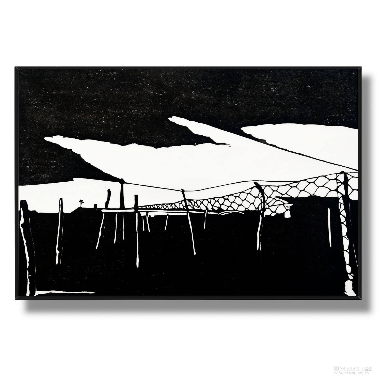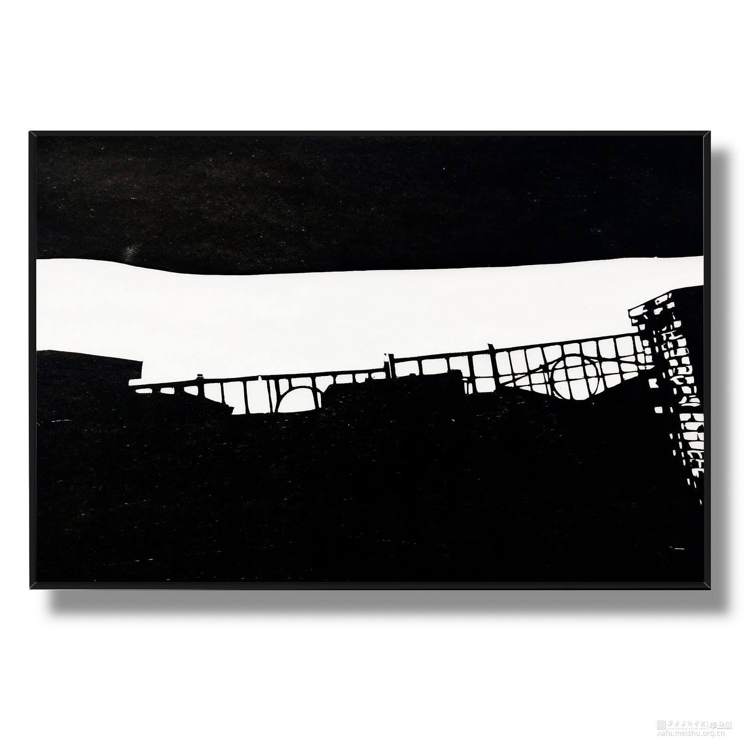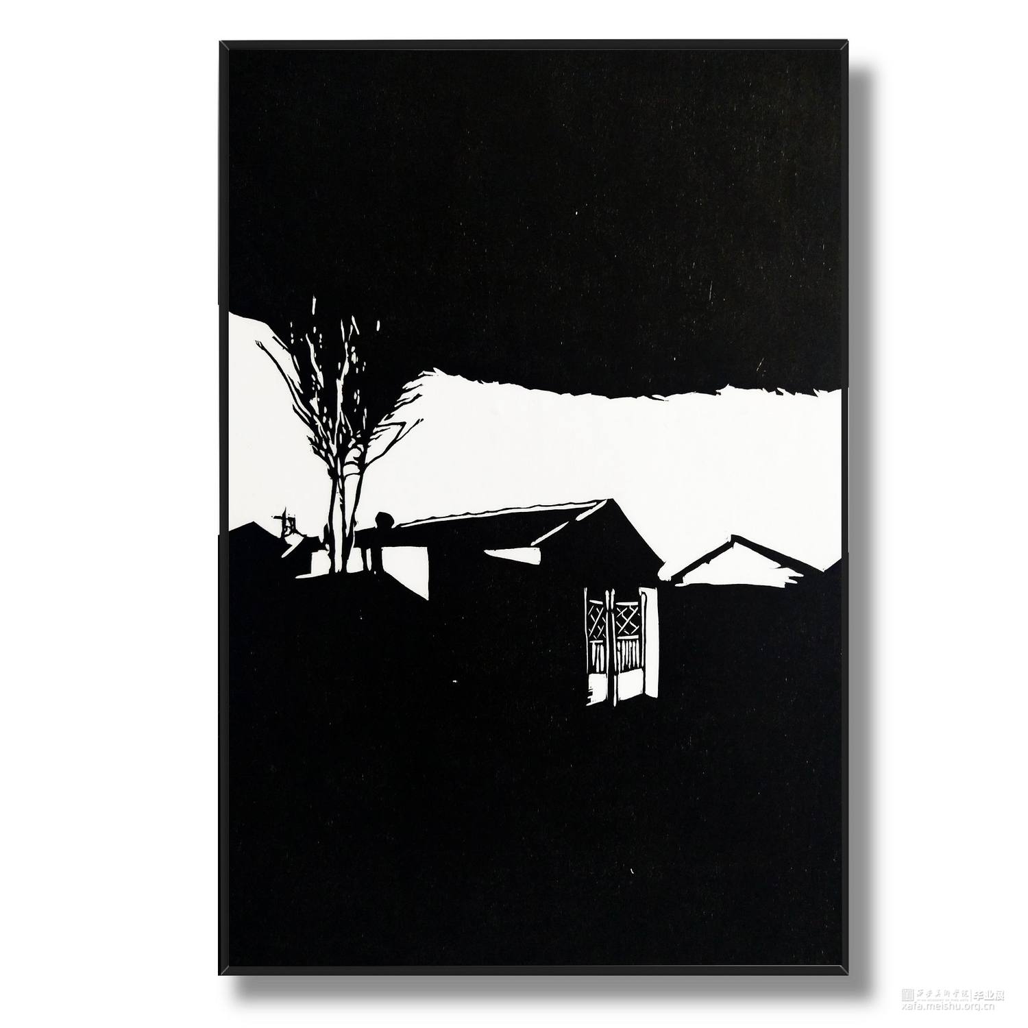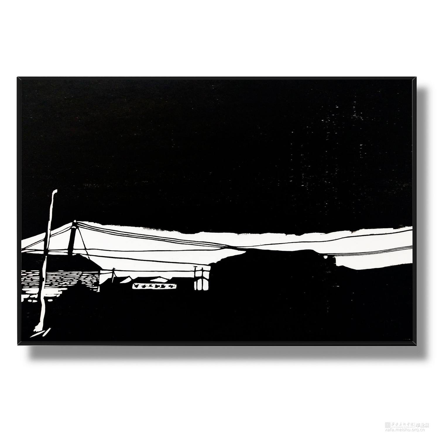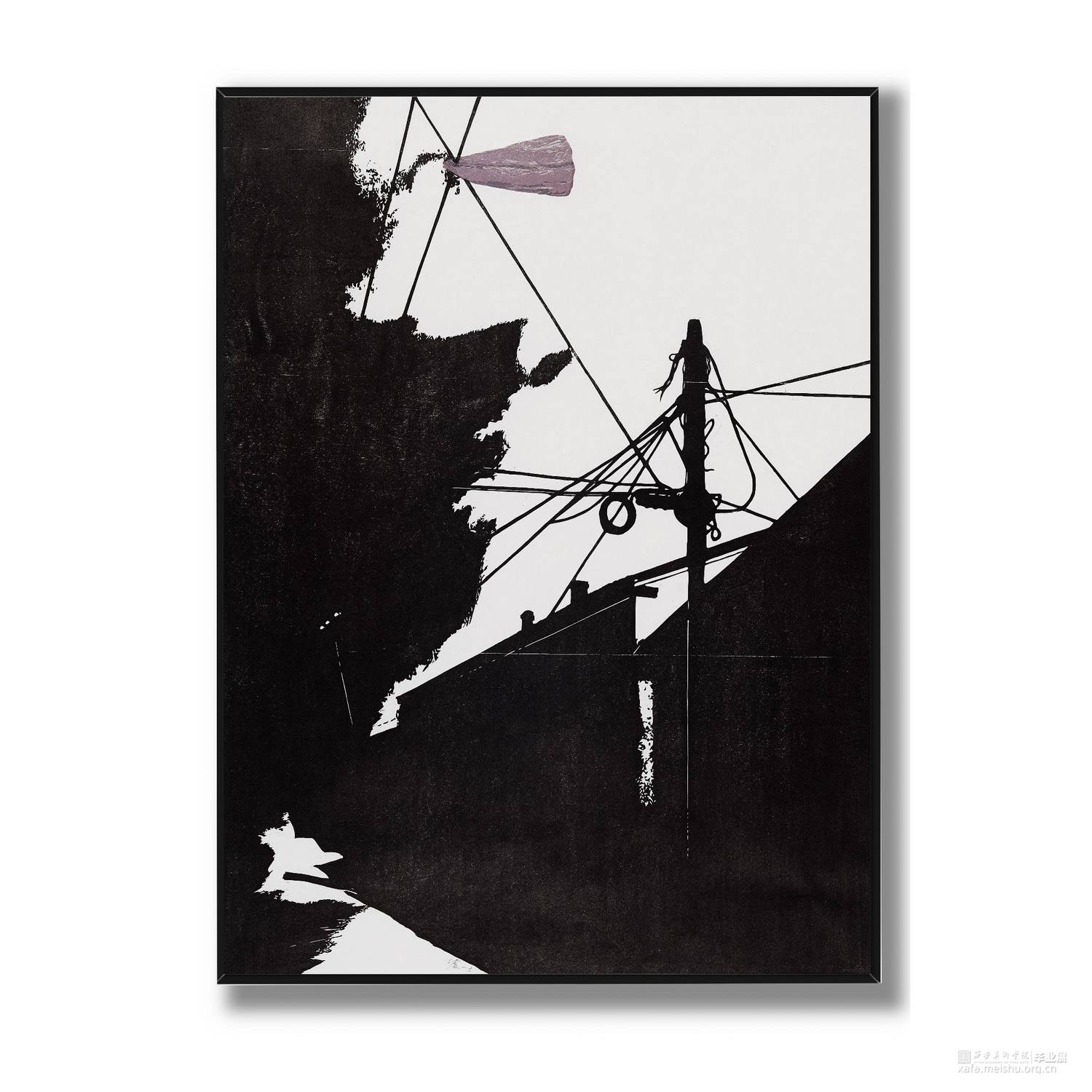 城市发展,旧房屋不断被拆,大部分房屋已经人去楼空,仅仅留下残缺的时间痕迹。村民搬离农村去往城市生活,昔日的生活气息消失不见。在我的生活环境中,通过作品与当下社会变迁发生互动,拆迁的废墟转换为超现实主义社会空间,以一种特殊定义去表达内心对昔日生活的憧憬。时间记忆让自己对乡村有了无数情感,而如今城市的街道、社区却不像家一样温暖,也让往日的生活变成了永恒记忆。作品由4幅《墟境》和8幅《场景》两部分构成,从绘图、雕刻到印刷完成,让刀与板之间达成了共识,让作品在一种平凡的绘画语言中充满艺术活力。《墟境》系列以黑白场景为主及单景套色为辅,通过捕捉生活现场,例如悬挂在电线上的垃圾袋、铁丝网上的孔明灯、树枝上的风筝等,以不同场景施加不同图像效果;《场境》系列是整体创作的另一部分,通过天气的变化和乡村场景发生互动,光影与地面浑然一体。其次手机拍摄,现场重新分割组合,分为上、中、下三段,中段的房屋建筑与天空形成一条天际线。两部分作品以强烈的黑白分割对比,营造出一种超现实主义空间。这不仅是一幅画,也不是简单的黑白废墟图式,而是一种对乡村废墟的记忆表达,让观众感受作品内的时空交错,走进的一瞬间便有所触动,虽然只有一瞬间,但已经达到我的目的。