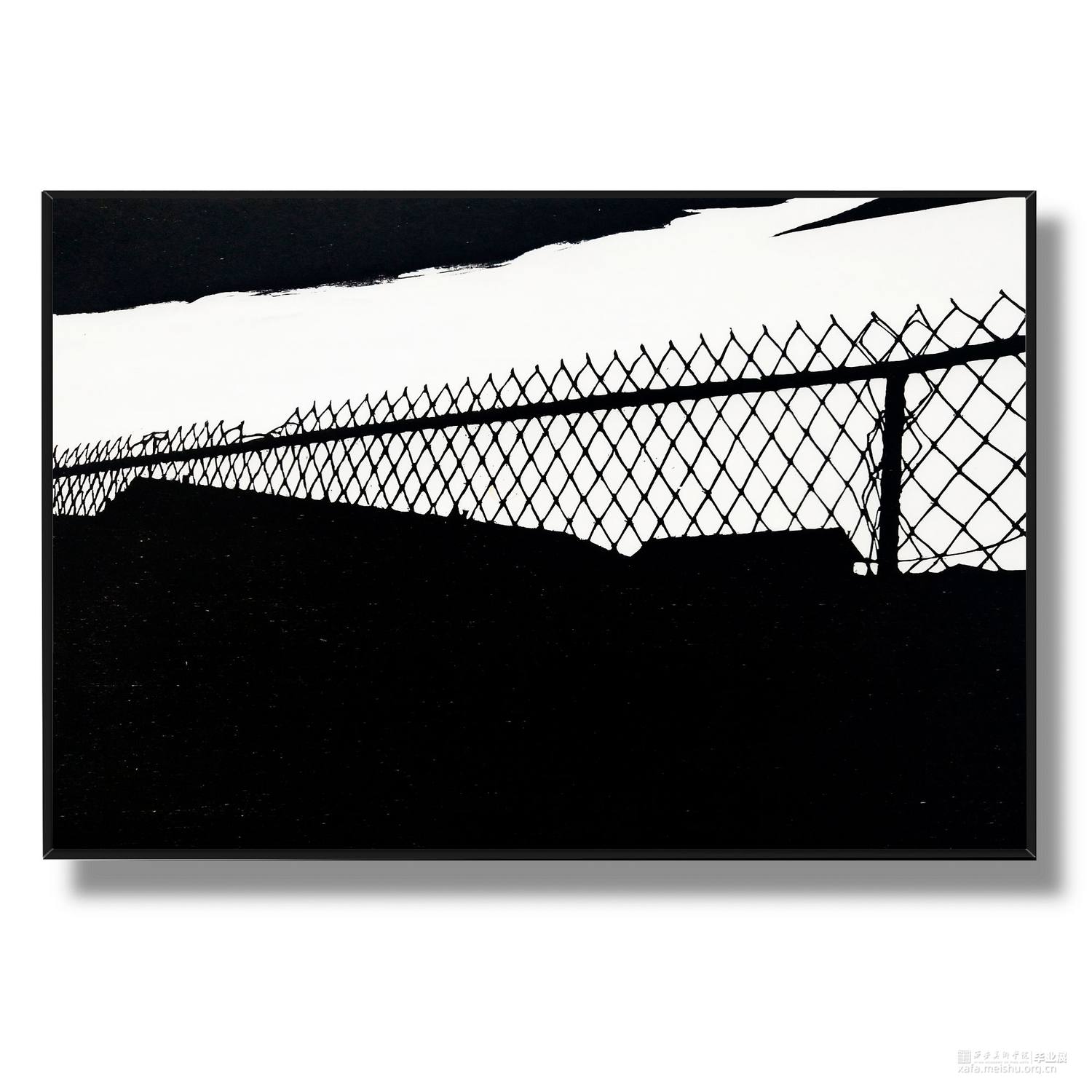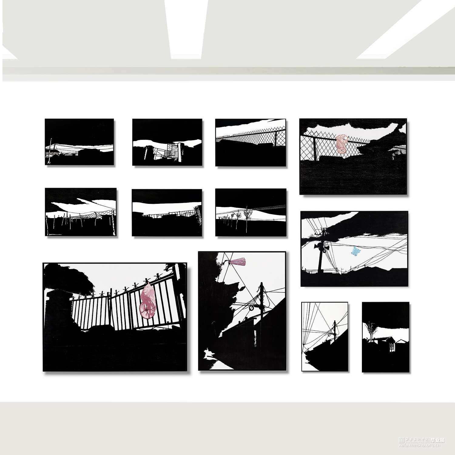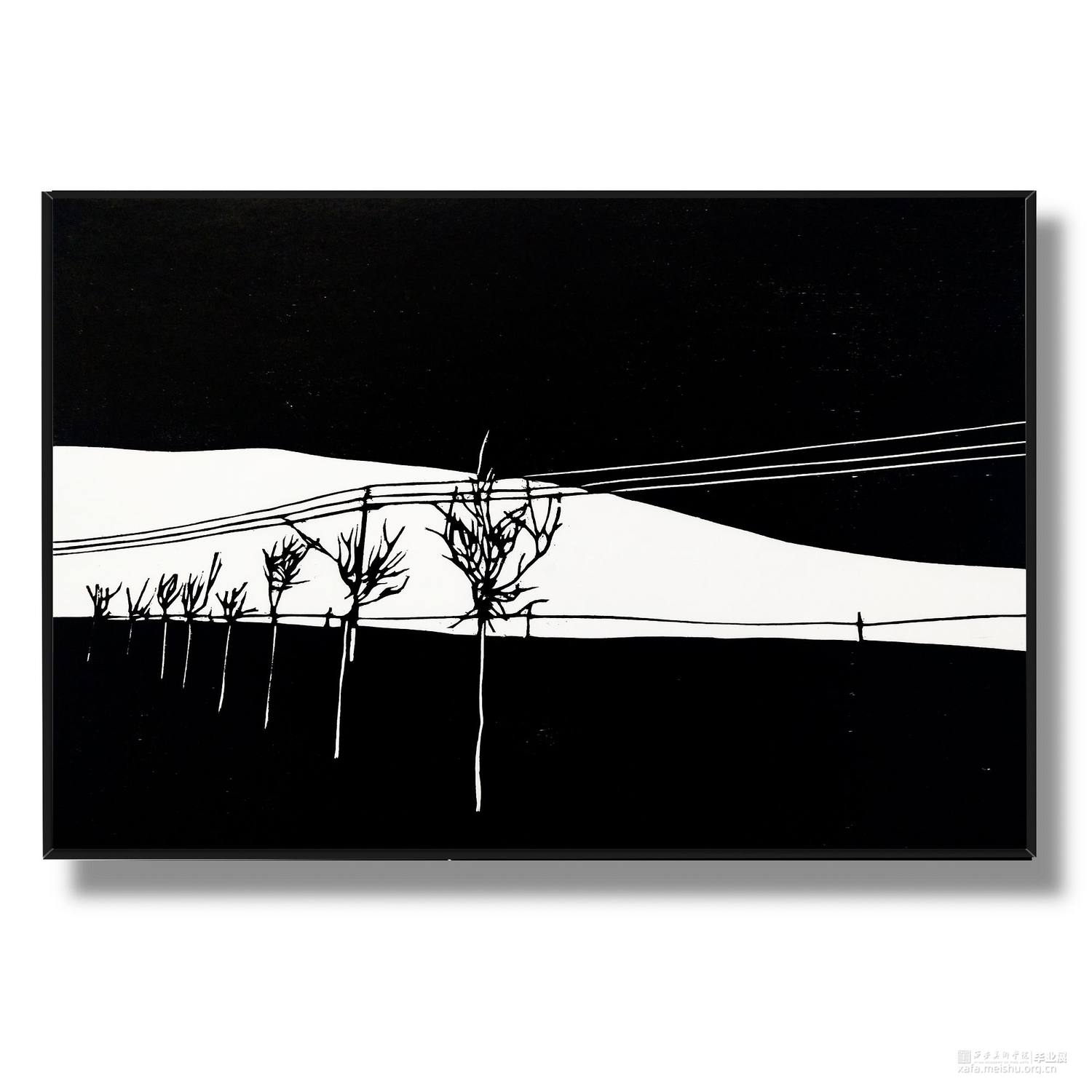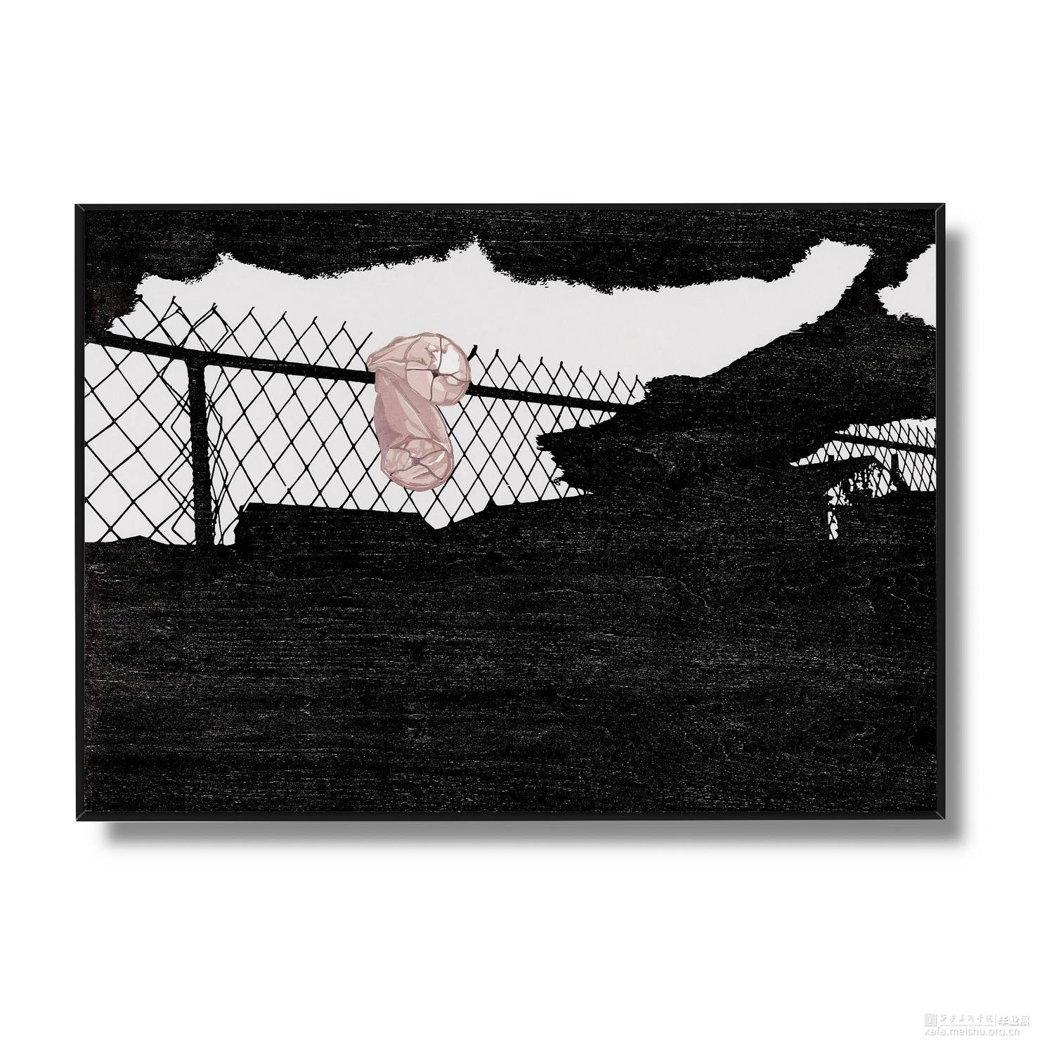 城市发展,旧房屋不断被拆,大部分房屋已经人去楼空,仅仅留下残缺的时间痕迹。村民搬离农村去往城市生活,昔日的生活气息消失不见。在我的生活环境中,通过作品与当下社会变迁发生互动,拆迁的废墟转换为超现实主义社会空间,以一种特殊定义去表达内心对昔日生活的憧憬。时间记忆让自己对乡村有了无数情感,而如今城市的街道、社区却不像家一样温暖,也让往日的生活变成了永恒记忆。作品由4幅《墟境》和8幅《场景》两部分构成,从绘图、雕刻到印刷完成,让刀与板之间达成了共识,让作品在一种平凡的绘画语言中充满艺术活力。《墟境》系列以黑白场景为主及单景套色为辅,通过捕捉生活现场,例如悬挂在电线上的垃圾袋、铁丝网上的孔明灯、树枝上的风筝等,以不同场景施加不同图像效果;《场境》系列是整体创作的另一部分,通过天气的变化和乡村场景发生互动,光影与地面浑然一体。其次手机拍摄,现场重新分割组合,分为上、中、下三段,中段的房屋建筑与天空形成一条天际线。两部分作品以强烈的黑白分割对比,营造出一种超现实主义空间。这不仅是一幅画,也不是简单的黑白废墟图式,而是一种对乡村废墟的记忆表达,让观众感受作品内的时空交错,走进的一瞬间便有所触动,虽然只有一瞬间,但已经达到我的目的。