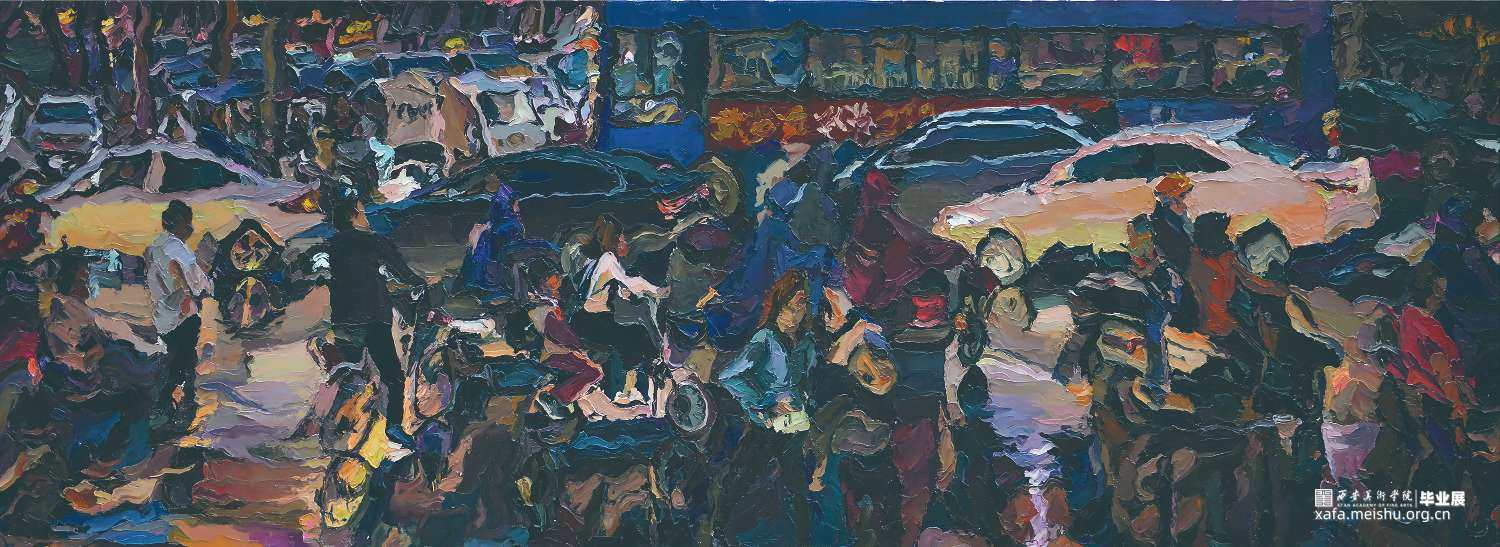 长期以来自己生活学习在城市,城市作为现代文明产生的母体,历来被艺术家所关注,其本身饱含的“历史”和“地域”文化属性也涉及到社会学等多个学科范畴,选择现代都市作为表达对象,就是试图表现在这一个特定的“场域”,人们的生存现状和发展节奏。一直以来的创作实践都是以刮刀、色彩、笔触、肌理等视觉信号为媒介,力图给观者带来独特的视觉体验,或接近自己对都市文明的认识感悟和表达。