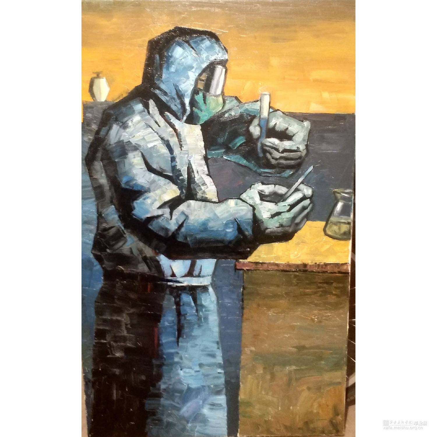 作品《抗疫战士》创作于2020年2月。2020年春节,中国乃至世界被新型冠状病毒所笼罩,各个地方的医生、护士汇聚前线,在前线抗击疫情。作品描绘一位医疗研究人员在不断的进行对病毒的疫苗实验,希望早日能够恢复日常生活,平息疫情。