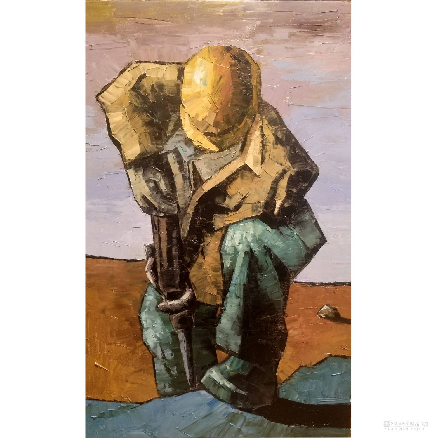 作品《大地母亲》以一种偏远藏区一位母亲的形象来代表类似于同样儿女在外务工,家中老母亲思念儿女,为儿女祈福的形象。老母亲跪坐在土地上低头闭目,荒凉的背景和压抑的色调,使得这位空巢老人多么希望见到自己的儿女,也为他们在外祈福平安。也从另外一种形式表现出许许多多的外出劳动者同样都有各自在家思念的亲人。