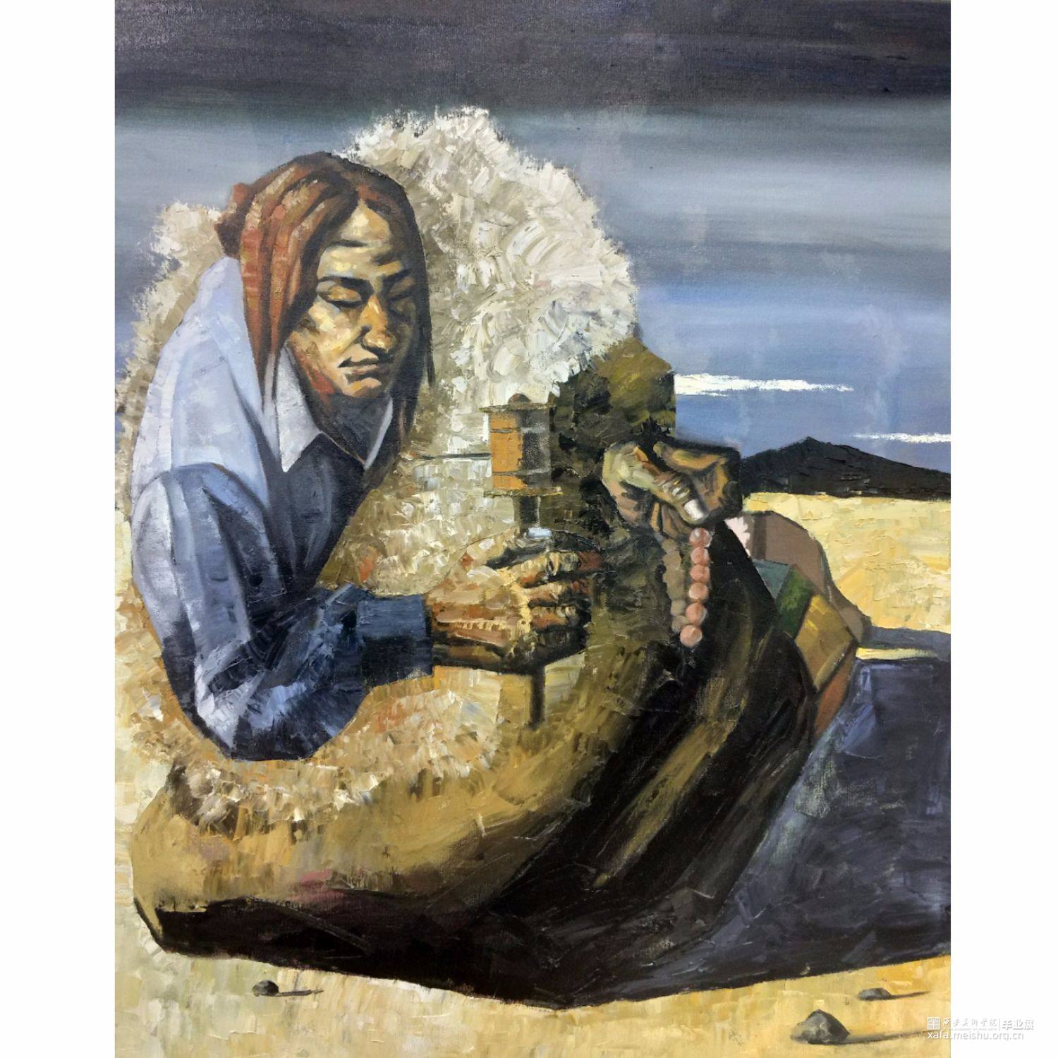 作品《大地母亲》以一种偏远藏区一位母亲的形象来代表类似于同样儿女在外务工,家中老母亲思念儿女,为儿女祈福的形象。老母亲跪坐在土地上低头闭目,荒凉的背景和压抑的色调,使得这位空巢老人多么希望见到自己的儿女,也为他们在外祈福平安。也从另外一种形式表现出许许多多的外出劳动者同样都有各自在家思念的亲人。