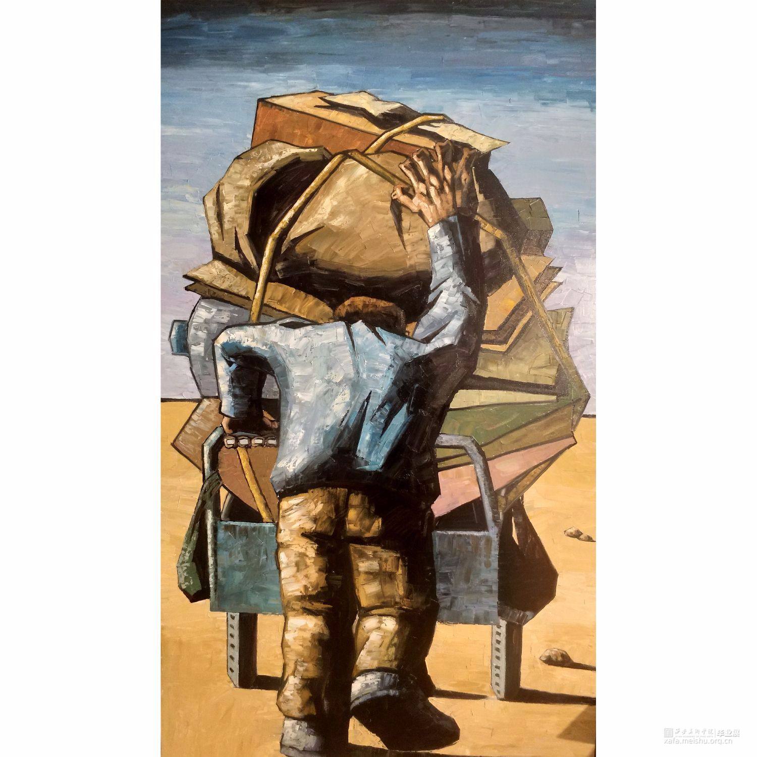 作品《拾荒者》讲述了拾荒者在城市中收集废弃的纸板、塑料瓶、以及大部分人们不要的废品,在收集了满满一车,上坡路段,拾荒者不得不下来推着自己一天的“成果”。背影中拾荒者疲惫不堪,右手扶着废品,左手推着车,步履蹒跚。表现了劳动者为自己的生计,自力更生。