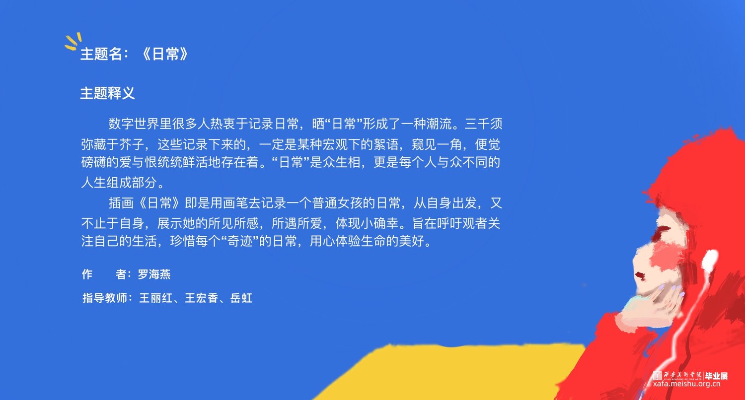 数字世界里,很多人都热衷于记录日常,晒“日常”变成了一种潮流。本次毕业作品《日常》即是用画笔去记录一个普通女生的日常,展示她的所见所感,所遇所爱,体现“小确幸”。旨在呼吁观者关注自己的生活,珍惜每个“奇迹”的日常,用心体验生命的美好。