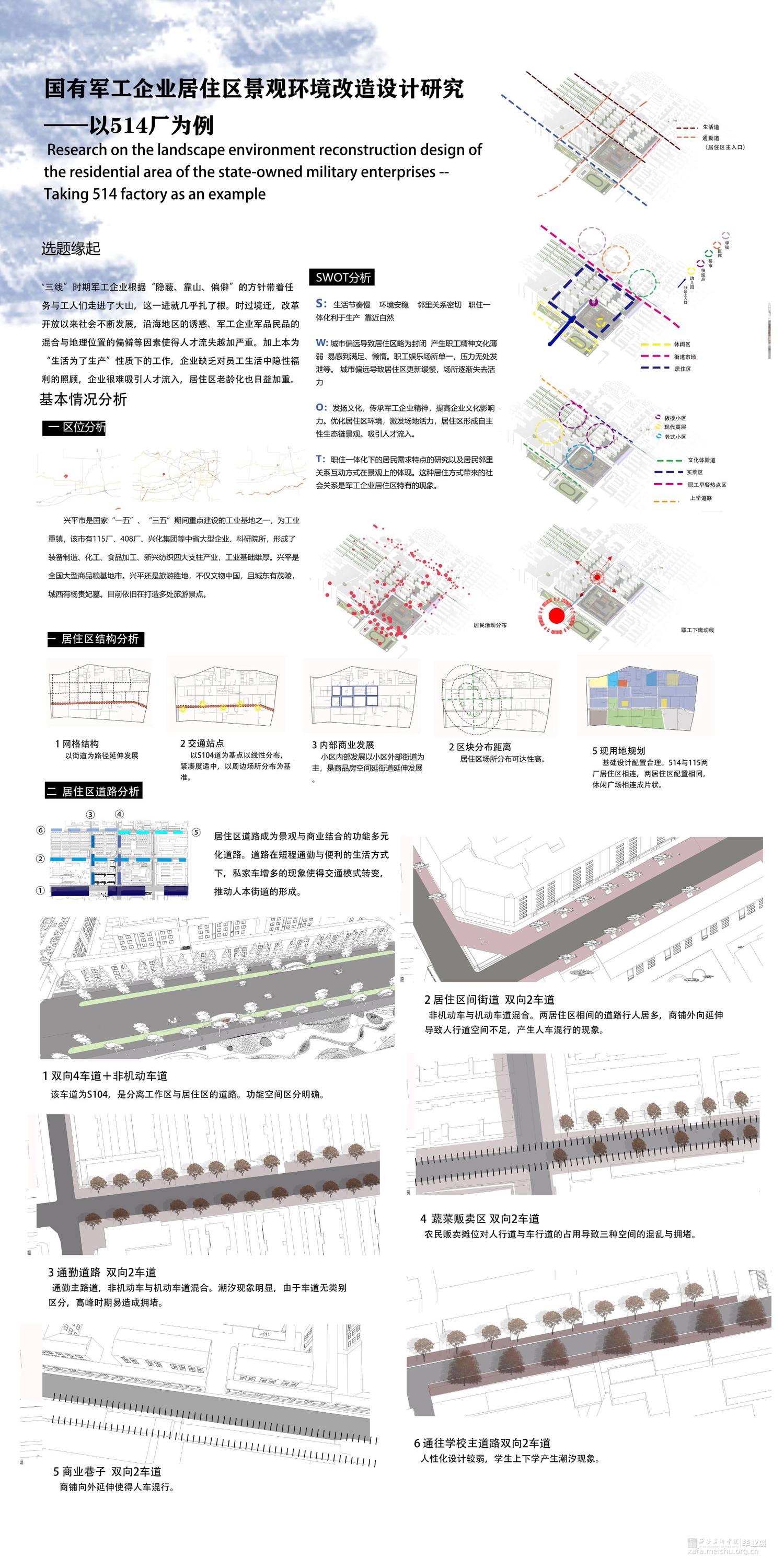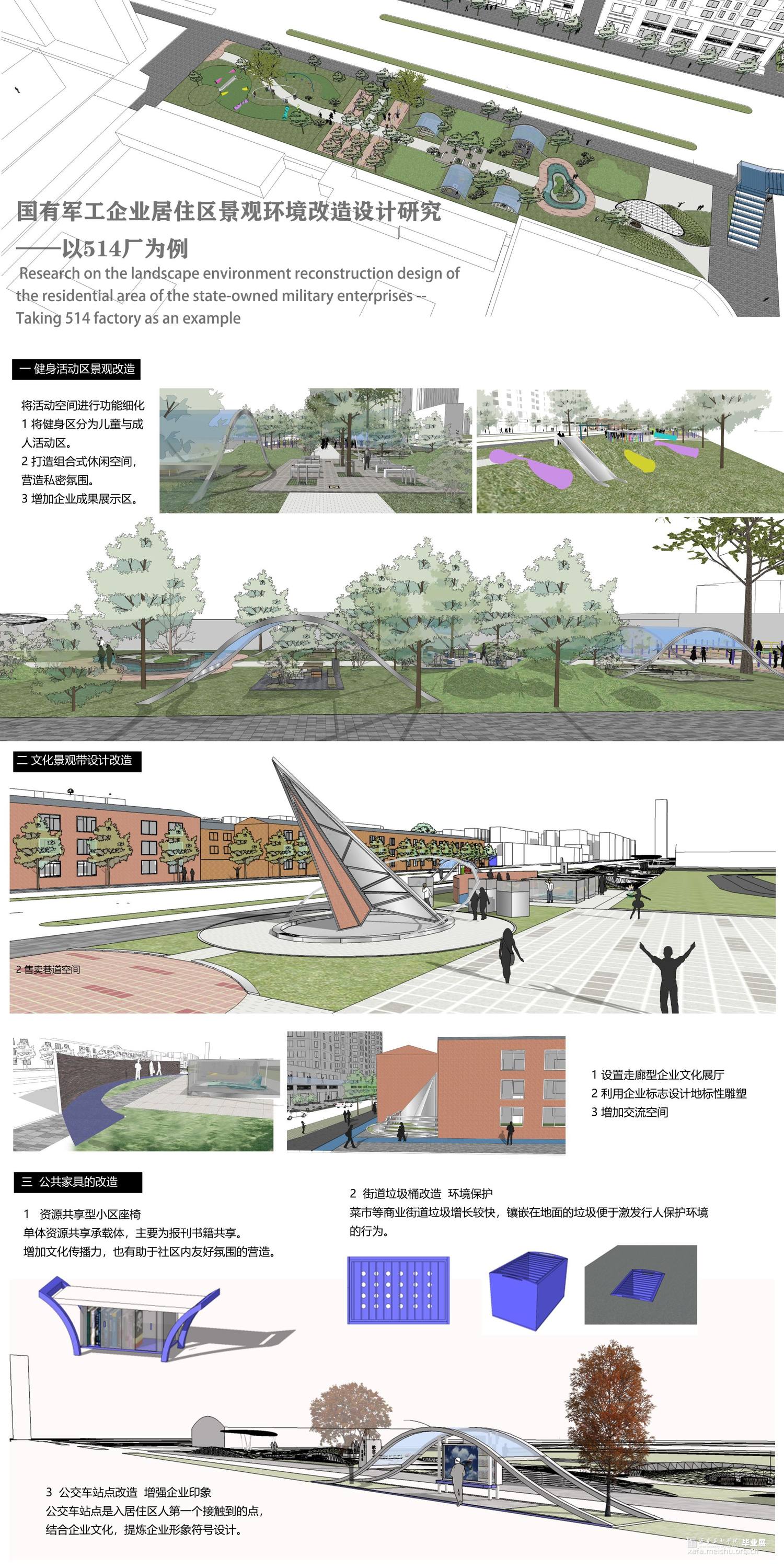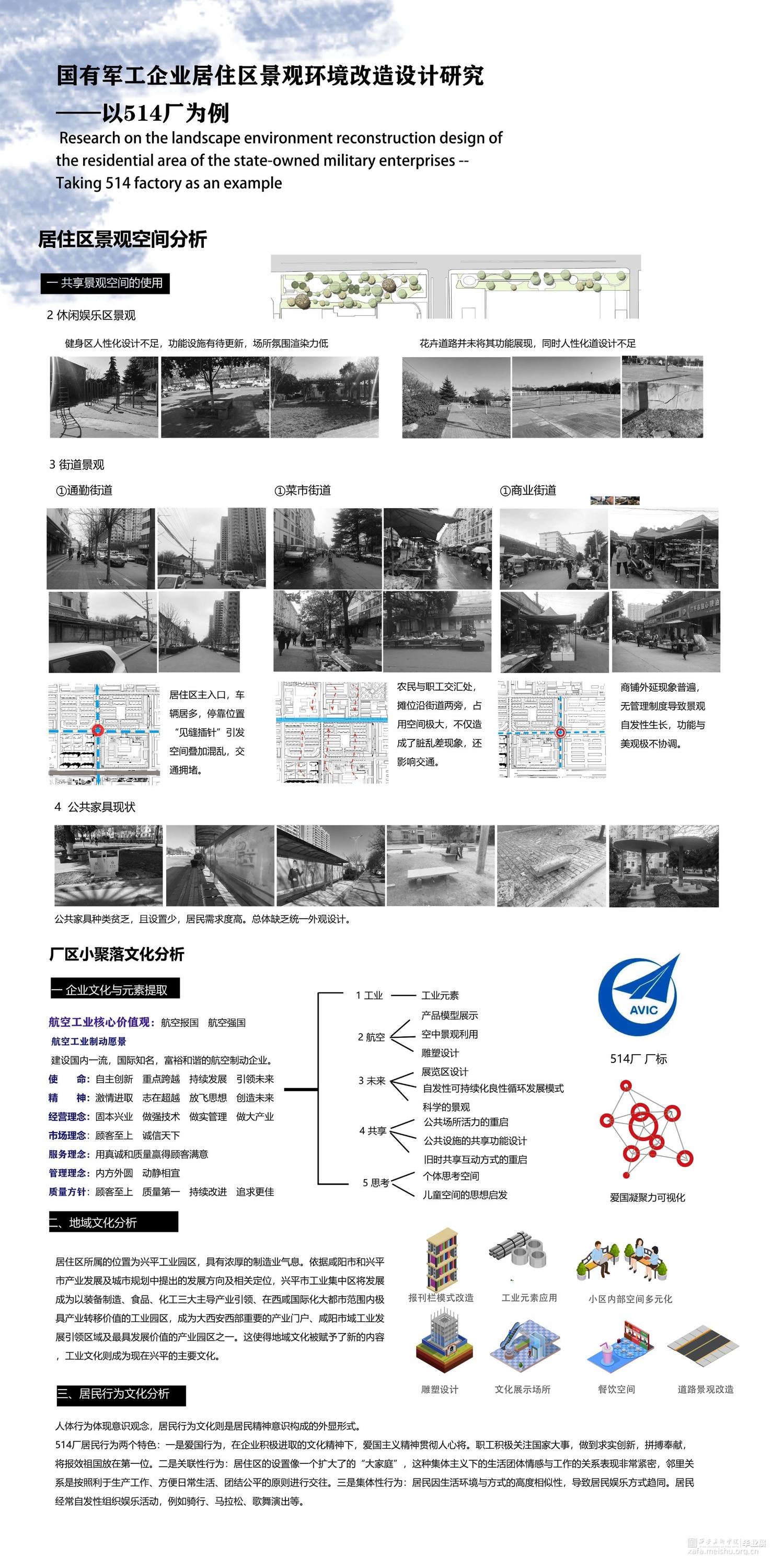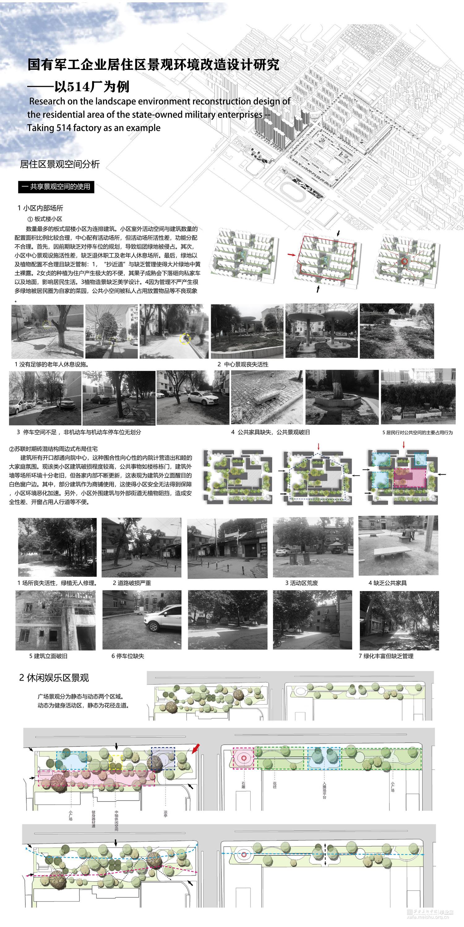 国有军工企业在建国时代初期就担负着民族振兴的重要角色,是我国发展的坚实后盾,改革初期国家为实现工业现代化设工业基地进行重点培育,工业区内配套建设一批又一批职工住宅区,形成独特的居住区类型。目前我国处于“双重转型”的关键时期,市场经济体制的改革、经济与科技的高速发展、产业结构的调整、住民生活方式等多方面的变革使越来越多的问题出现在军工企业居住区景观中,而通过调整居住区空间利用率,改造居住区景观配套设施都可以为其注入新的活力。兴平市属于陕西省军工厂设立最早的区域之一,极具研究典型作用。论文从国有军工企业住宅区发展和现状出发,本着“以人为本”的设计原则,以职工生活为重点对居住区提供景观环境改造设计,分析列举厂区居住区景观环境现存问题,结合国内外对居住区景观设计相关理论和方法,因地制宜的对其进行景观环境改造。