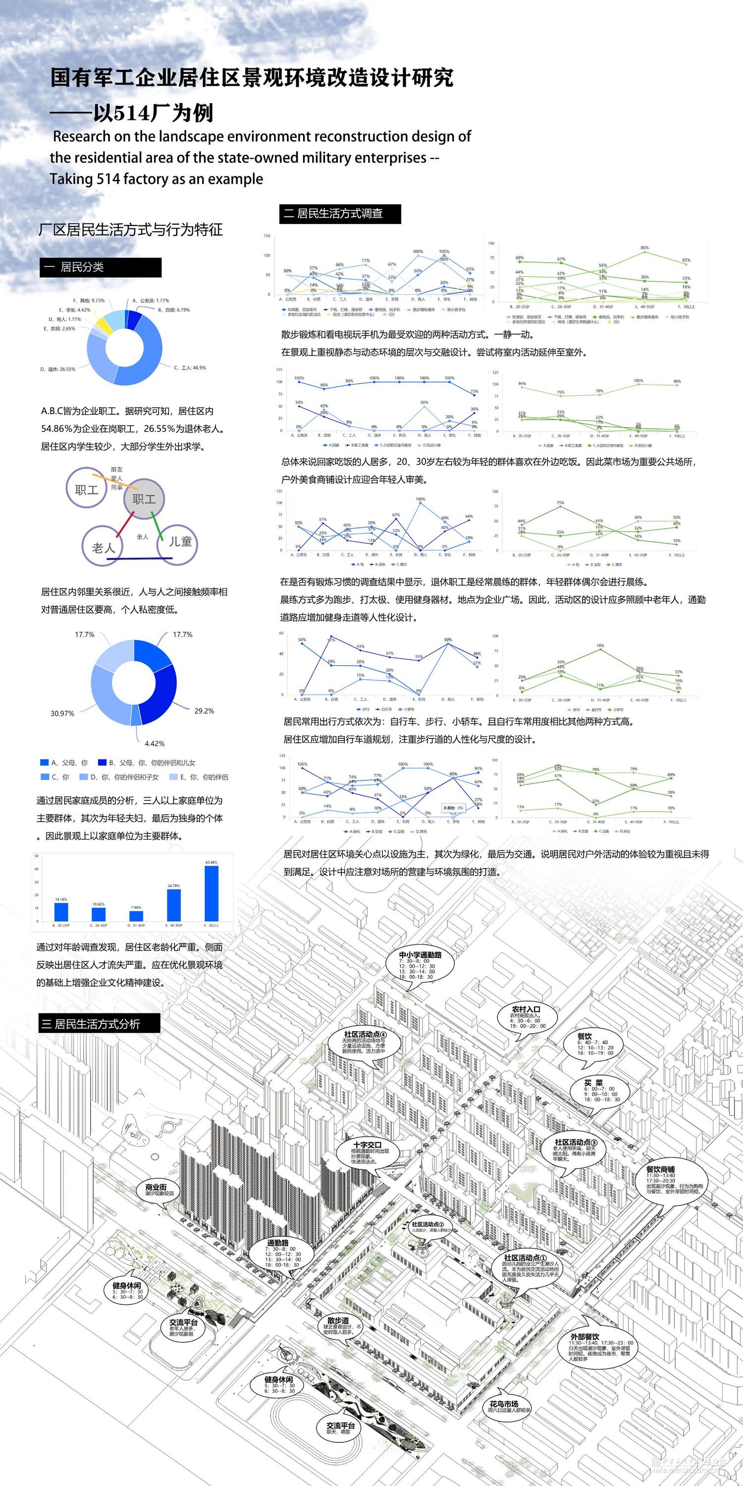 职住一体化下的居住区设立本意为“为了生产”,如今伴随军工企业的变线与社会的发展,居住区设计应更注重景观氛围渲染中的个人体验。找不同空间的定位,对其进行改造。