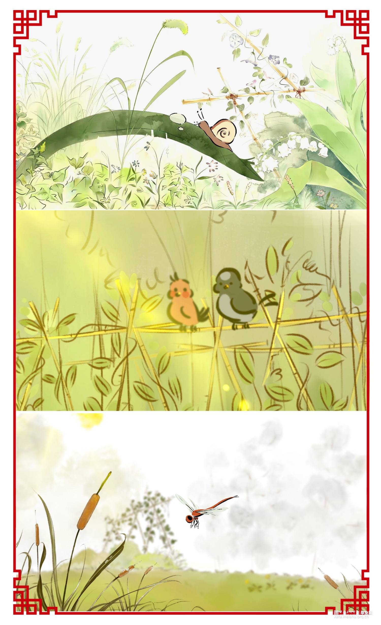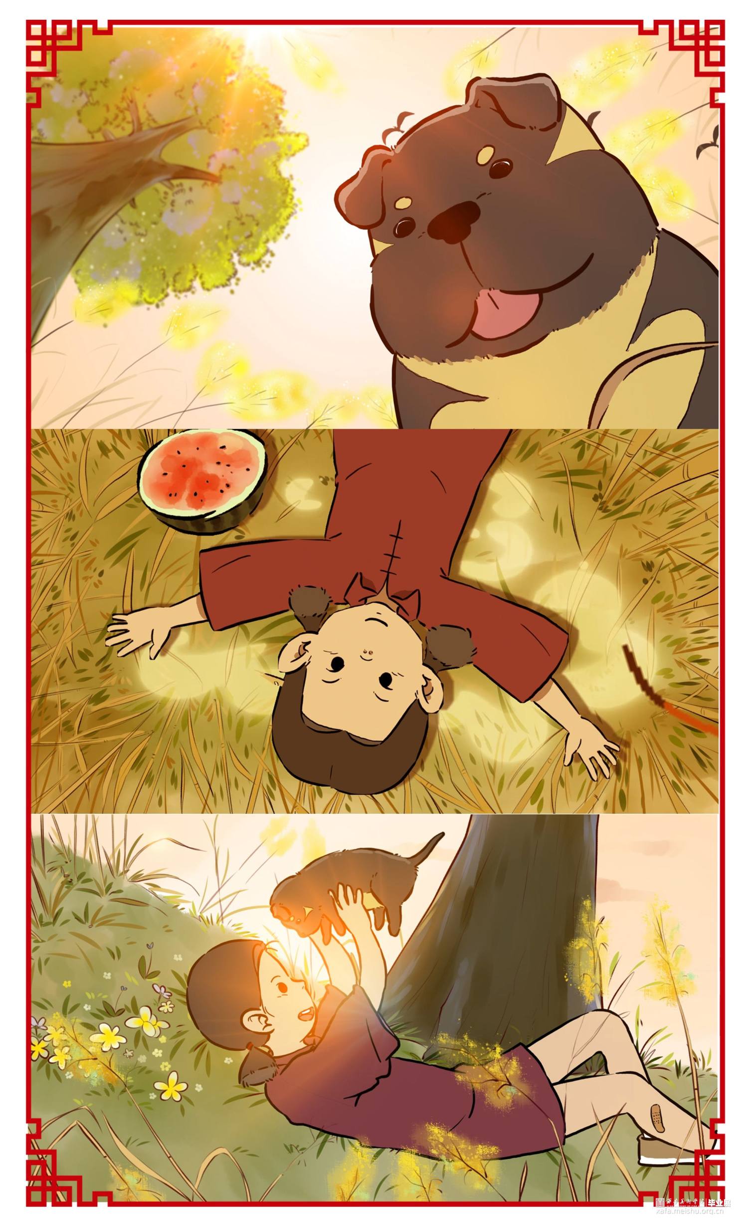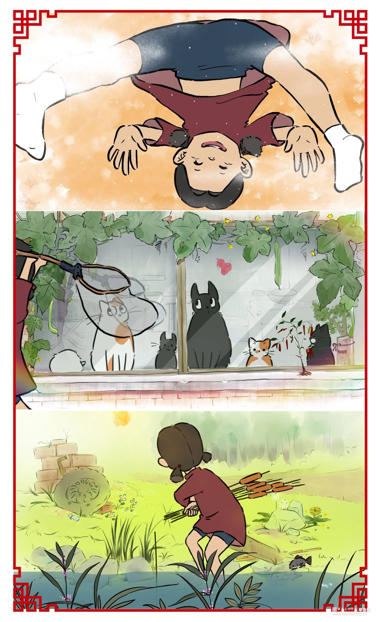 这是一个比较温馨平淡的动画。讲的是我的回忆里我认为的值得怀念的事情。动画中出现的动物角色都是自己养过的,是陪伴过我的小伙伴。我用动画的方式将他们记录下来。故事内容由一件件生活中的小事情串联起来:比如调皮的猫、跟屁虫似的小狗、用柳枝变的花环、一捏就炸毛的香蒲、运冰棍的小货车……虽平淡却很值得怀念!动画以一天的时间作为顺序:早晨——中午——日落——夜幕,这种时间的流逝会在场景中体现出来。