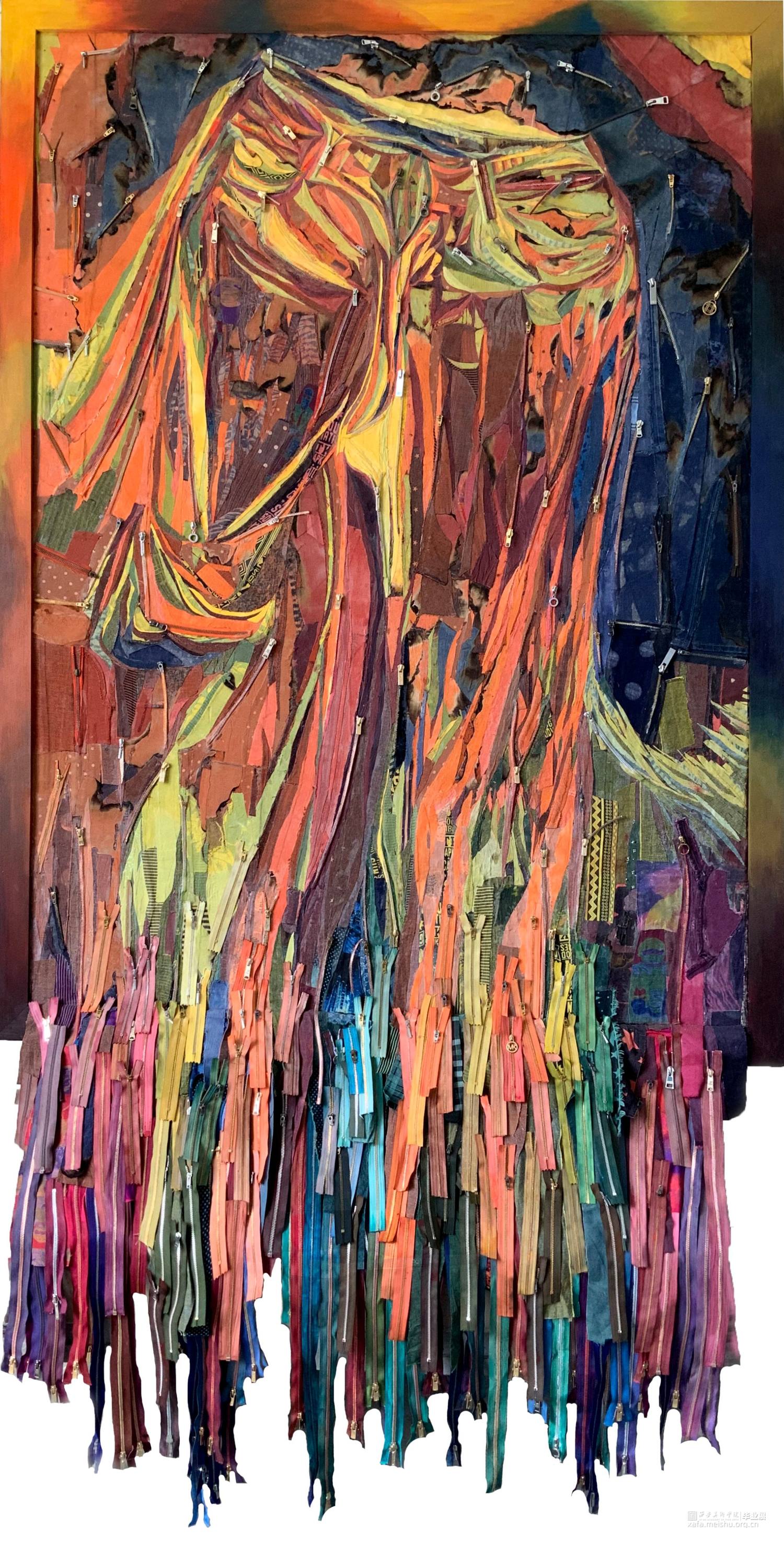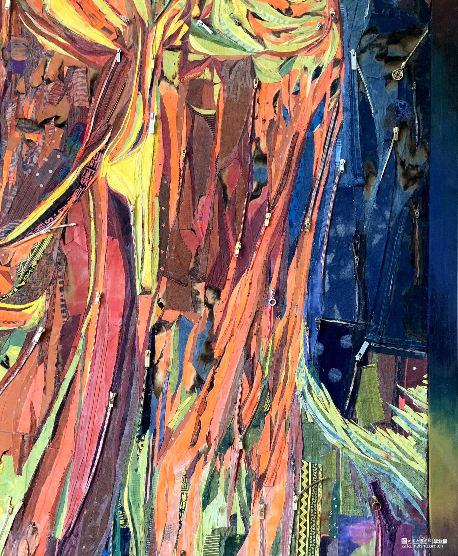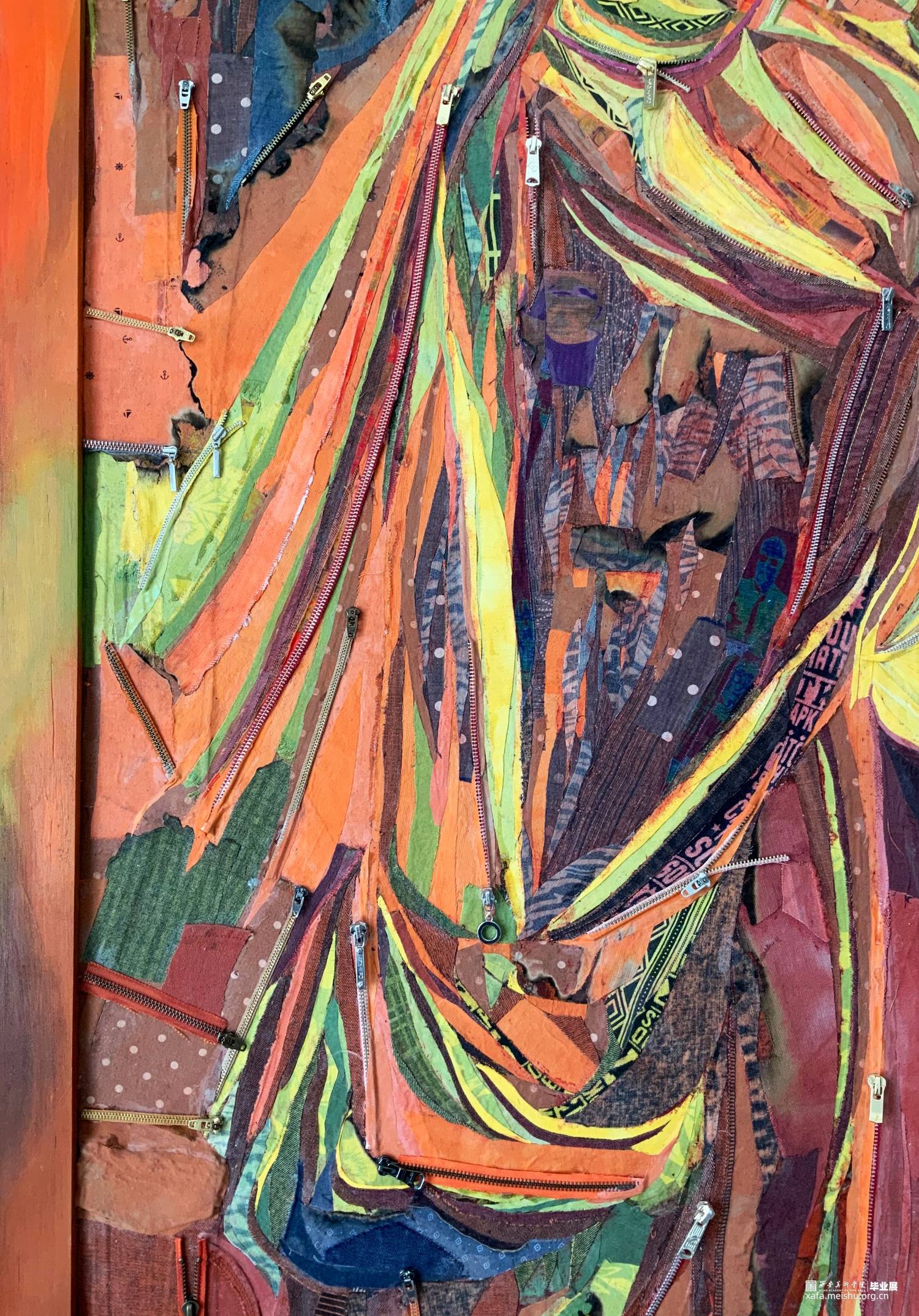 该系列作品表现主题为“温度”,作品《都市幻象·扬》中以牛仔裤坚韧挺拔的质地以及用牛仔布来塑造牛仔裤的意象形态,以此作为身体的象征性符号来隐喻“温度”,也隐喻和映射了城市中的冷和暖;作品《都市幻象·采》画面中主体的形态是以直立高筒靴子为原型,它不仅作为包裹身体的承载物,而且是身体的支点和行走的推动力量,以此作为身体的象征性符号来隐喻“温度”。