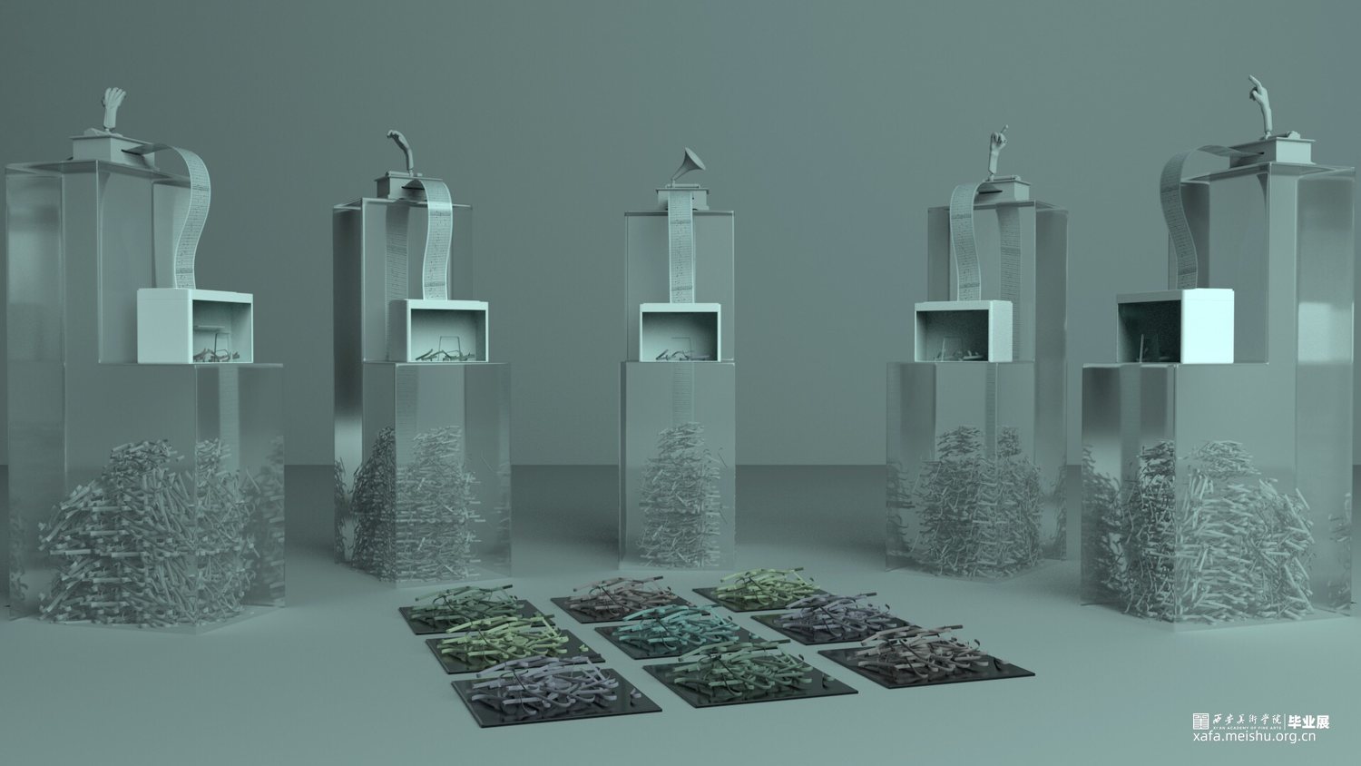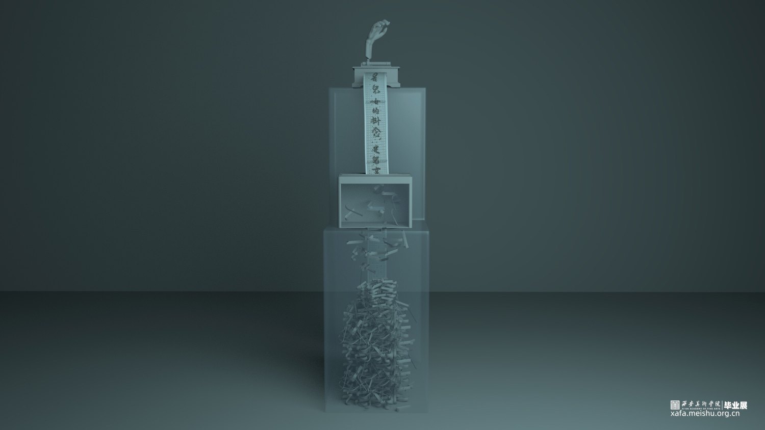 作品以八音盒和碎纸机这种日常物件为作品的主体材料制成联动装置,八音盒上方转动的为“爱”与“陪伴”的手语。作为一种内在的陈情与表达,通过采访搜集留守儿童的日记、文章、信件、父母对子女思念、期望的话语,写于八音纸带上,当按动开关或者观者手摇音乐盒的手把时,纸带会从音乐盒的出纸孔中缓缓转出,在清澈透亮的八音盒乐声中,转出的纸带会连入碎纸机渐渐粉碎至透明的亚克力展台中,随着时间的流逝纸带越来越短,透明展台盒中的纸屑也越堆越多。在这件作品中用