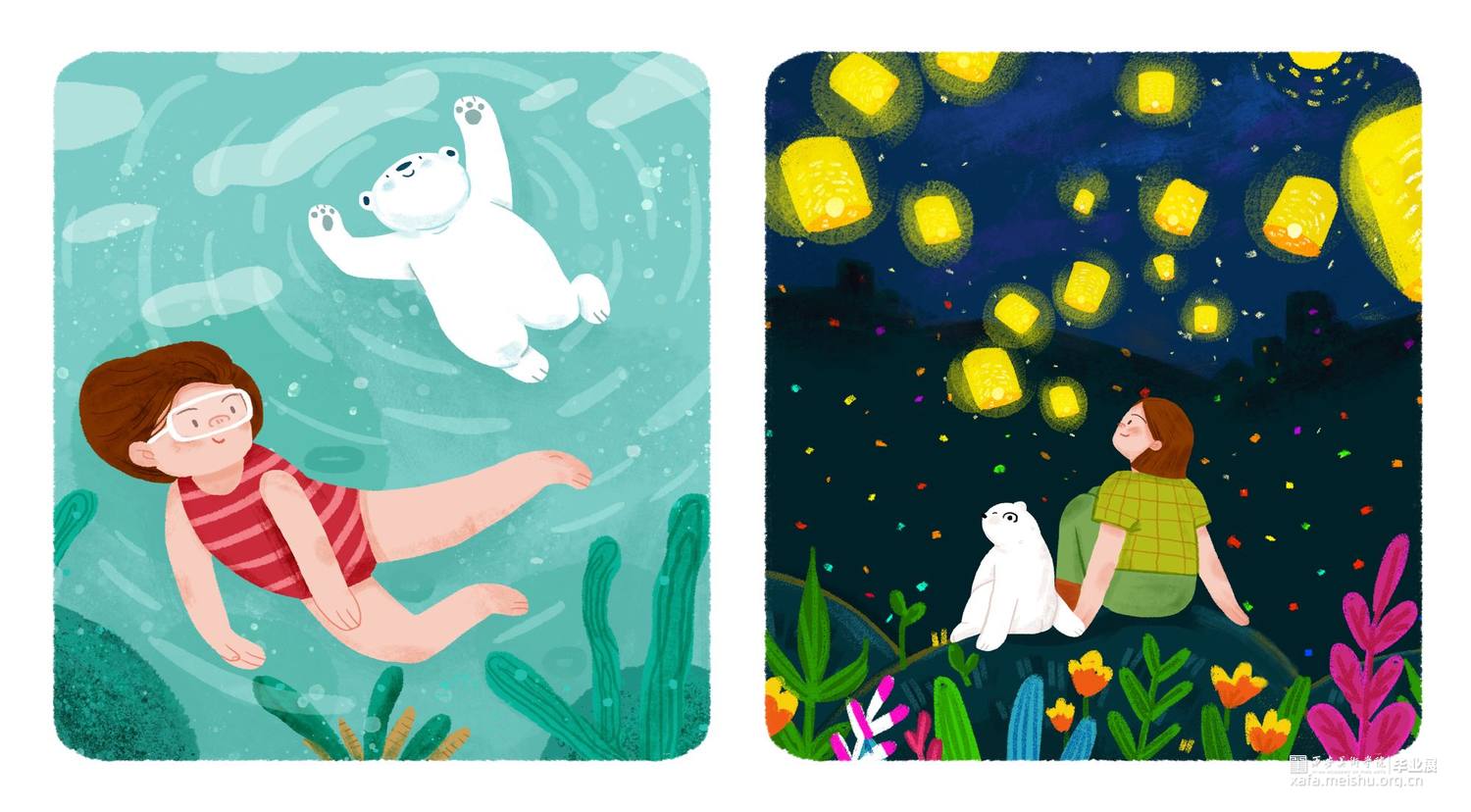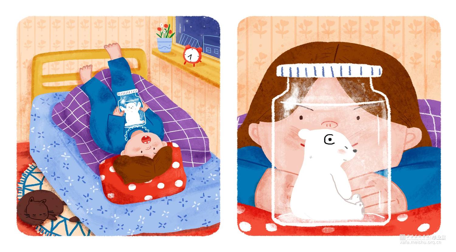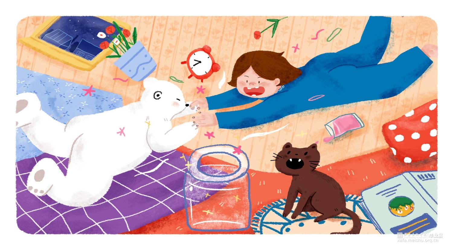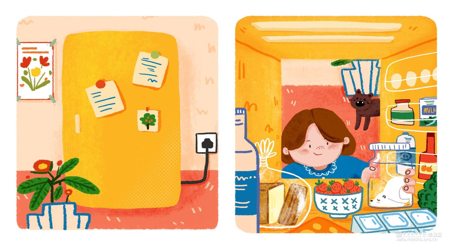 如果北极熊生活在冰箱里,那么免不了要与人类有所交集,以小女孩和储藏在冰箱中的北极熊为主角,描绘一个“我”和一只储存在冰箱中的北极熊一起玩耍的生活场景的系列插画。该作品想通过画面的呈现,呼吁大家保护动物,珍惜身边的每一种小动物