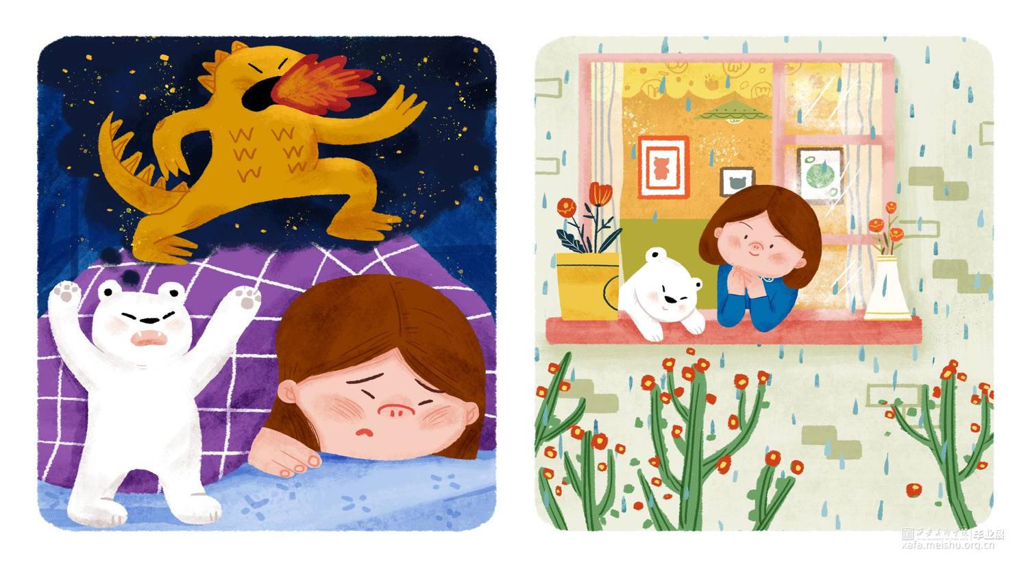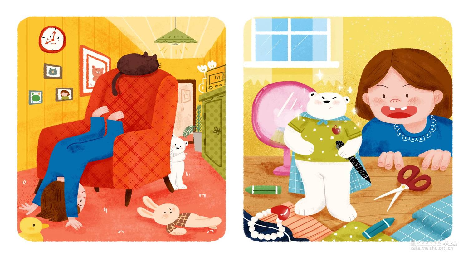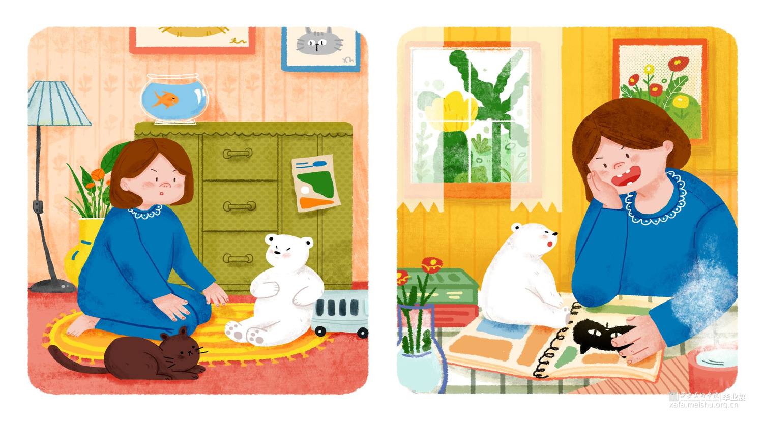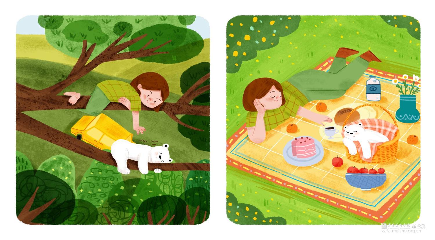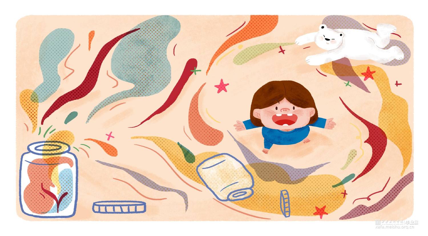 如果北极熊生活在冰箱里,那么免不了要与人类有所交集,以小女孩和储藏在冰箱中的北极熊为主角,描绘一个“我”和一只储存在冰箱中的北极熊一起玩耍的生活场景的系列插画。该作品想通过画面的呈现,呼吁大家保护动物,珍惜身边的每一种小动物