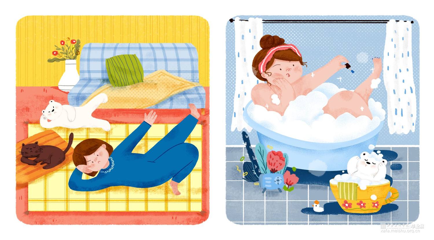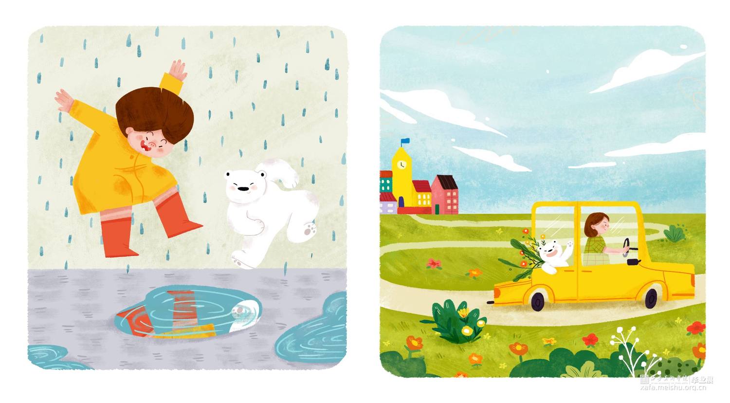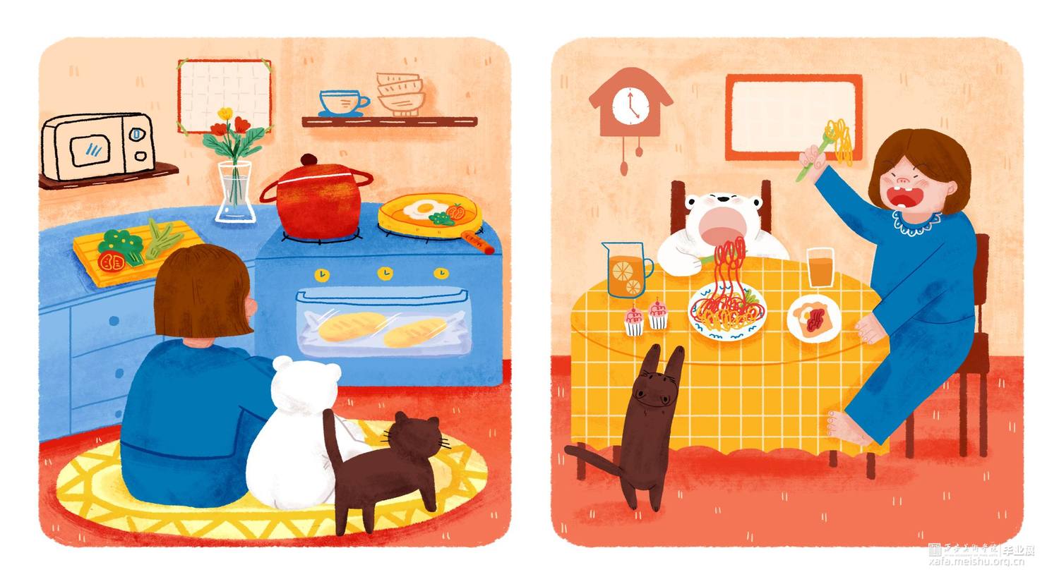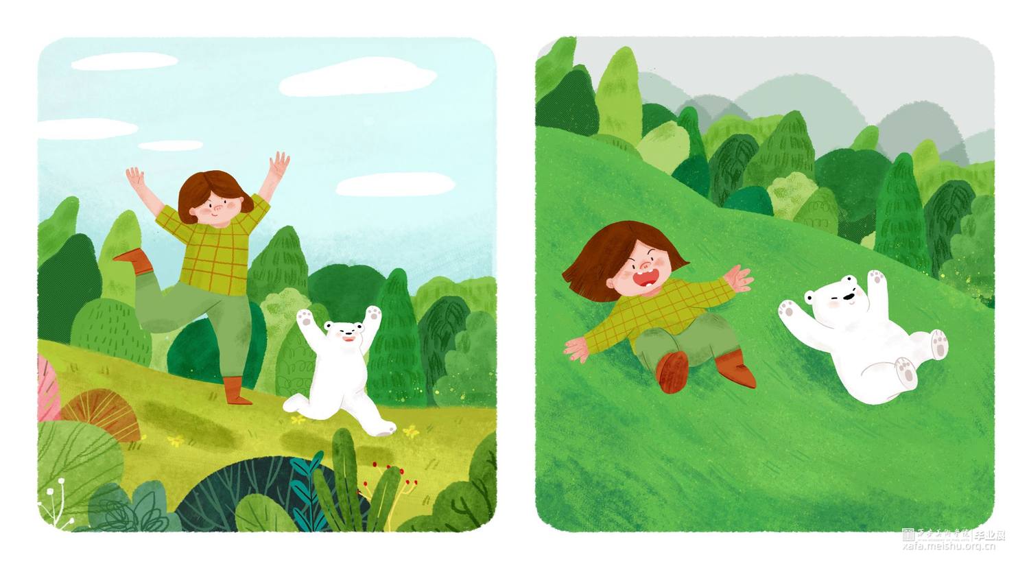 如果北极熊生活在冰箱里,那么免不了要与人类有所交集,以小女孩和储藏在冰箱中的北极熊为主角,描绘一个“我”和一只储存在冰箱中的北极熊一起玩耍的生活场景的系列插画。该作品想通过画面的呈现,呼吁大家保护动物,珍惜身边的每一种小动物