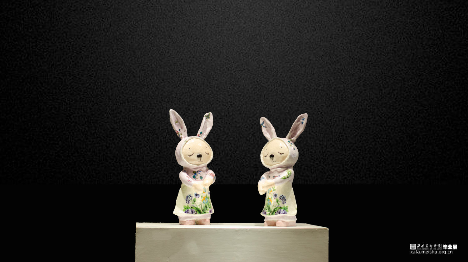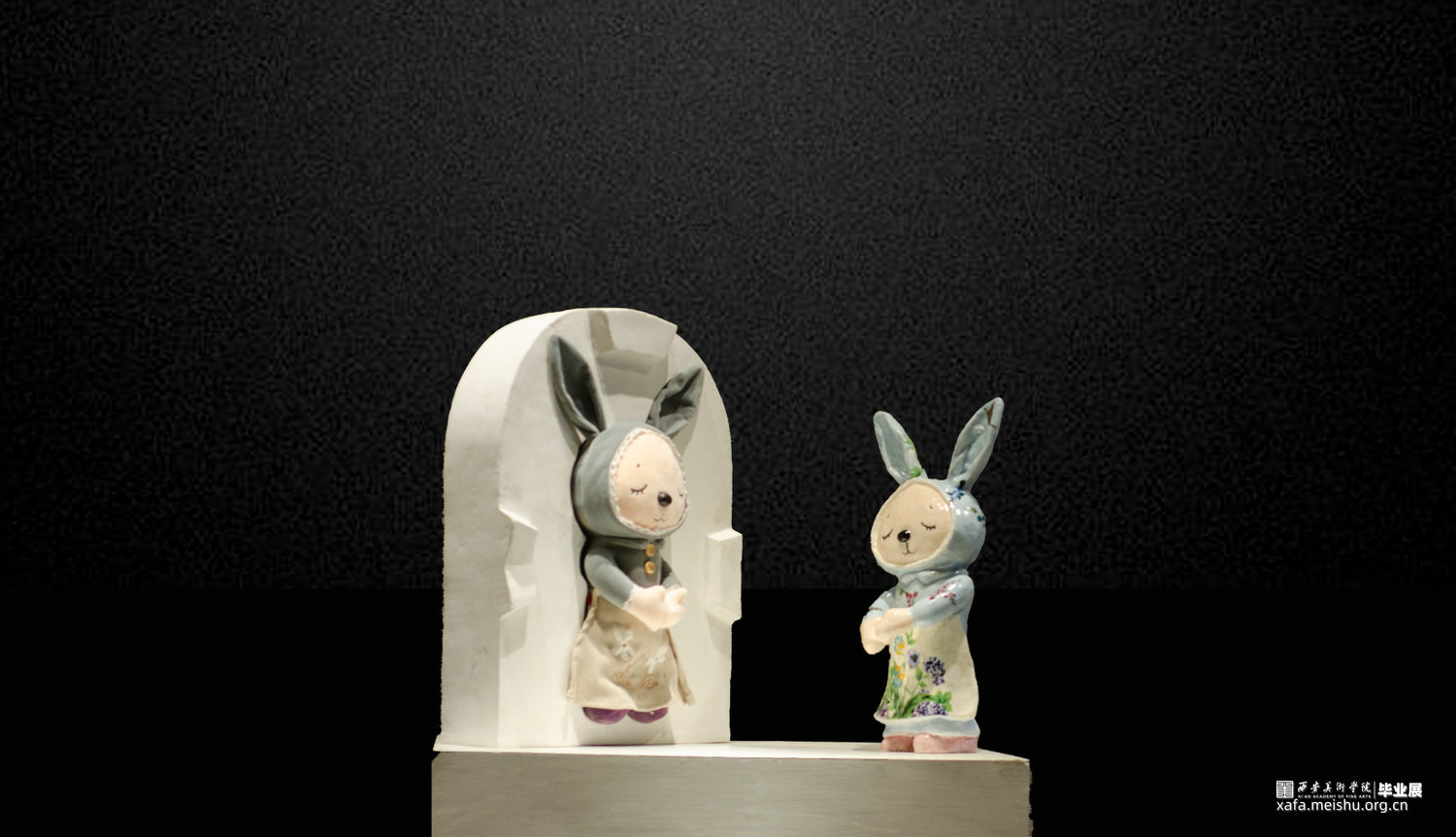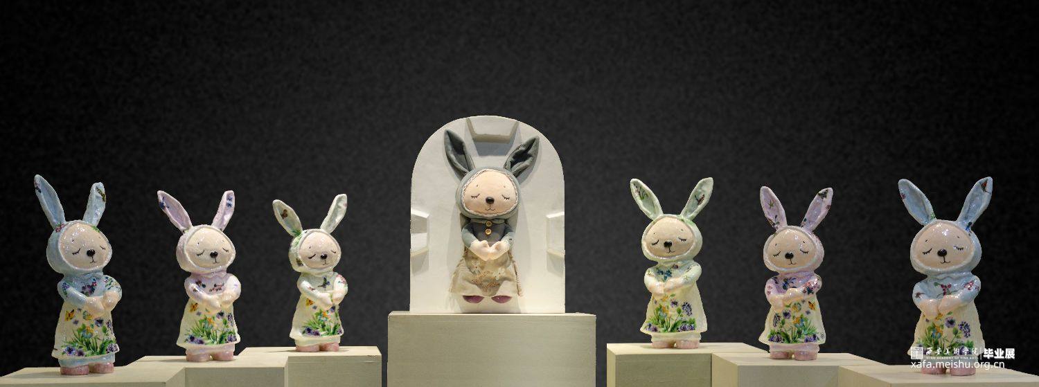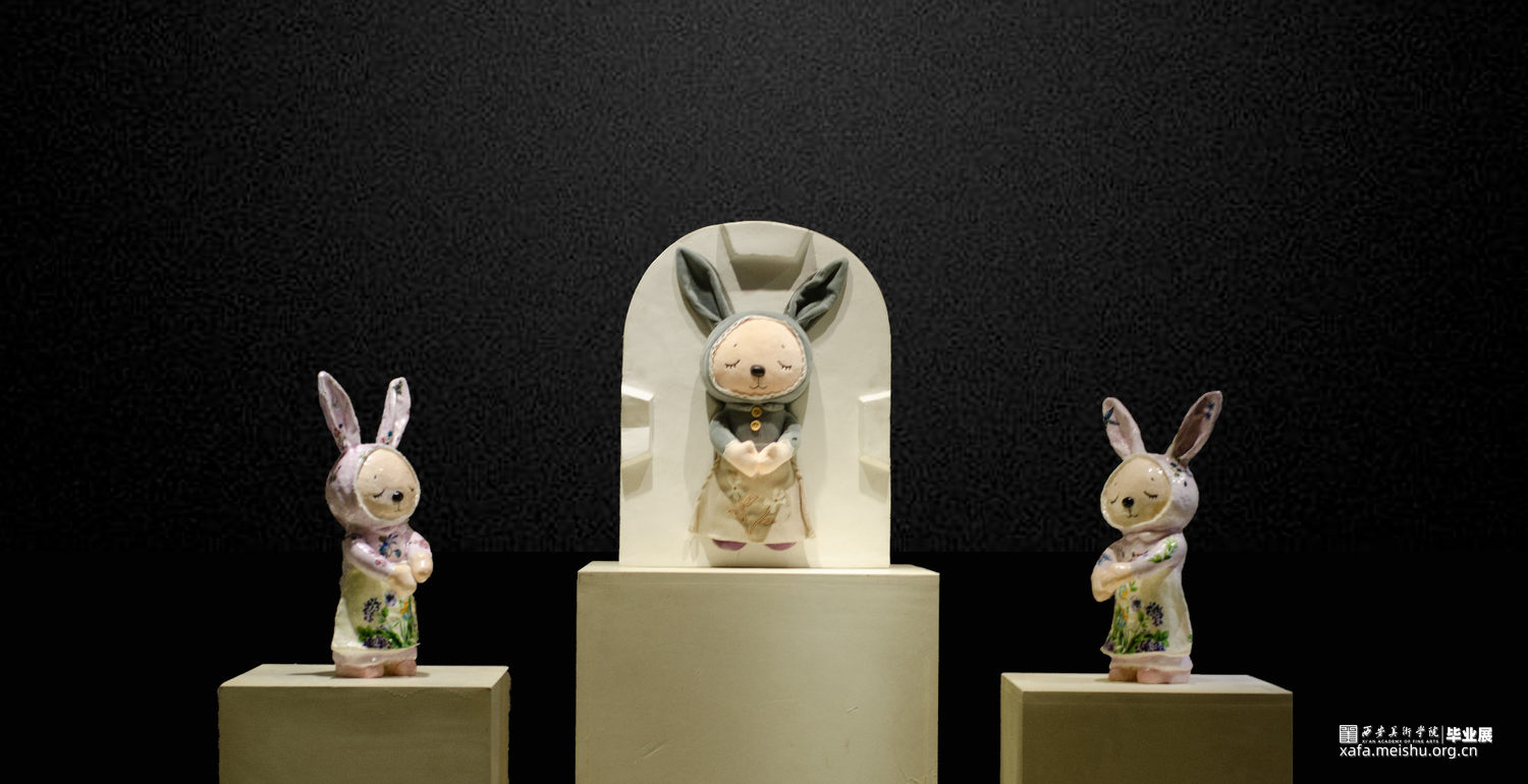 受突如其来的新冠病毒肺炎疫情的侵袭,无形中增多了孩子和父母相处的亲子时光。在毕业作品的创作期间,创作思路也有所转移,除了每天关注疫情势态的同时,也在思考能否从父母和孩子关系的角度进行创作。由于和父母朝夕相处,对父母与子女的关系也有了更深的认识,慢慢萌生了《复刻》作品的构想。最初只想通过翻制模具,从而复制陶瓷布偶来表现该主题,随着作品思路的逐渐明朗,除了“复刻”布偶外,把“石膏模具”也转化成“陶瓷模具”,并在展陈形式上也有了更加完善的呈现。