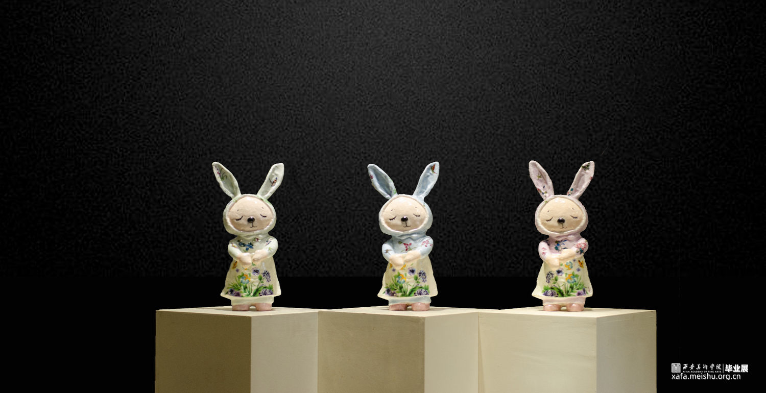 作品《复刻》,选题是基于父母对子女的付出、以及对生命延续的一些思考。一方面是对亲子关系的思考,也正是因为寒假以来,父母对生病的我无微不至的照料,让我除了体会到父母的艰辛之外,相互之间也有了理解与默契。另一方面是作品表现的手法,“现成品翻制”在陶艺或雕塑里应用的较多,但一般都是翻制完成后,作为母模的现成品原物,均会作为垃圾被破坏或者遗弃。但我的《复刻》作品把由于翻制模具需要,而遭到破坏的“布偶”重新重视,并且作为作品的一部分,连相关的石膏模具也转化成陶瓷艺术一并容纳进来,强化这种复刻的过程。让观者看到光鲜亮丽的复制品背后备受摧残的母型,这也更像是父母孕育孩子后,被岁月摧残衰老的过程,呼应作品的主题。