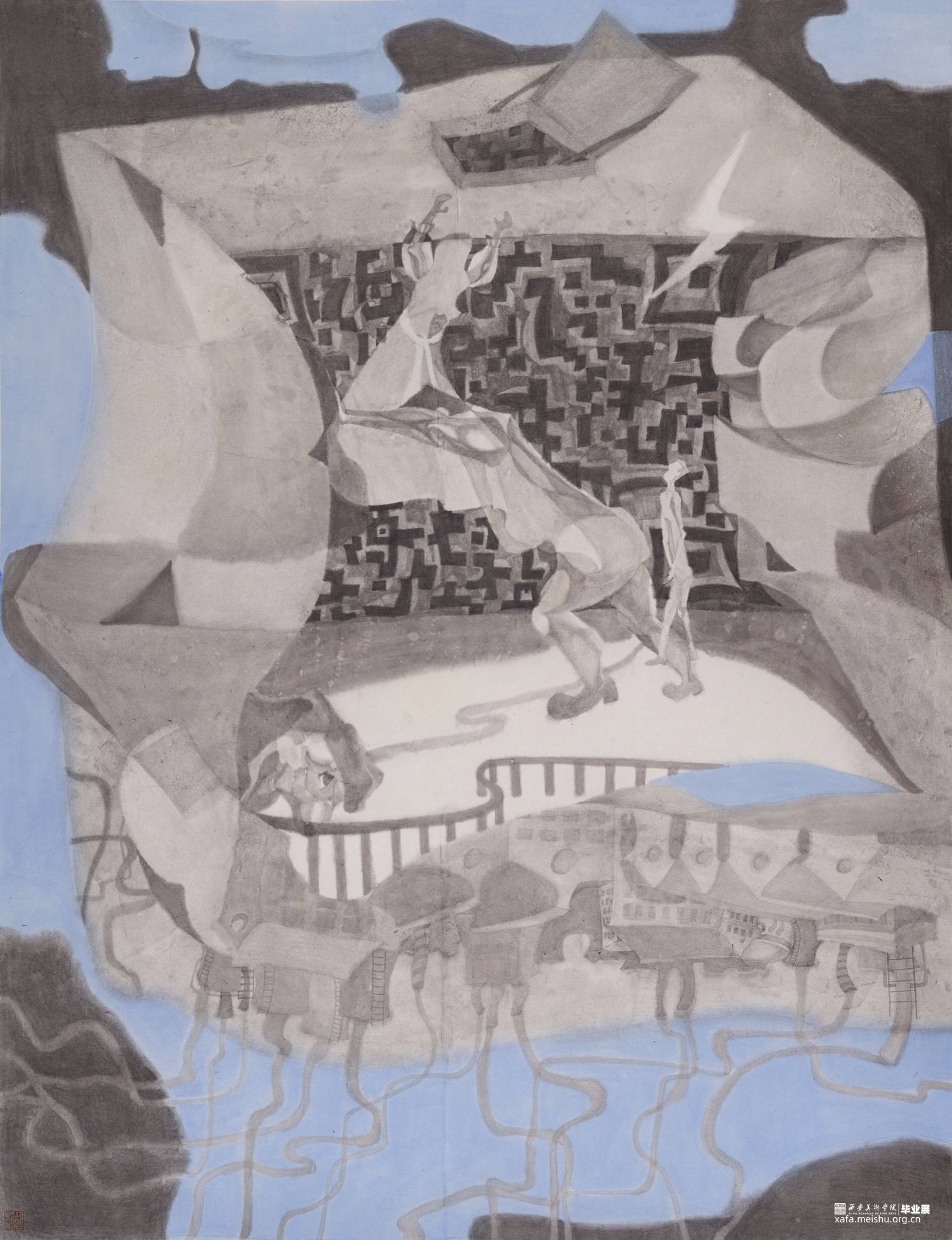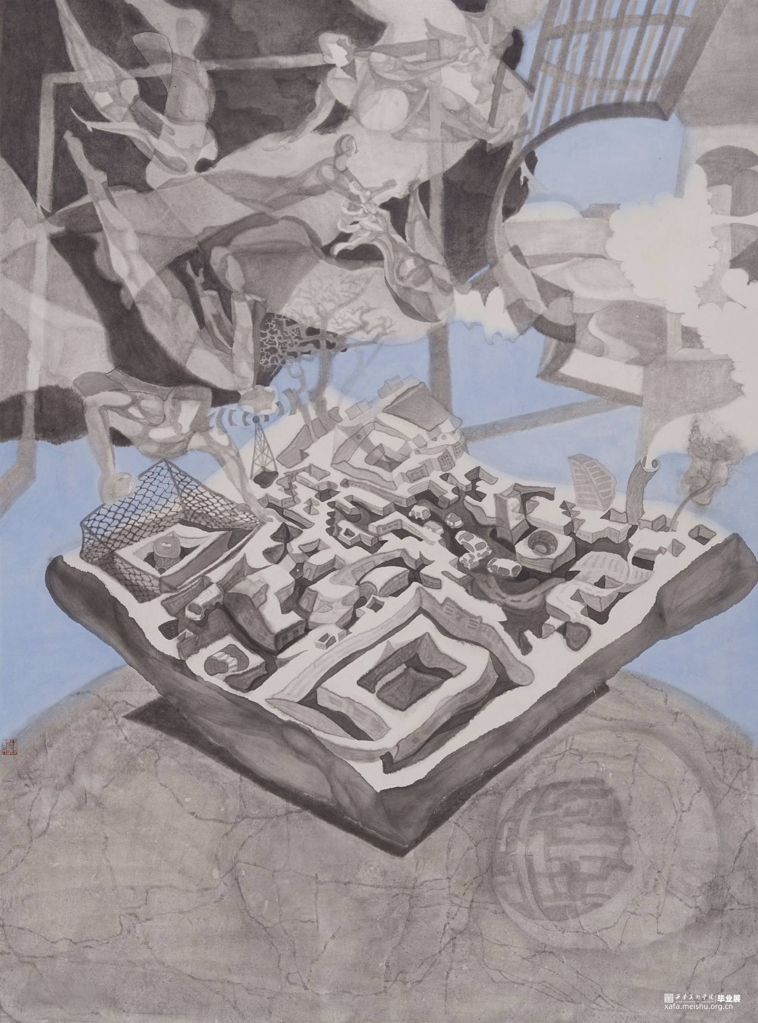二维码承载着当代人购物支付、验证身份、获取信息的生活方式,俨然成为当代生活不可或缺的一部分,《游与囿》系列正是基于这一现实的辩证思考。二维码带来的便捷使城市景观微缩,人们冲破空间桎梏,遨游于天际,与此同时,二维码作为手机的缩影,挤压着当代人的时间与精力,注意力被牵引,时间被分配,仿佛手机驯化了人类,我们被囿于密密麻麻的黑色方块中。
