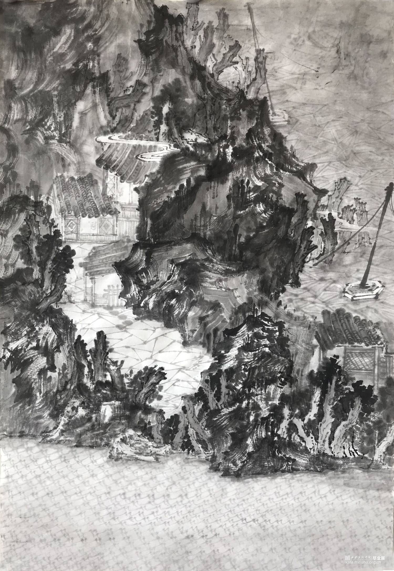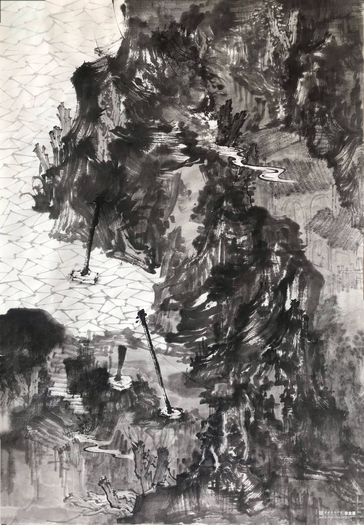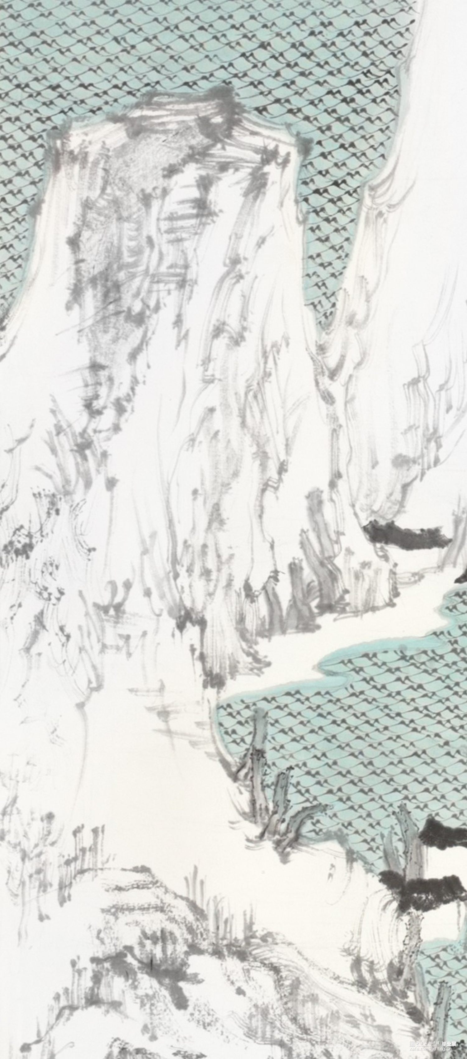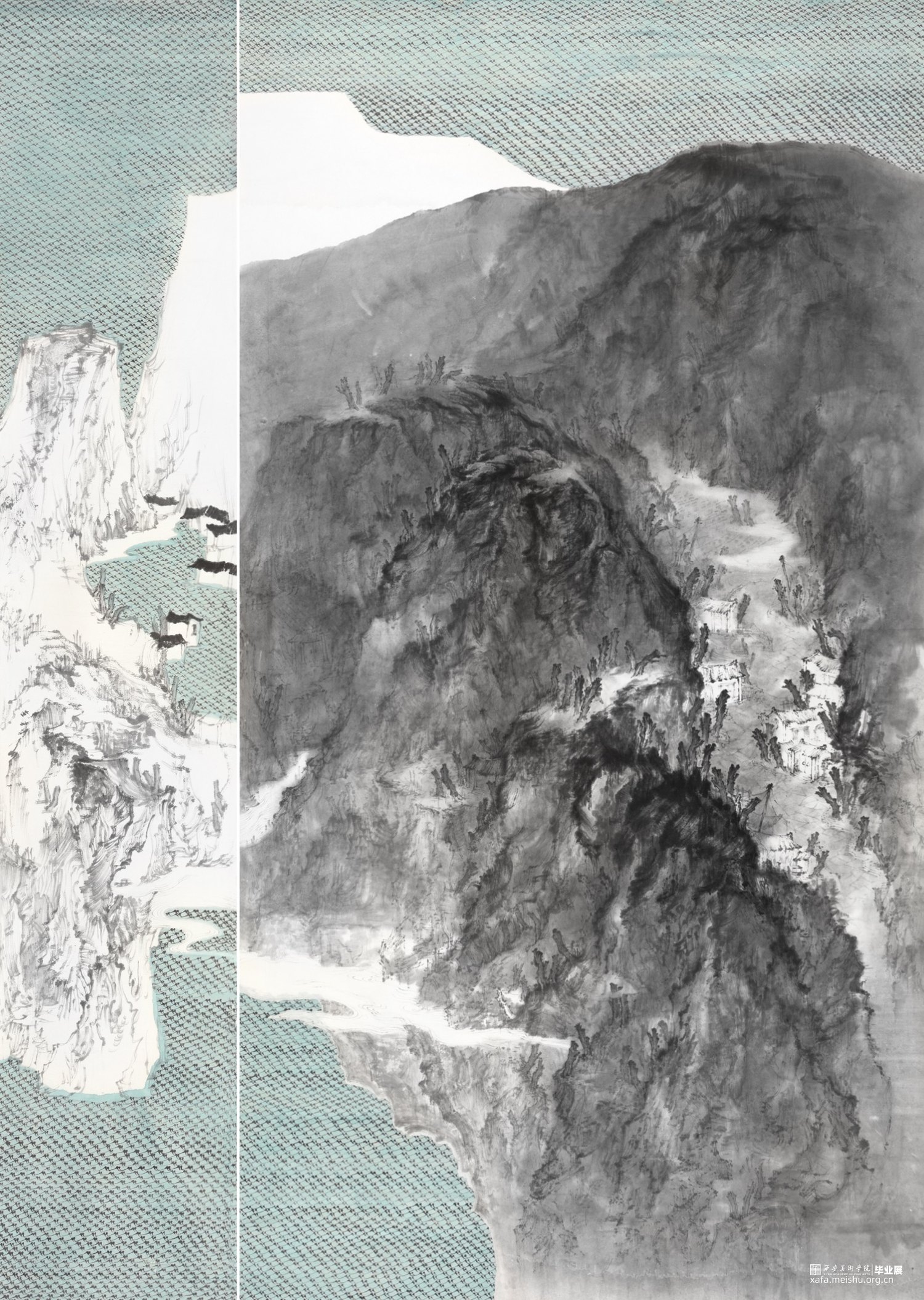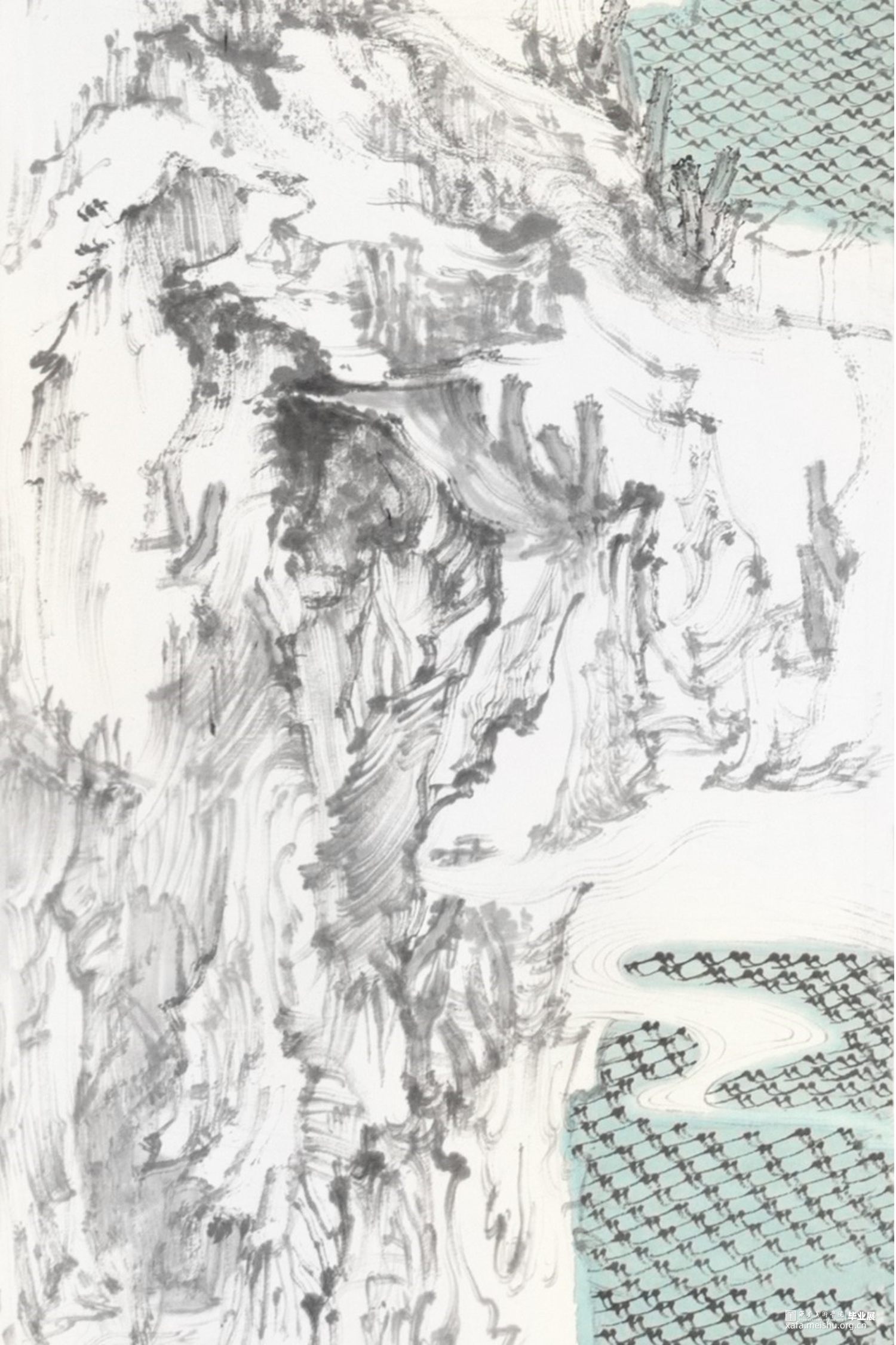 我们凝视,但山不在那里,它们在无涯时空里发呆。发呆即是在别处,惊醒则把我从虚幻世界里拉回来,山水一清一浊,我们凝视,便有了往来于无限时空的可能。作品启发于经受现实世界的各种灾难洗礼,万物沉寂,静中寓动,可山还在那里,生灵也从未销息,通过疏密、虚实的强烈对比产生刚柔并济的共生感,表达一种寂静中冲破天际的希冀感:无论我们正在经历着什么,是否依然能够拨开混沌浓雾找到属于自己内心的光。