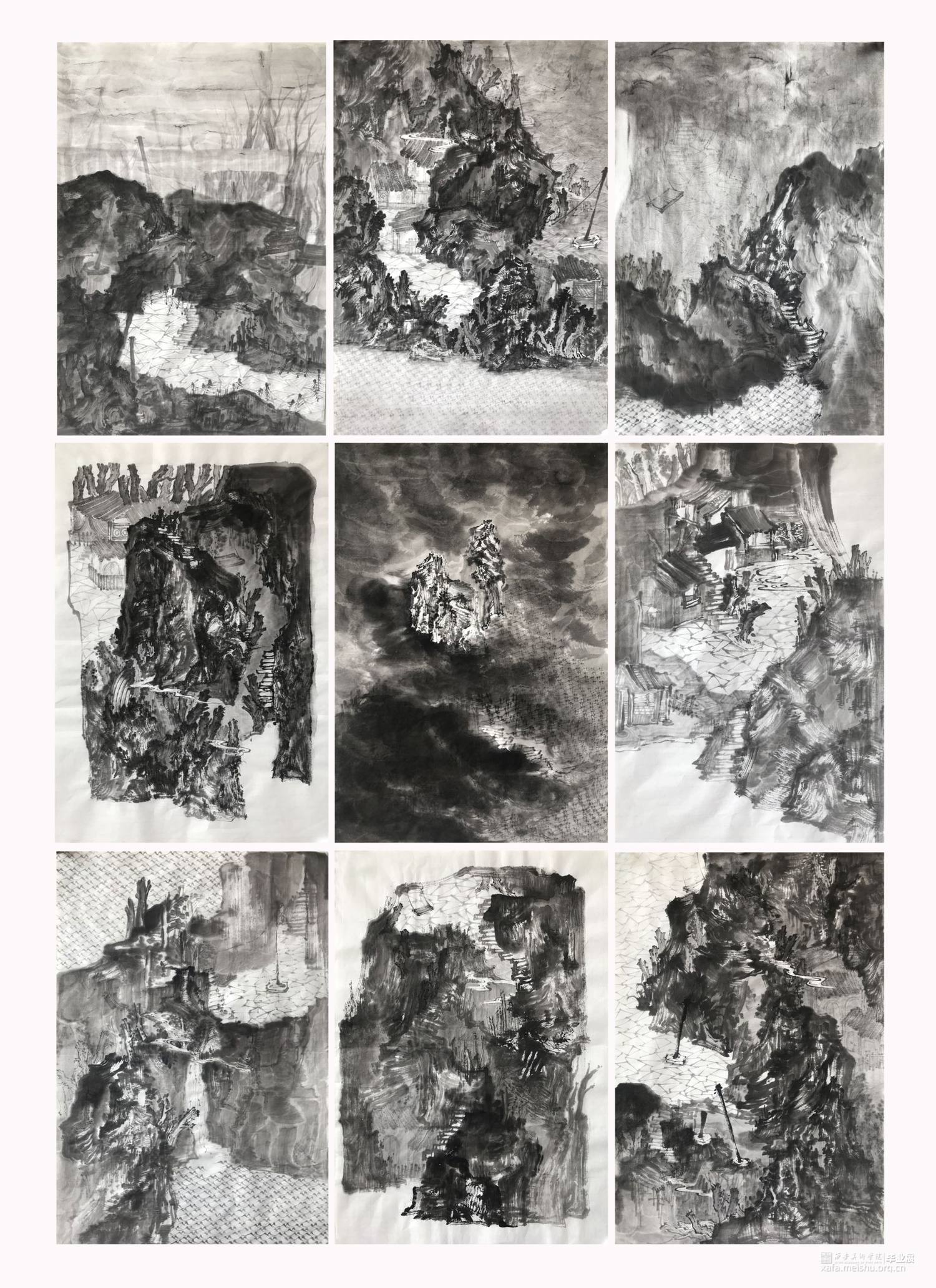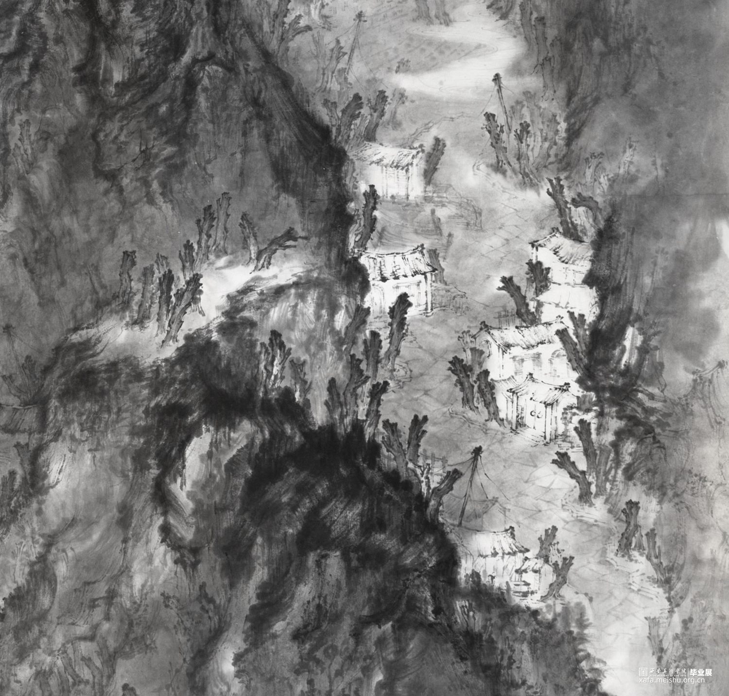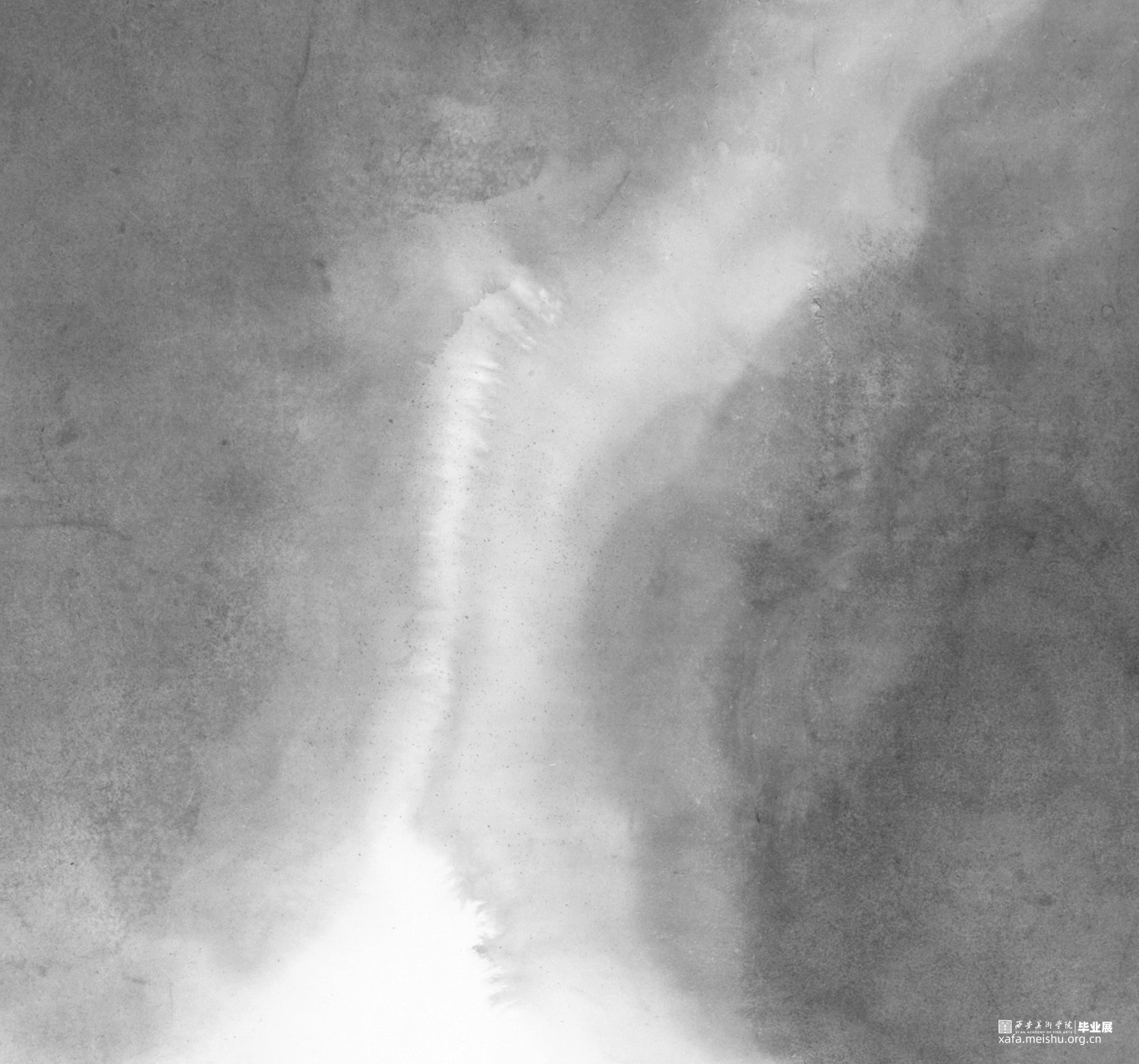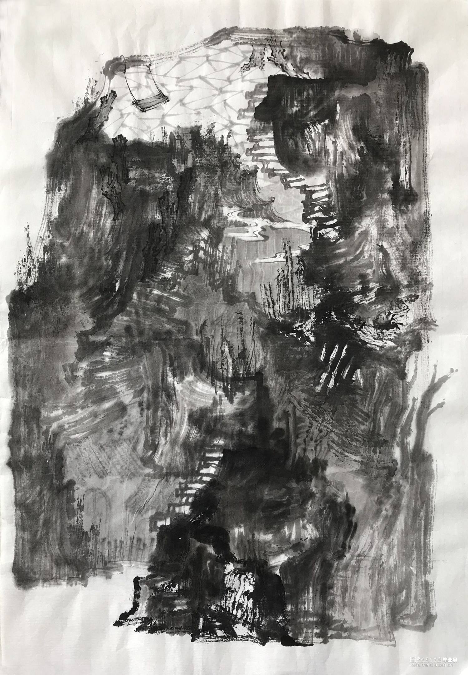 我们凝视,但山不在那里,它们在无涯时空里发呆。发呆即是在别处,惊醒则把我从虚幻世界里拉回来,山水一清一浊,我们凝视,便有了往来于无限时空的可能。作品启发于经受现实世界的各种灾难洗礼,万物沉寂,静中寓动,可山还在那里,生灵也从未销息,通过疏密、虚实的强烈对比产生刚柔并济的共生感,表达一种寂静中冲破天际的希冀感:无论我们正在经历着什么,是否依然能够拨开混沌浓雾找到属于自己内心的光。
