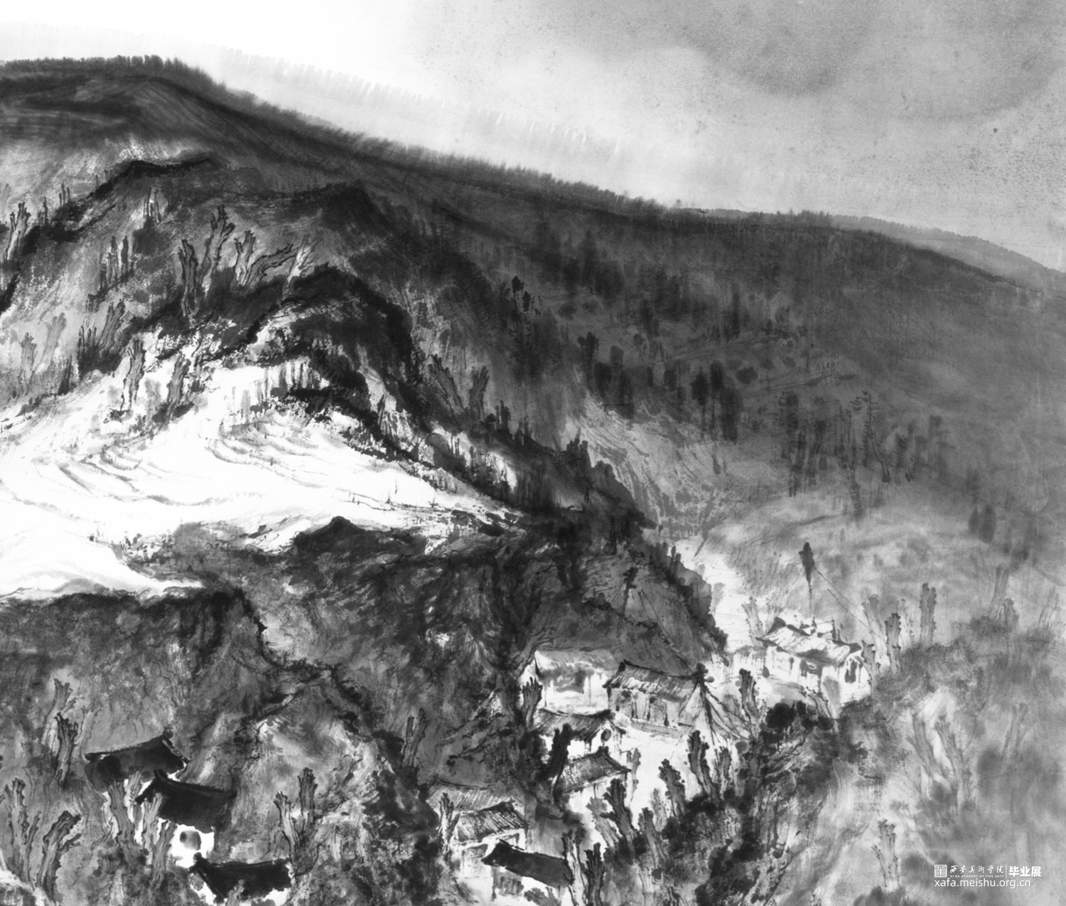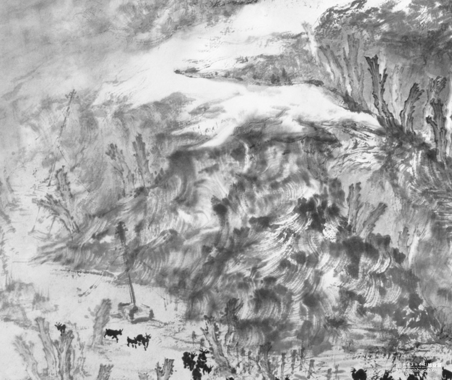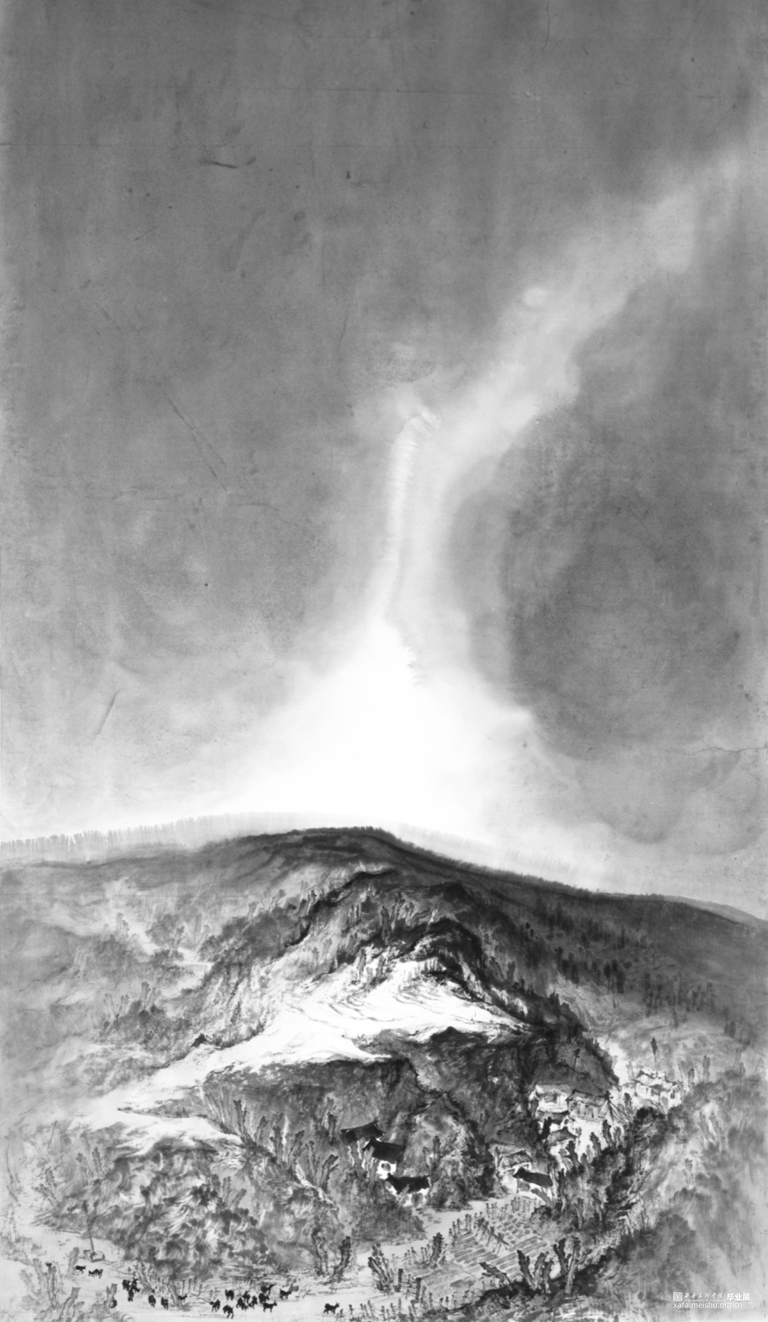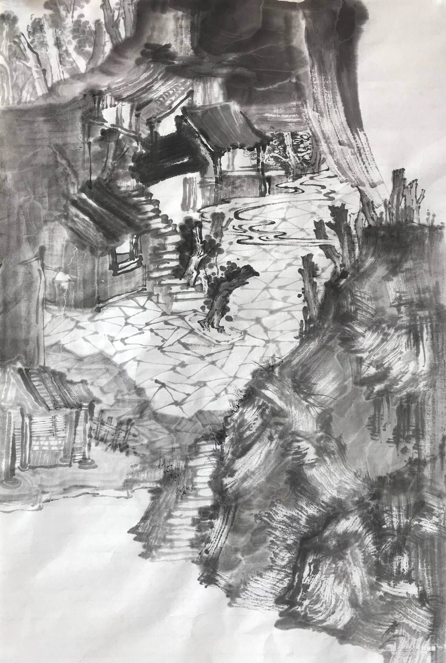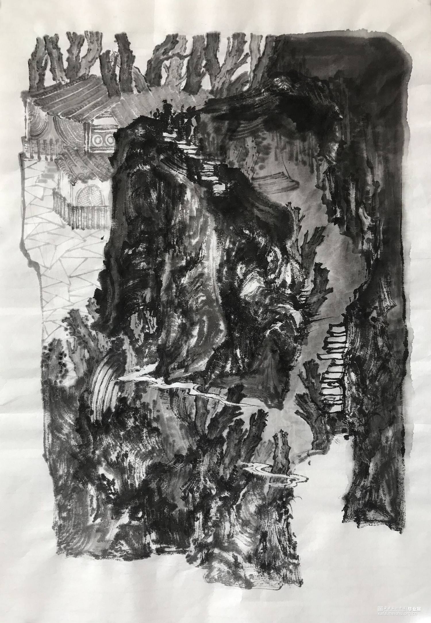 我们凝视,但山不在那里,它们在无涯时空里发呆。发呆即是在别处,惊醒则把我从虚幻世界里拉回来,山水一清一浊,我们凝视,便有了往来于无限时空的可能。作品启发于经受现实世界的各种灾难洗礼,万物沉寂,静中寓动,可山还在那里,生灵也从未销息,通过疏密、虚实的强烈对比产生刚柔并济的共生感,表达一种寂静中冲破天际的希冀感:无论我们正在经历着什么,是否依然能够拨开混沌浓雾找到属于自己内心的光。