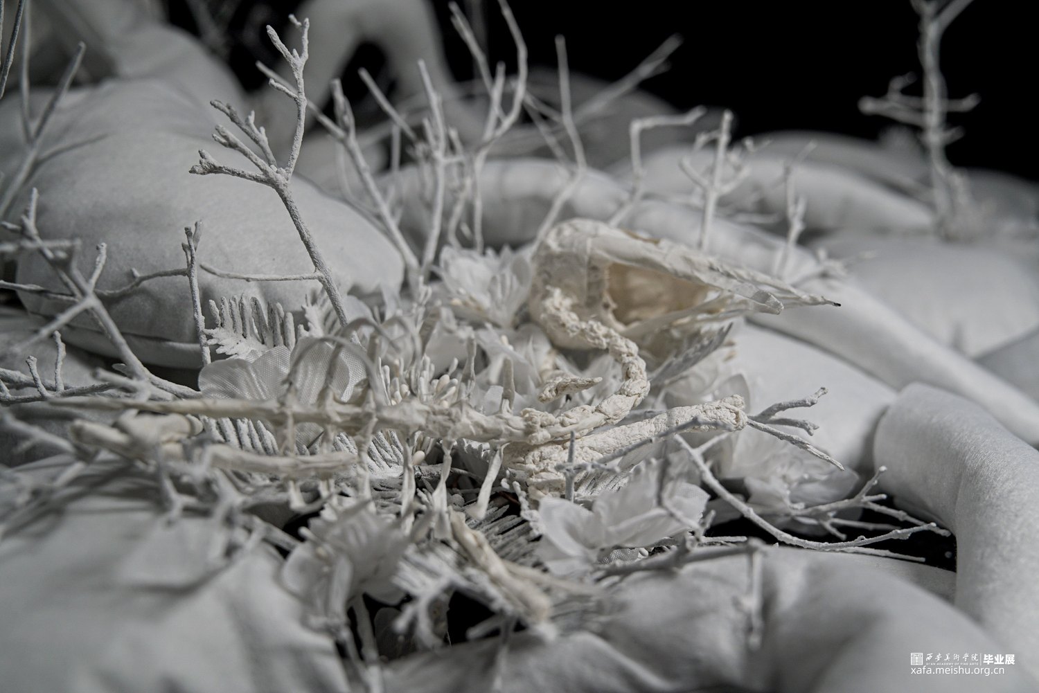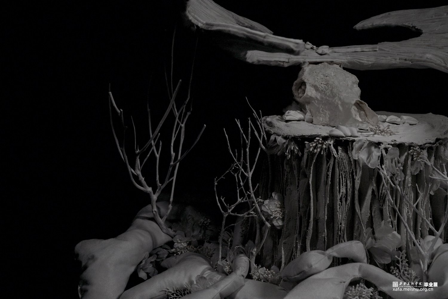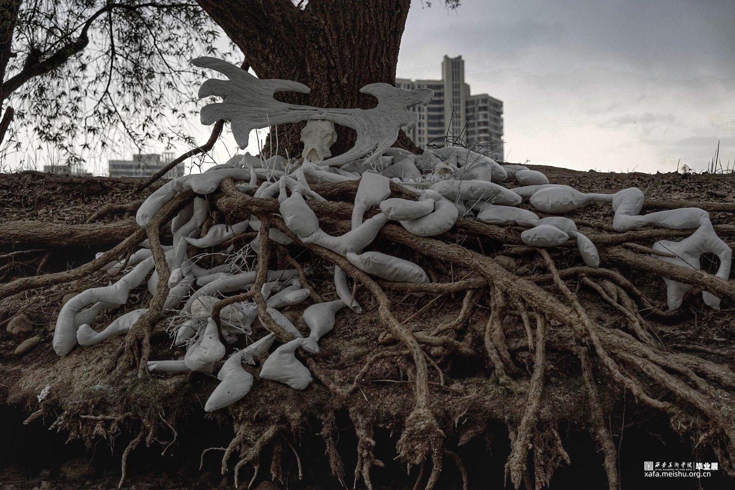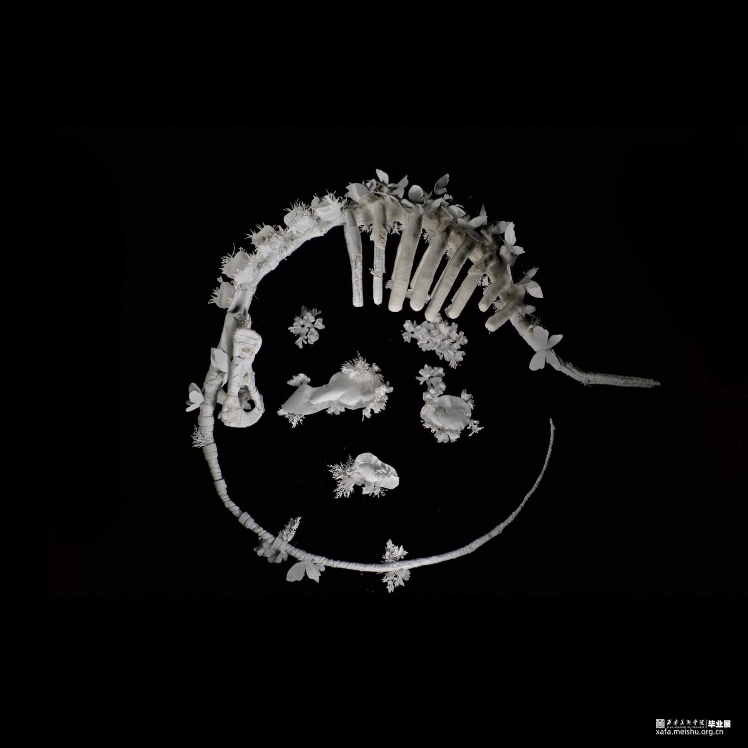 《The way to leave》系列作品。七千年前自然灭绝的大角鹿的头骨与近年由于人类活动而灭绝的动物的骨骼同时呈现。生物本可以优胜劣汰自然更替,而人类文明的发展严重影响了这个过程。生命仍然会以其他方式延续,但它们应该拥有更好的结局。动物骨骼上落满蝴蝶,骨骼缝隙处生出细芽,表现生命的转化。