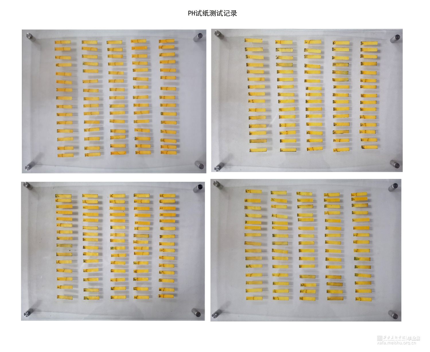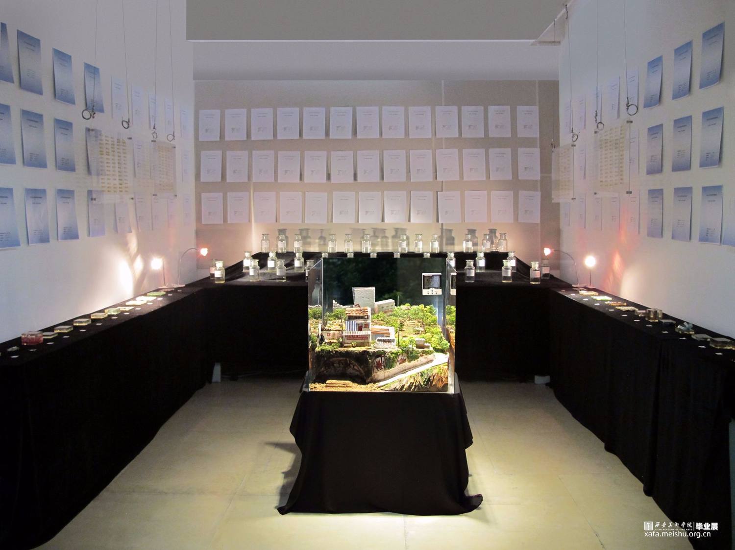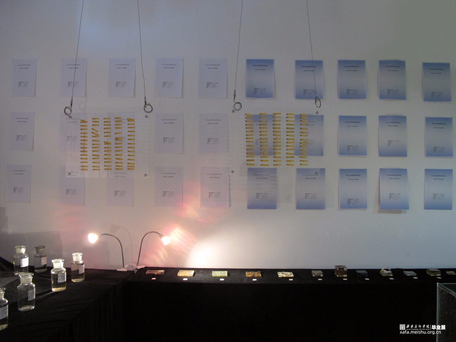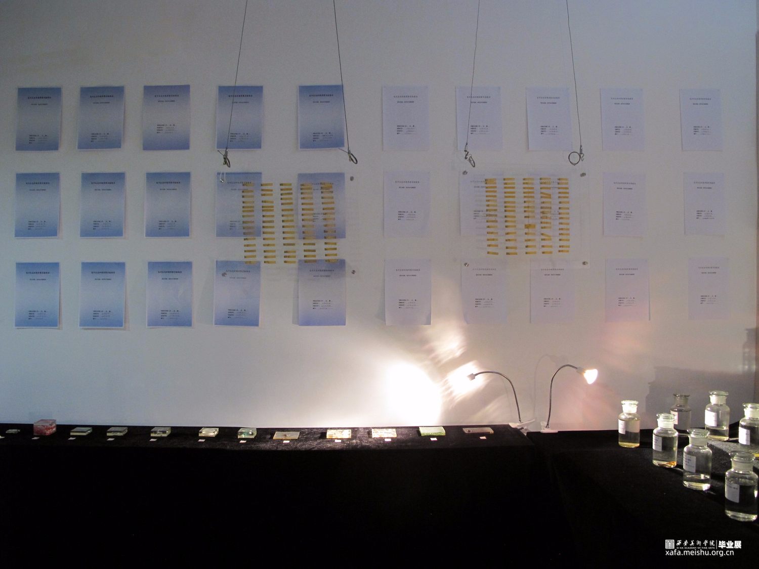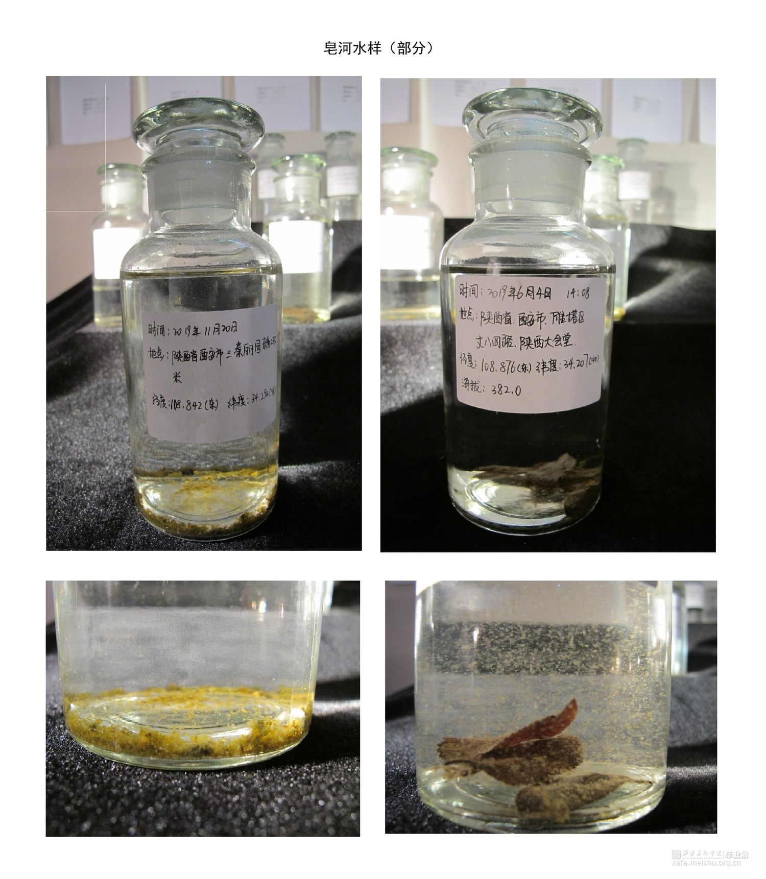 作品共由五个部分组成,第一个部分是将收集到的污水用500毫升试剂瓶进行封装,每一瓶水对应一个水样采集点,试剂瓶上的标签记录了水样的采集时间、地点、经纬度、海拔等信息,这样可以直接让观众看到“皂河”水污染的现状。
