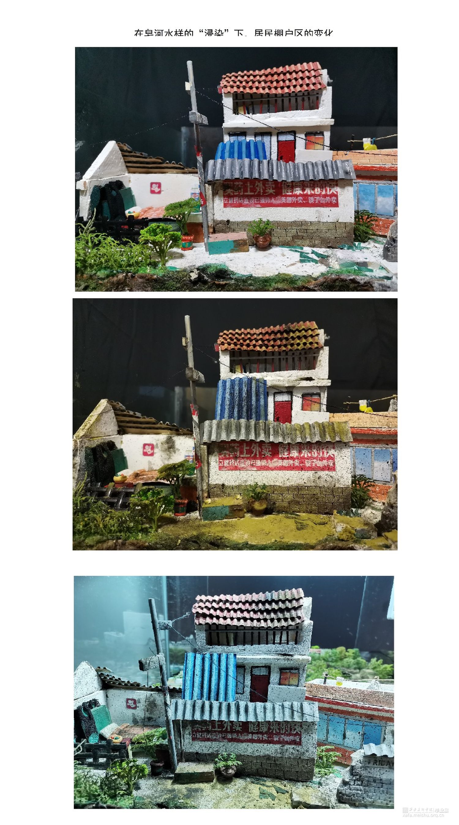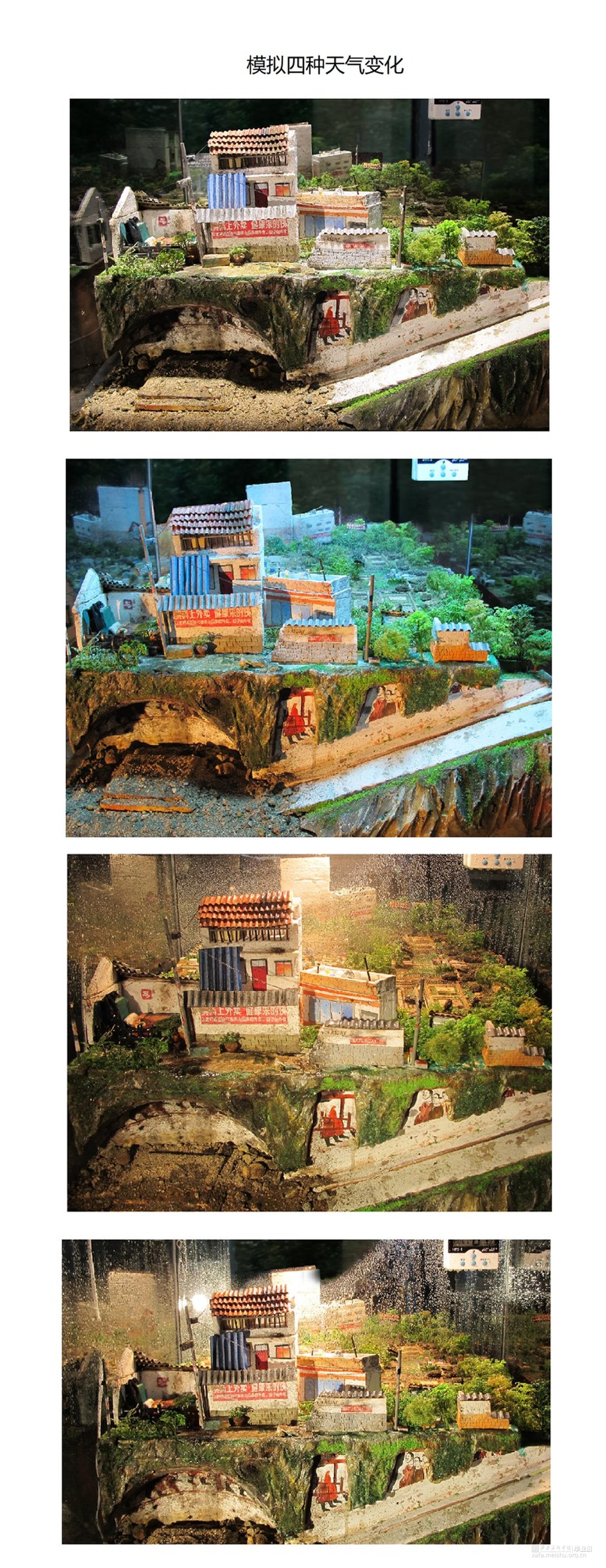 第五个部分是构建一个“皂河生态圈”,来模拟水污染对生态环境的影响,这也是作品最重要的展示部分。“皂河生态圈”分别由汉长安城遗址、居民棚户区、地下墓室壁画三个部分组成,利用外置工具模拟“皂河”的气候----阴晴雨雪的变化。选取自我考察时间段中的最新时节(2020年4月21日至5月21日)与皂河周边气候实行观察并同步记录模拟“生态圈”的变化。在这成阶段性“31天计划”的过程中,以对气候模拟的直观视觉感受表达水资源对生态环境的影响,因为模拟生态圈中的系统水资源使用的是真实的皂河水样,所以,这样皂河水样对地下历史遗迹及地面建筑等产生的效应便会在观众面前有直观地呈现,引发观者对水污染问题的反思。