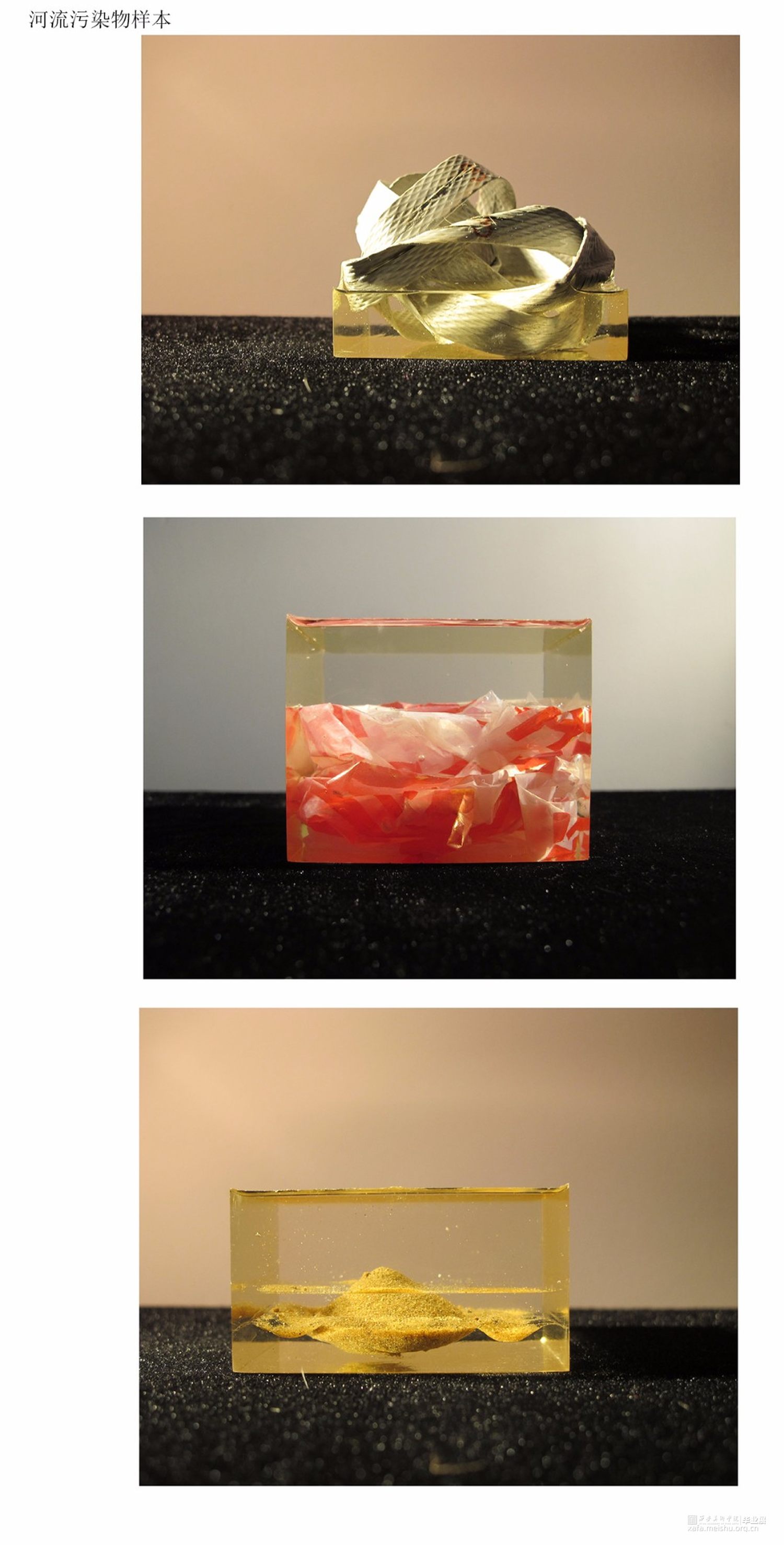 第三个部分是将收集到的污染物用树脂滴胶进行封存,这些制作好的“样本”晶莹剔透,如同用水晶包裹着的精美艺术品,在现场的灯光下闪耀着光芒。