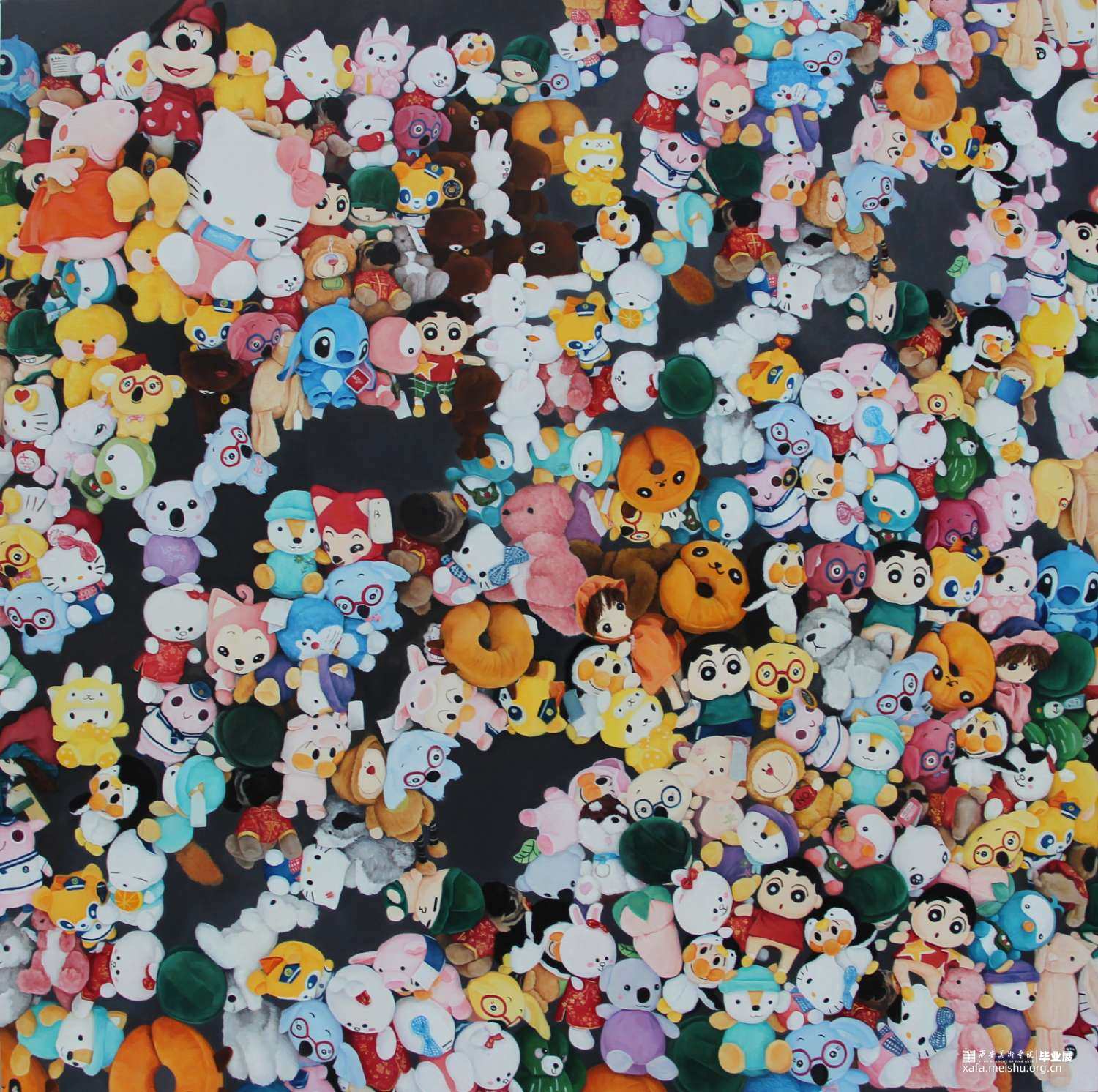 这幅作品的创作灵感源于街头的一面玩具装饰墙,铺满密集的玩具给了我极大的视觉冲击。于大多数女性而言,从小就对毛绒玩具这种物品有着特有的喜爱与情感,即使现在家中还是有着大小不一、各式的毛绒玩具,这幅作品的构图依旧借鉴这“玩具墙”所带来的效果,明亮的色调来呈现欢快、童趣之意。