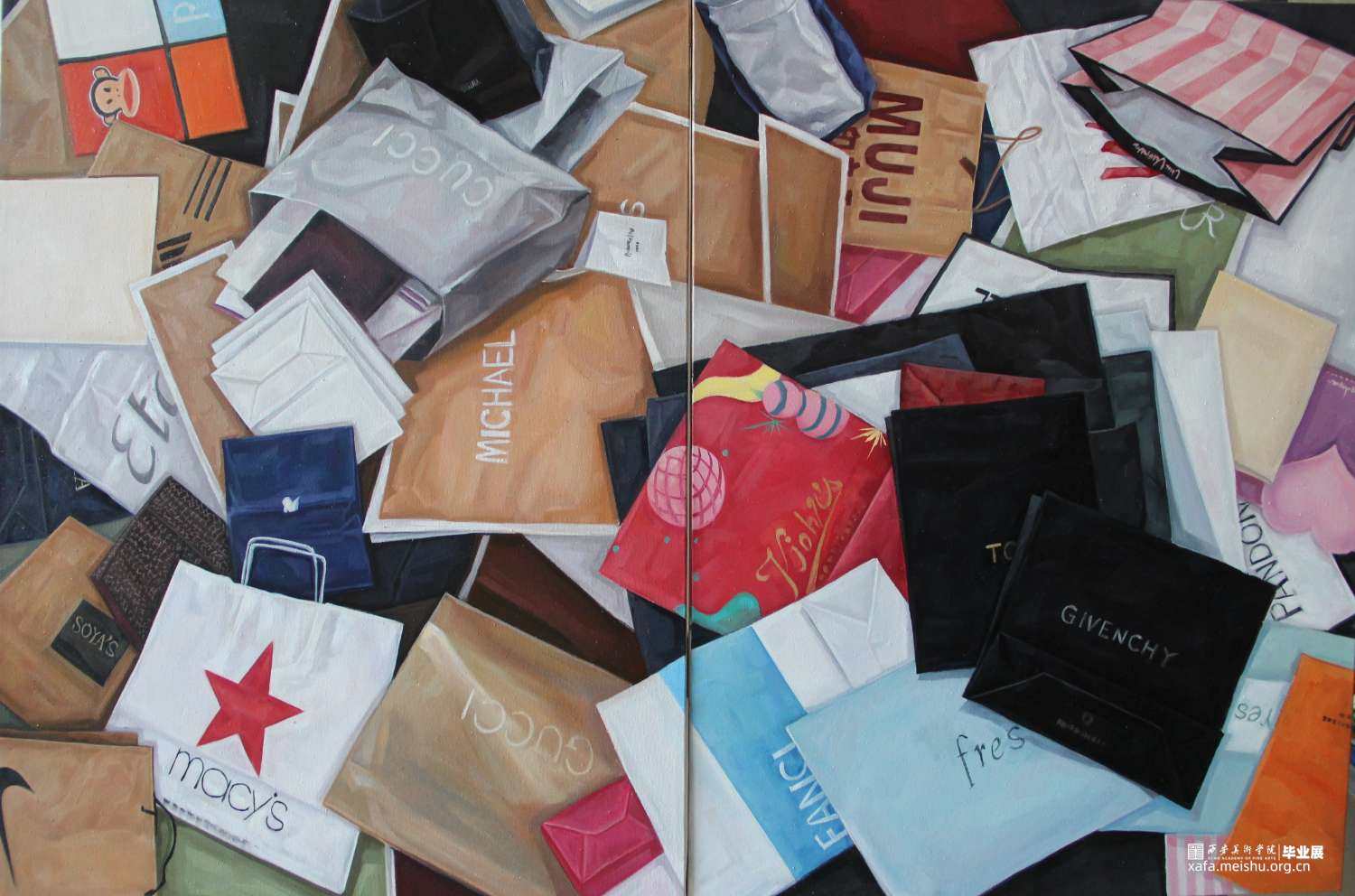 从产品设计的角度来看,各种包装纸袋的不同质感、形状、色彩和标志特征等,都具有一定的美感与特色。这幅作品与《静·境》皆是同一类素材——购物袋,不同的是这幅画面中采用俯视的视角,随意散落的物体状态,前后上下的层次感,塑造时着重表现物体特征与画面整体的和谐。