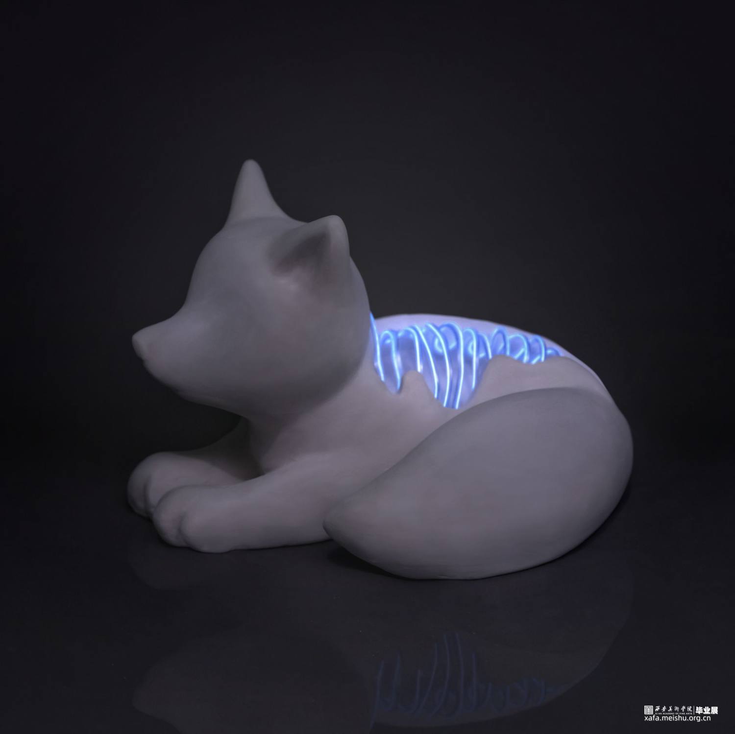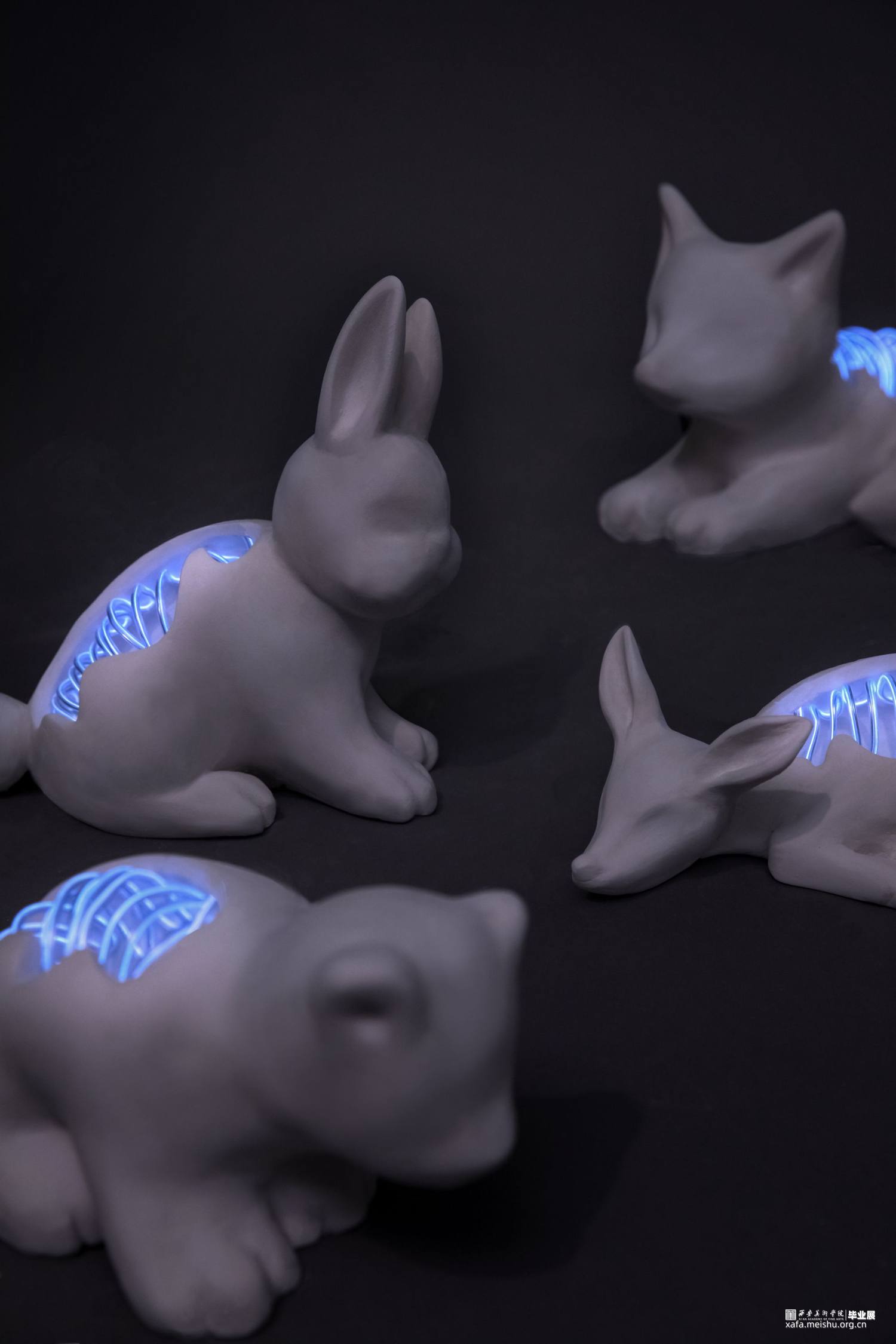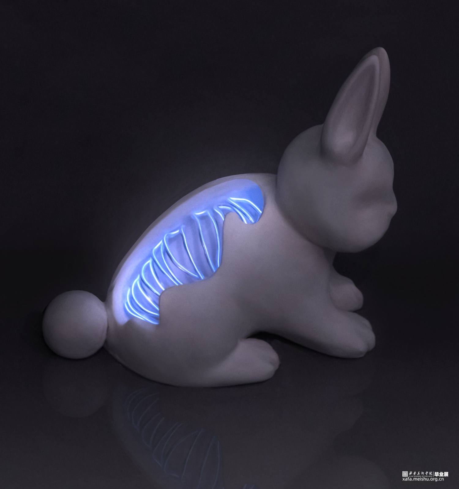 作品创意来源于Cyborg这一词,即控制论(Cybernetic)与生命体(Organism)的混写,原意为部分机能由各种电子或电机装置代替的生命体,能够“自我调节的人机系统”,在科幻类艺术作品中,它常被描写为拥有机械装置运作精确、具备人类的一切特质,比如感觉、感情以及思维的存在。作品造型形态将陶瓷材料与综合材料相结合,塑造旨在表达漫长的人类世中人类对于身边事物的干预,霓虹灯作为人类社会的产物,而野生动物的定义为处于不受约束的状态,独立于人类之外而生存的生物,将野生动物的脊柱与骨骼用霓虹灯条替换,再现人类对于自然界的干预与改造。这种人类行为或是有意识的干预、或是无意识的影响,对此我们应站在客观的角度进行审视,在憧憬、构建未来的同时,思考人类与自然生态和谐共存的时空关系。