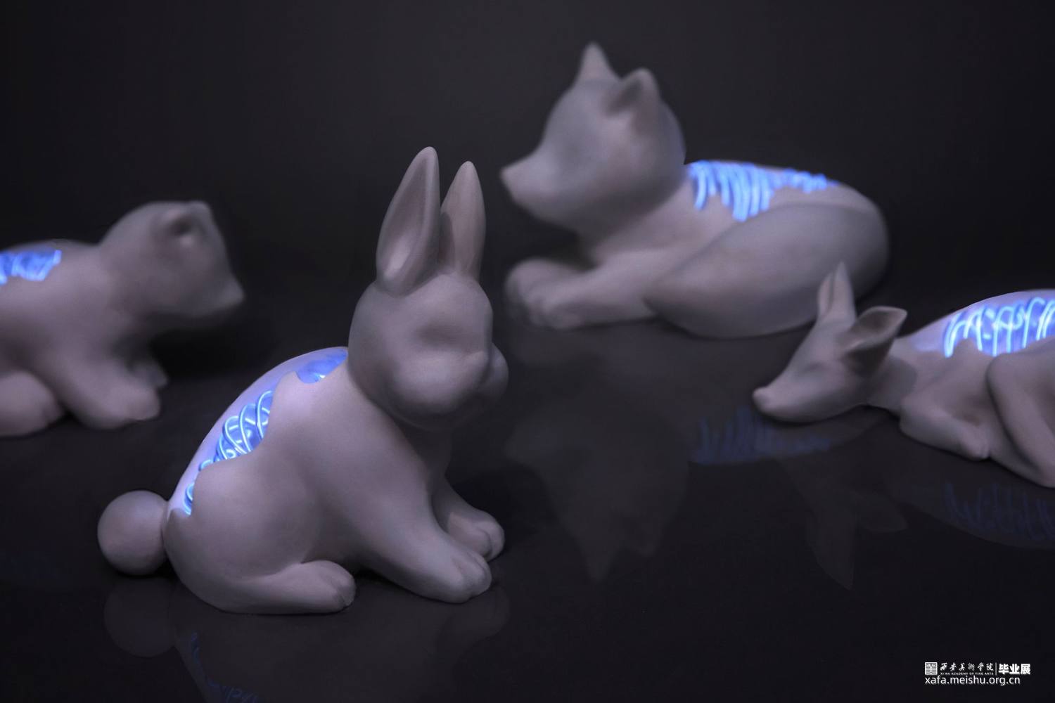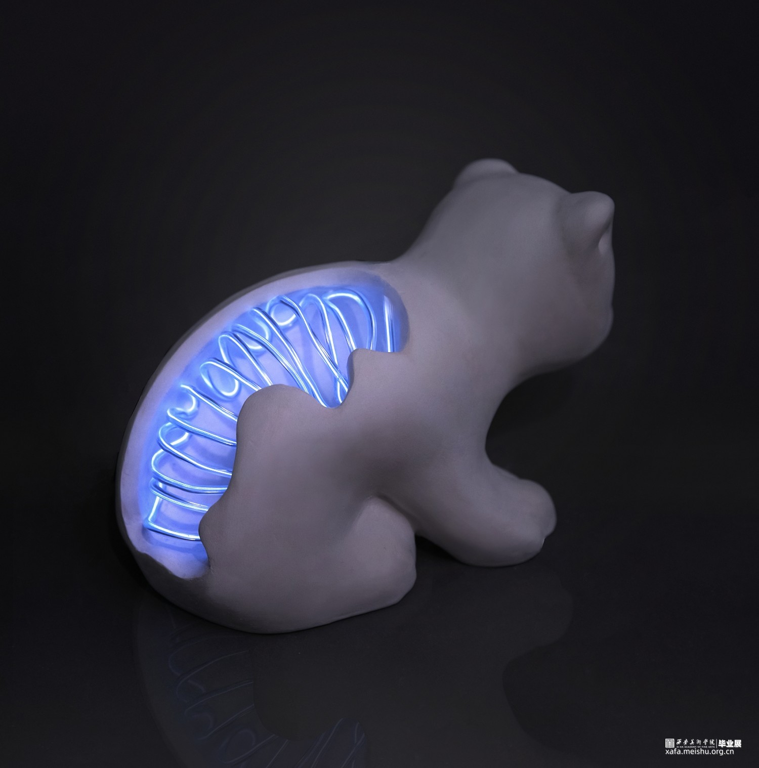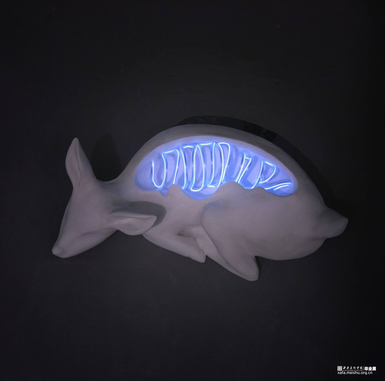 作品创意来源于Cyborg这一词,即控制论(Cybernetic)与生命体(Organism)的混写,原意为部分机能由各种电子或电机装置代替的生命体,能够“自我调节的人机系统”,在科幻类艺术作品中,它常被描写为拥有机械装置运作精确、具备人类的一切特质,比如感觉、感情以及思维的存在。作品造型形态将陶瓷材料与综合材料相结合,塑造旨在表达漫长的人类世中人类对于身边事物的干预,霓虹灯作为人类社会的产物,而野生动物的定义为处于不受约束的状态,独立于人类之外而生存的生物,将野生动物的脊柱与骨骼用霓虹灯条替换,再现人类对于自然界的干预与改造。这种人类行为或是有意识的干预、或是无意识的影响,对此我们应站在客观的角度进行审视,在憧憬、构建未来的同时,思考人类与自然生态和谐共存的时空关系。