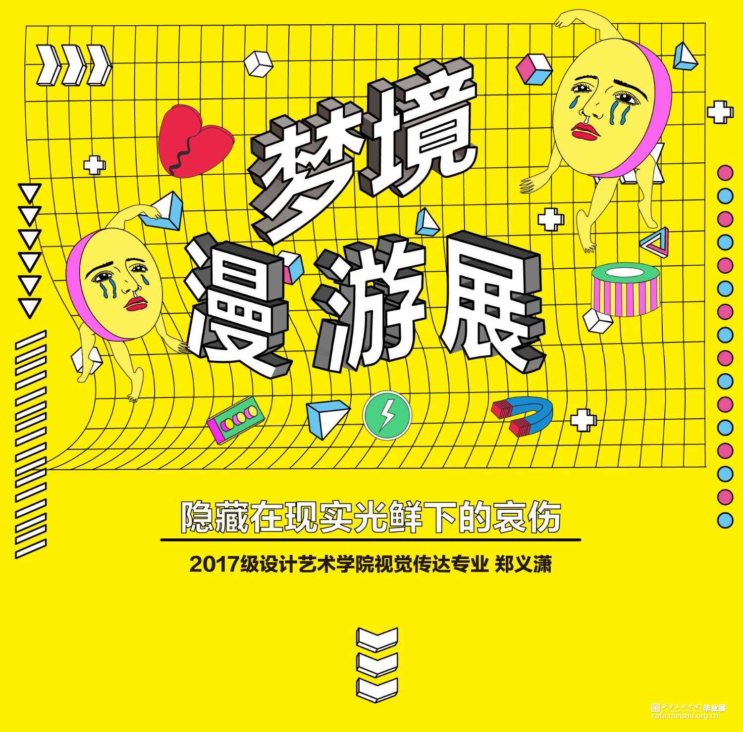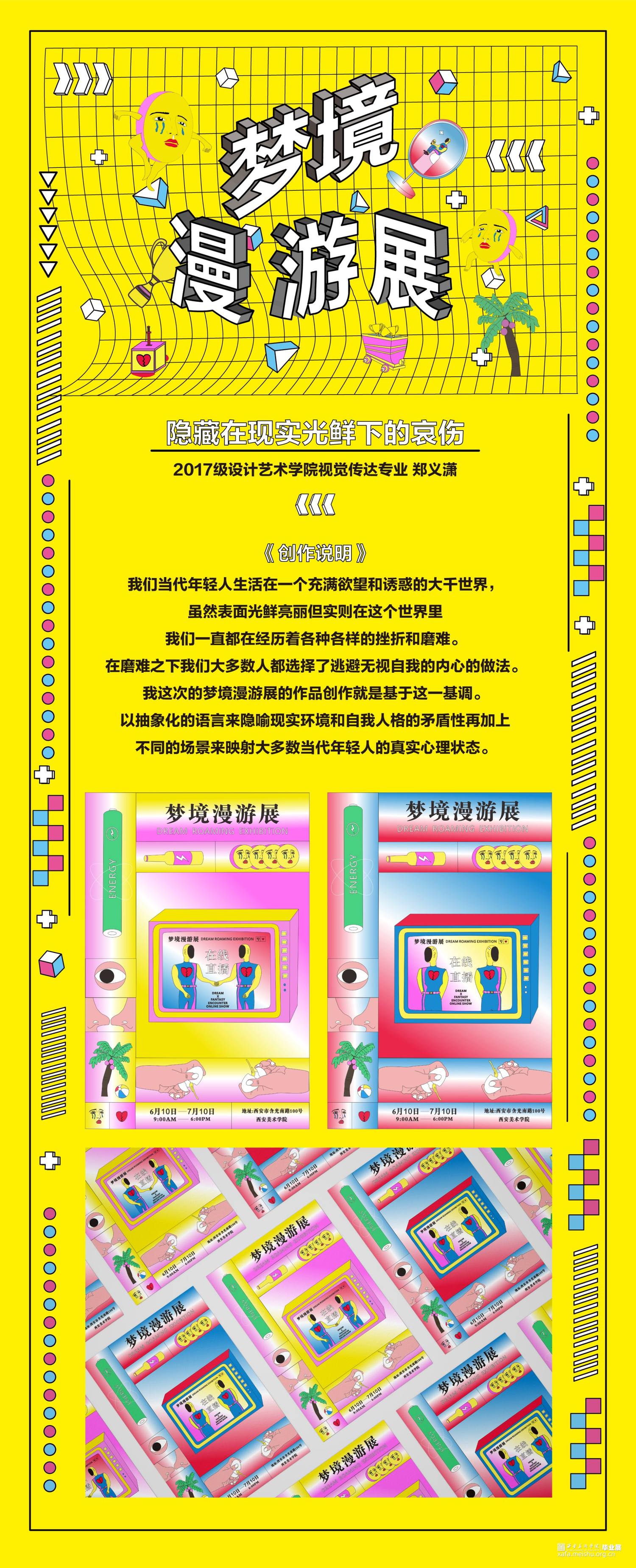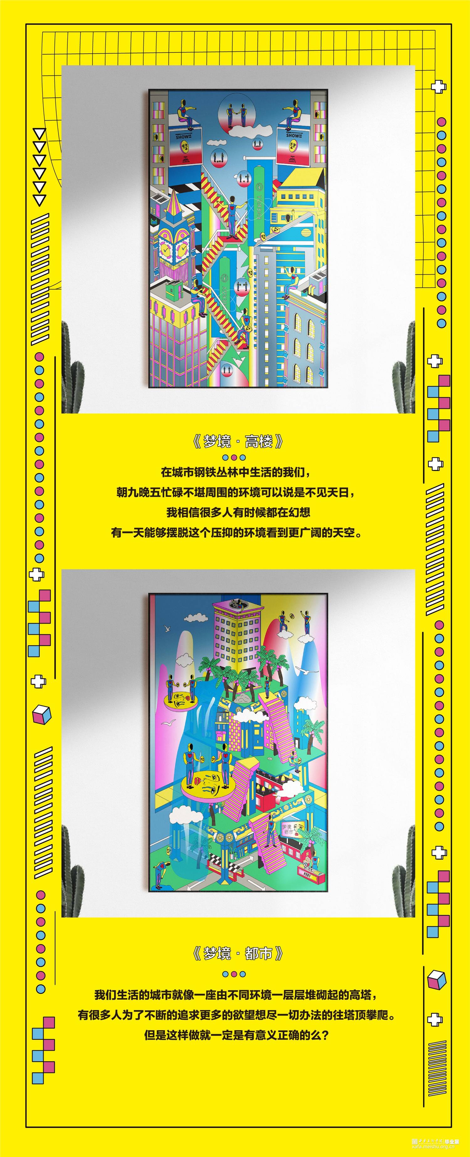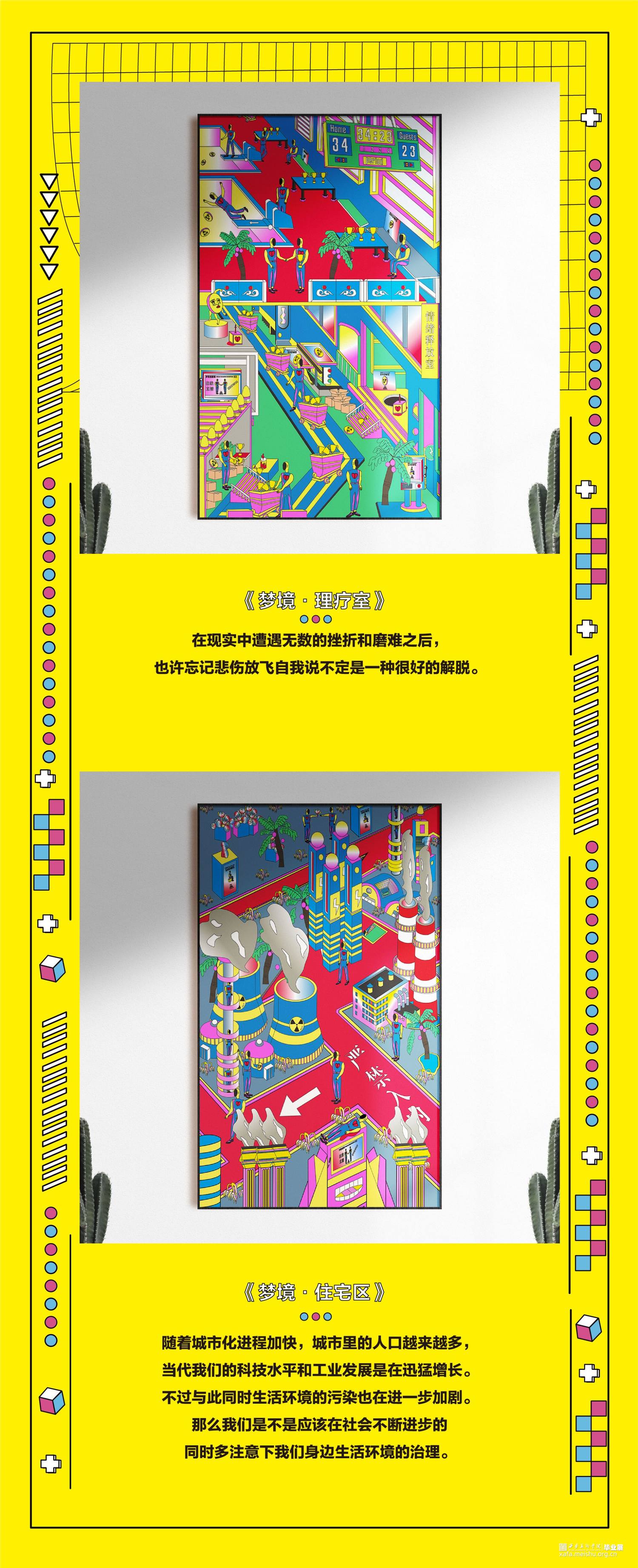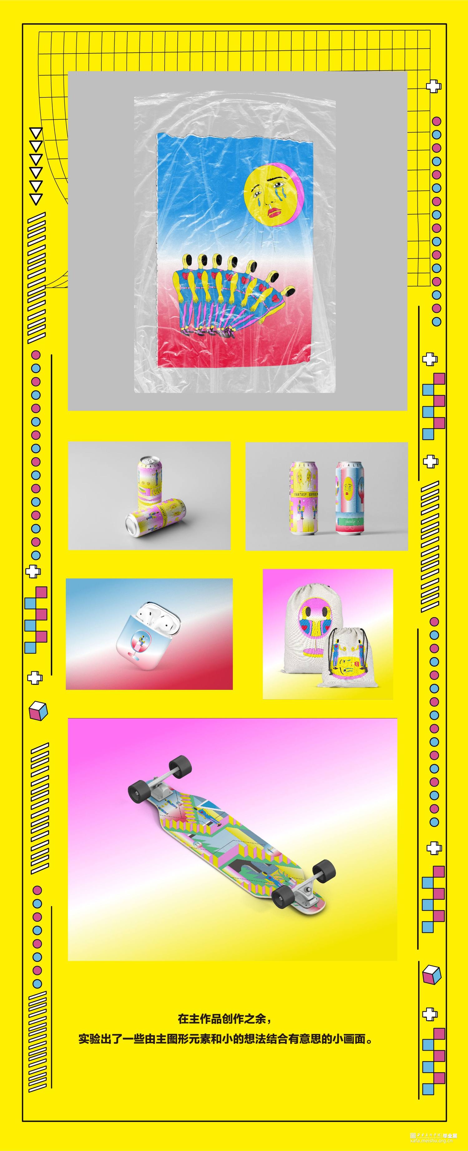 从当下生活和个人情感的思考进行挖掘,既符合波普艺术来源于当下生活的理念,又能充分展现个人的情感表达。对于那些即将离开校园,步入社会的年轻人,对未来的恐慌和不安都充斥在他们的周围。“丧文化”、“996”、“社畜”等问题将当代青年们陷入了低气压的沉闷之中。随着时代的发展,人口增多,各行各业的人才趋于饱和,市场经济从高速增速期渐渐放慢进入平缓期,在有限的社会资源下人与人的竞争变得激烈。与此同时日趋增长的物价水平给当代人们生活带来了极大的压力。对于充满斗志的年轻一代,现在的时代是最好的时代也是最差的时代。这个时代是让大多数人有机会通过多种多样的渠道接触到更多的知识和信息,从而能做出更多的选择;却也有着激烈的竞争和高物价产生的生存压力。本次设计的初衷就是将波普适应大众青年的审美这一特性充分发掘,将诙谐感的自嘲方式和几何结构的分解重组相结合,以及明快色彩的补充,将相关隐喻性的内容以视觉上的反差效果呈现出来。
