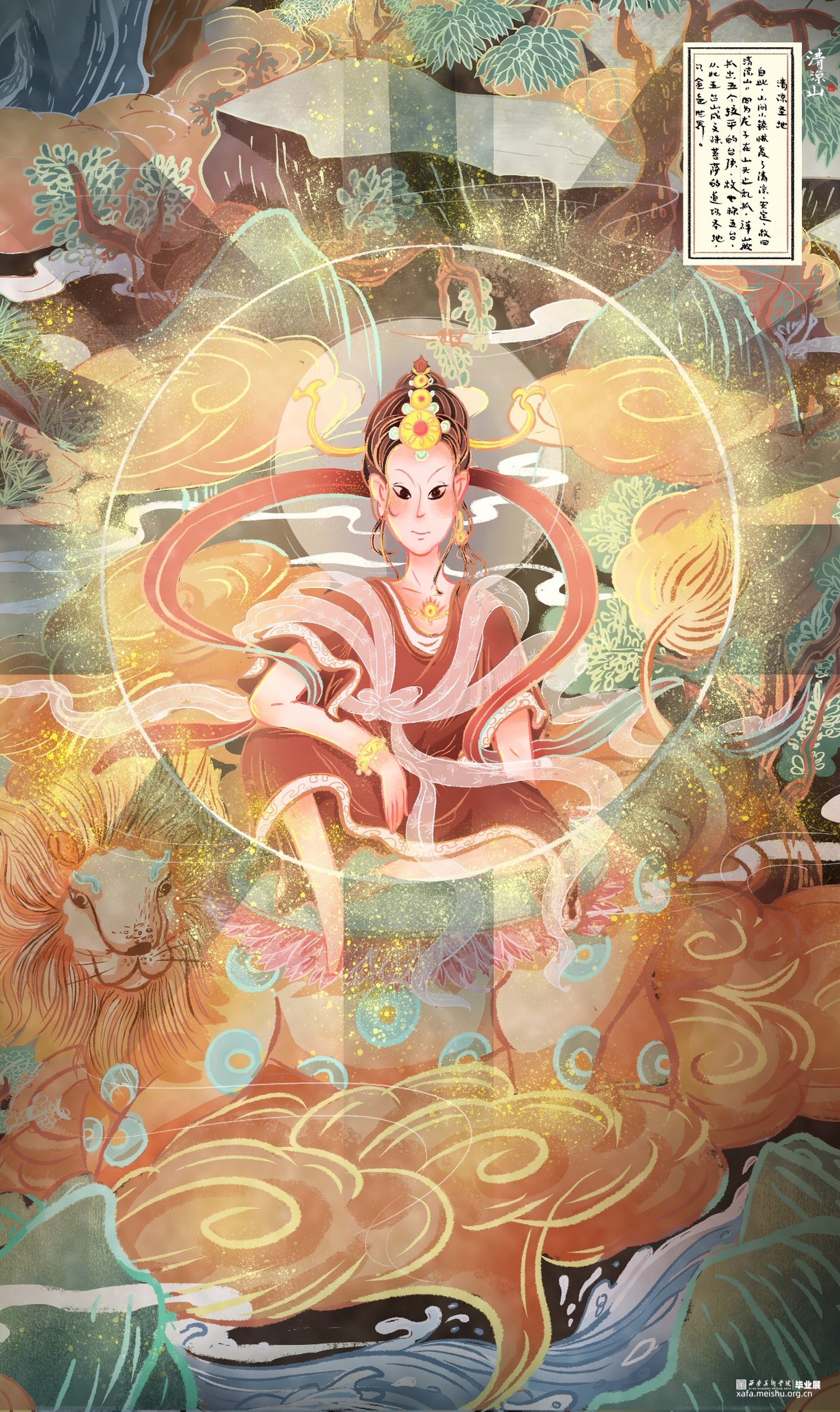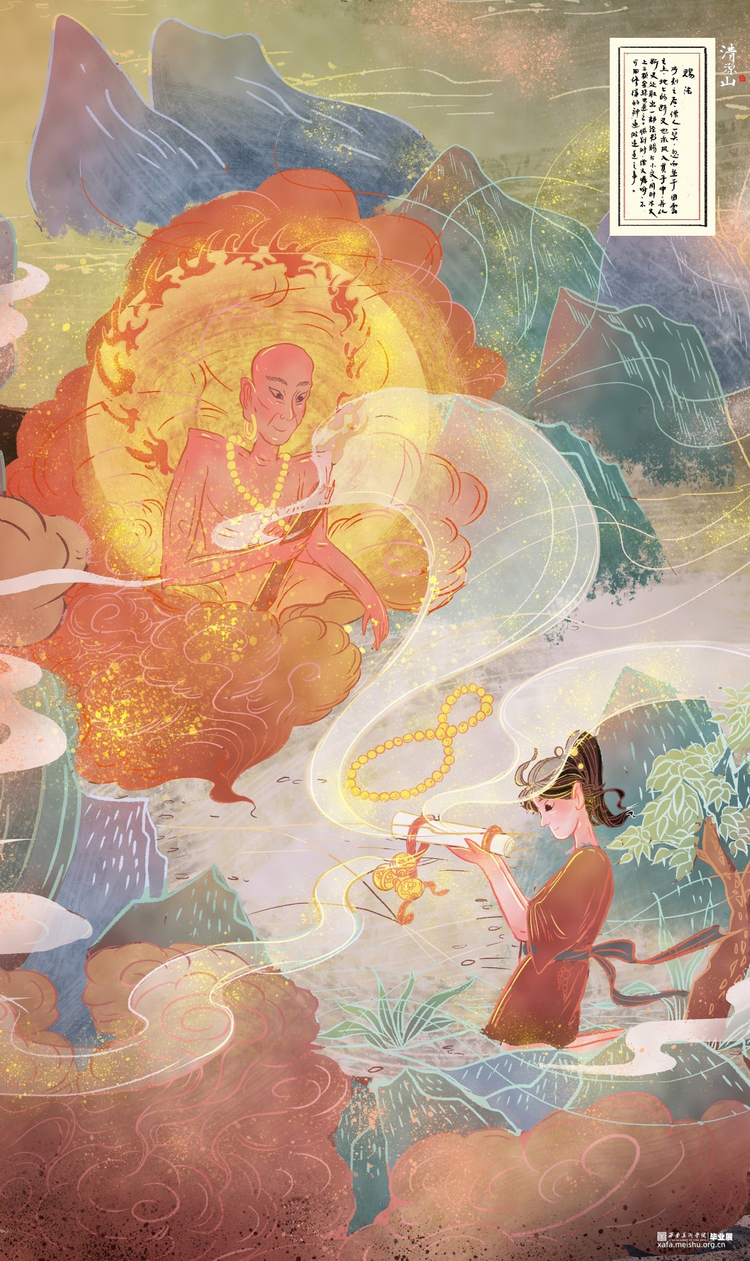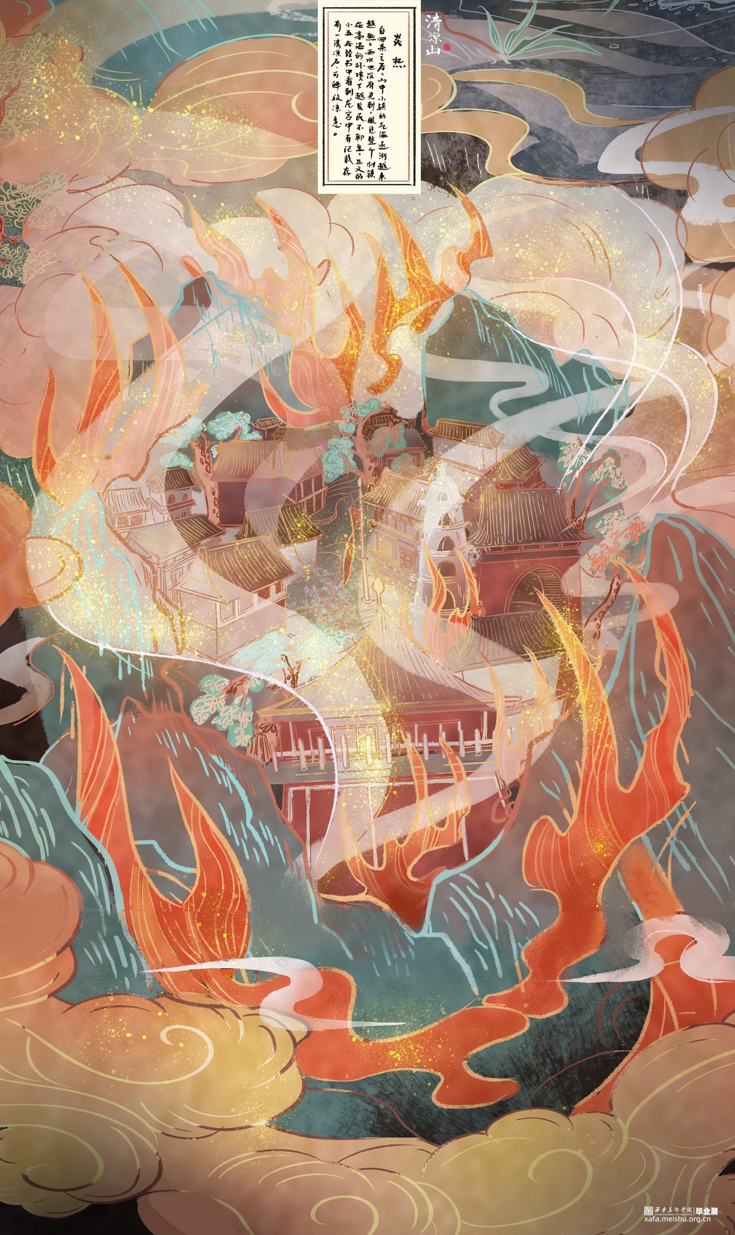 作品《清凉山》以五台山“清凉”一说的来历故事作为题材进行改编,使得叙事框架融入当代审美价值观。山西寺观壁画体系较为完整,内容精细丰富,于文化、美术、装饰等诸多方面都具有重要历史意义和研究价值,是中国传统壁画艺术中的重要篇章之一,本作品画面内容上是以山西寺观壁画为提取借鉴蓝本,将异时同画式构图、人兽结合的夸张造型及装饰性的传统纹样应用于漫画创作中,传承文化的同时探索一种创作中国原创漫画的风格可能。《清凉山》漫画作品的创作,以山西寺观壁画与漫画的融合为出发尝试点,在传统与现代的碰撞、神话传说与当代价值观的对话中,用光怪陆离的图像叙事带以观赏者更多中国传统艺术的魅力展现。