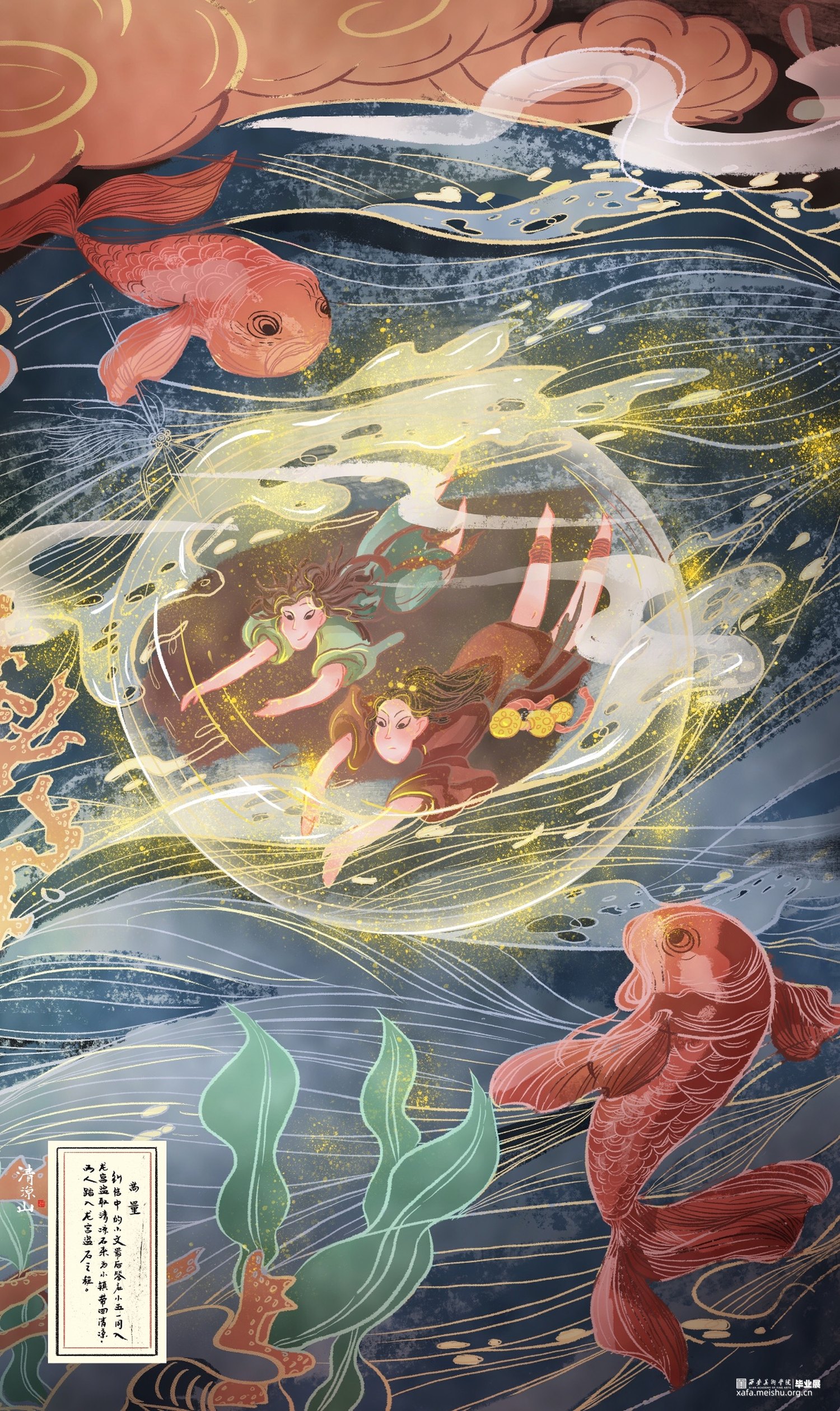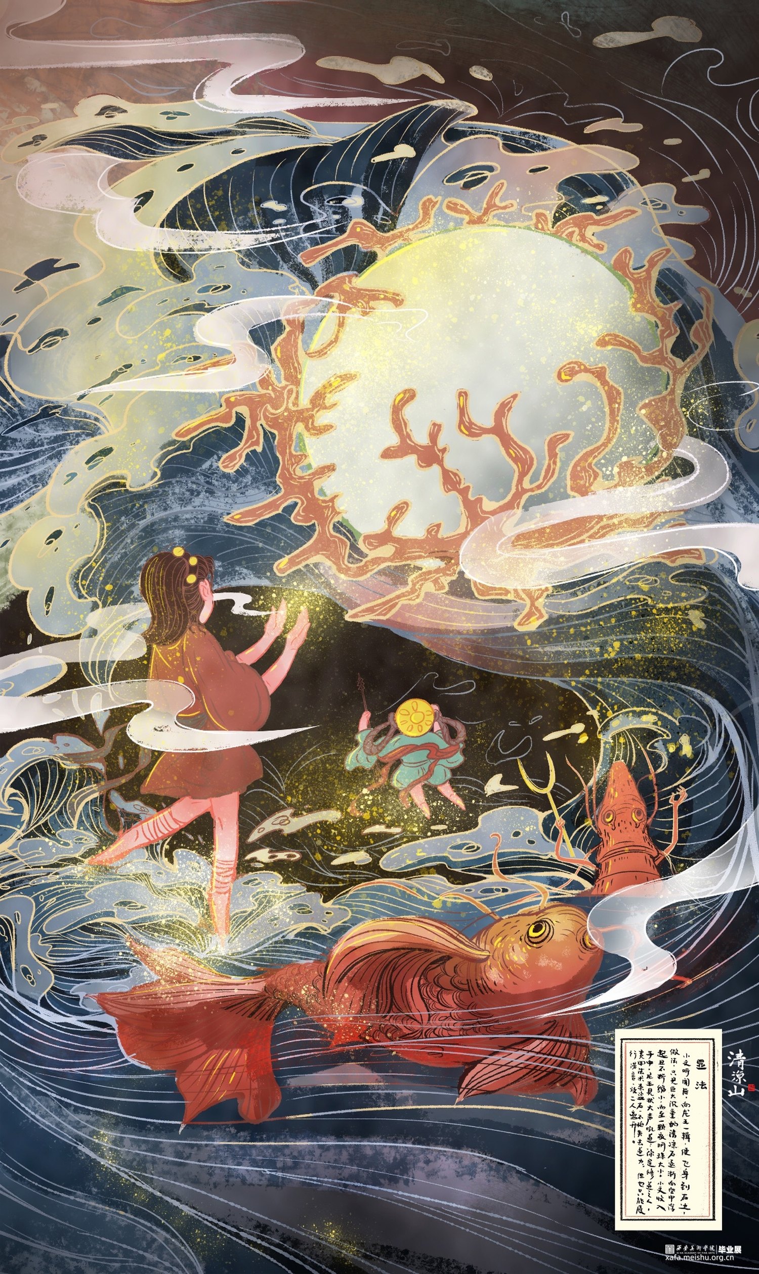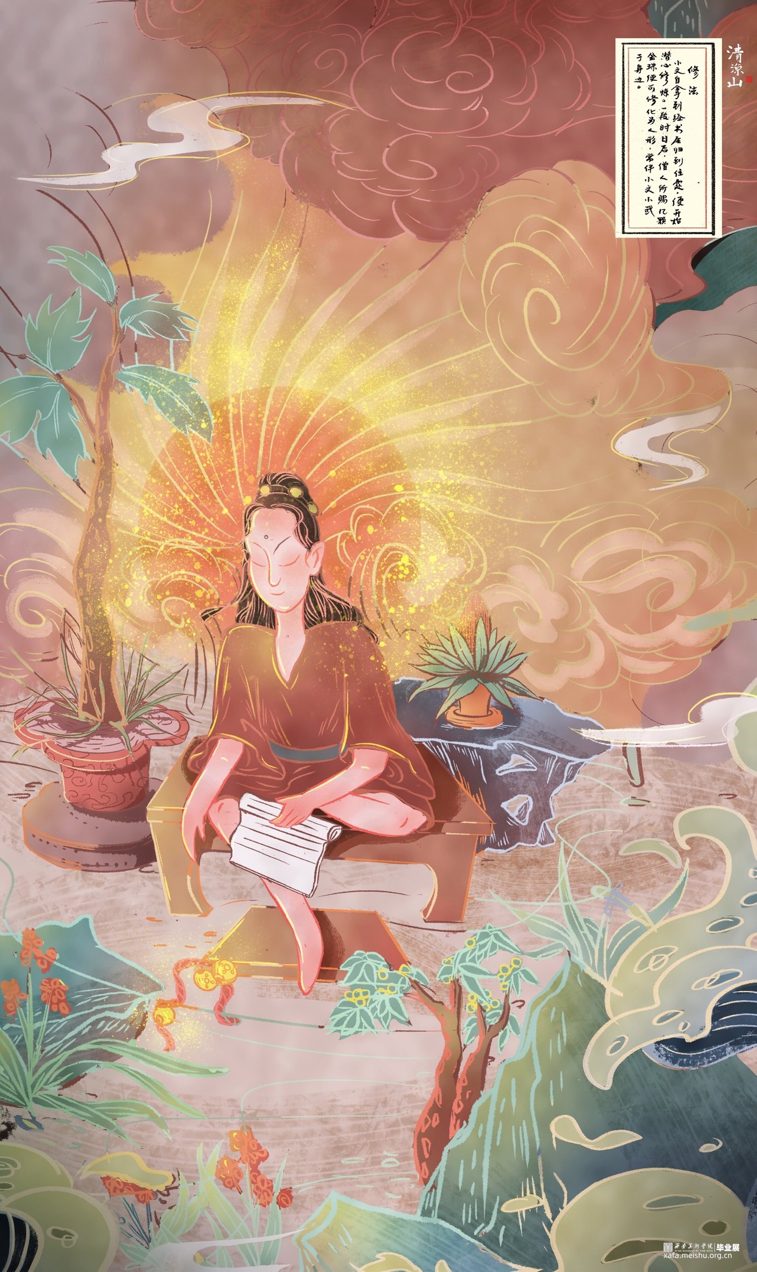 作品《清凉山》以五台山“清凉”一说的来历故事作为题材进行改编,使得叙事框架融入当代审美价值观。山西寺观壁画体系较为完整,内容精细丰富,于文化、美术、装饰等诸多方面都具有重要历史意义和研究价值,是中国传统壁画艺术中的重要篇章之一,本作品画面内容上是以山西寺观壁画为提取借鉴蓝本,将异时同画式构图、人兽结合的夸张造型及装饰性的传统纹样应用于漫画创作中,传承文化的同时探索一种创作中国原创漫画的风格可能。《清凉山》漫画作品的创作,以山西寺观壁画与漫画的融合为出发尝试点,在传统与现代的碰撞、神话传说与当代价值观的对话中,用光怪陆离的图像叙事带以观赏者更多中国传统艺术的魅力展现。