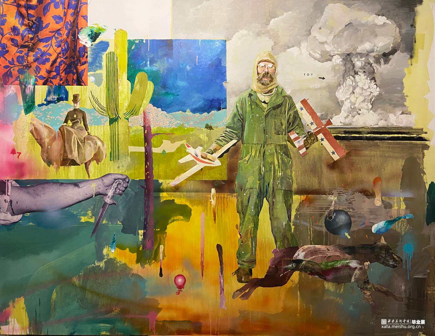 《你好世界》220x170cm 作品挪用了摄影作品及过去的老照片,并将不同图形与空间重新解构再重组成新的图像空间,在控制和即兴的创作状态中去探索作品中抽象与具象、秩序与自由之间的稳定关系,并发掘更多绘画视觉形式的可能性,进一步探索思考社会集体潜意识。