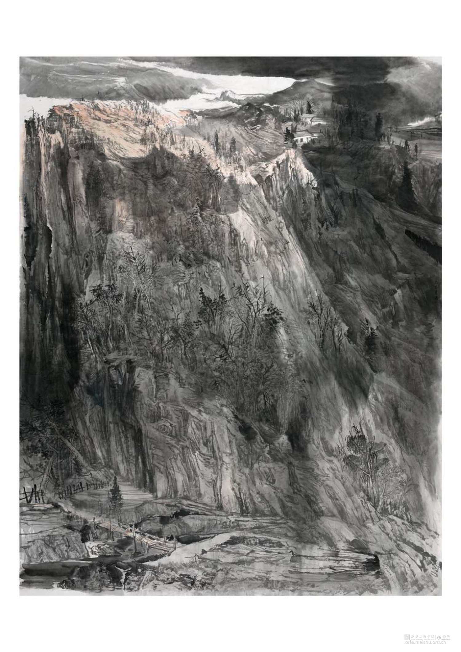 华山以其挺拔险要屹立于陕西秦岭山脉之中。整个山体如同一块巨大的花岗岩,我一直存在表现之欲,但不知从何落笔,后经过多次近距离触摸和体会再现华山纯粹之美,感受岩石规律中的无穷变化之趣。在研究生学习期间,我多次在考察写生时,被秦岭华山那苍茫、大气、恢弘、野逸的气质所深深吸引,它深厚的地域文化与独特的地貌特征是我创作的源泉与动力。