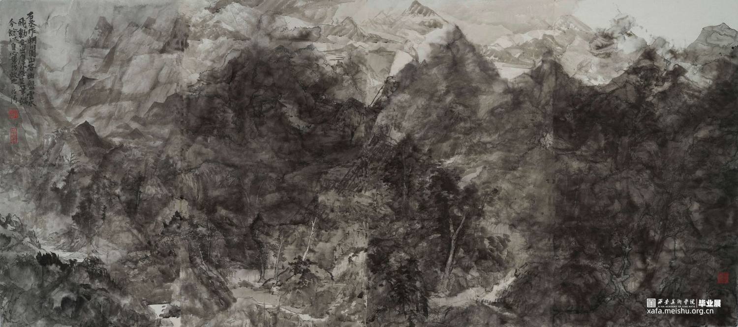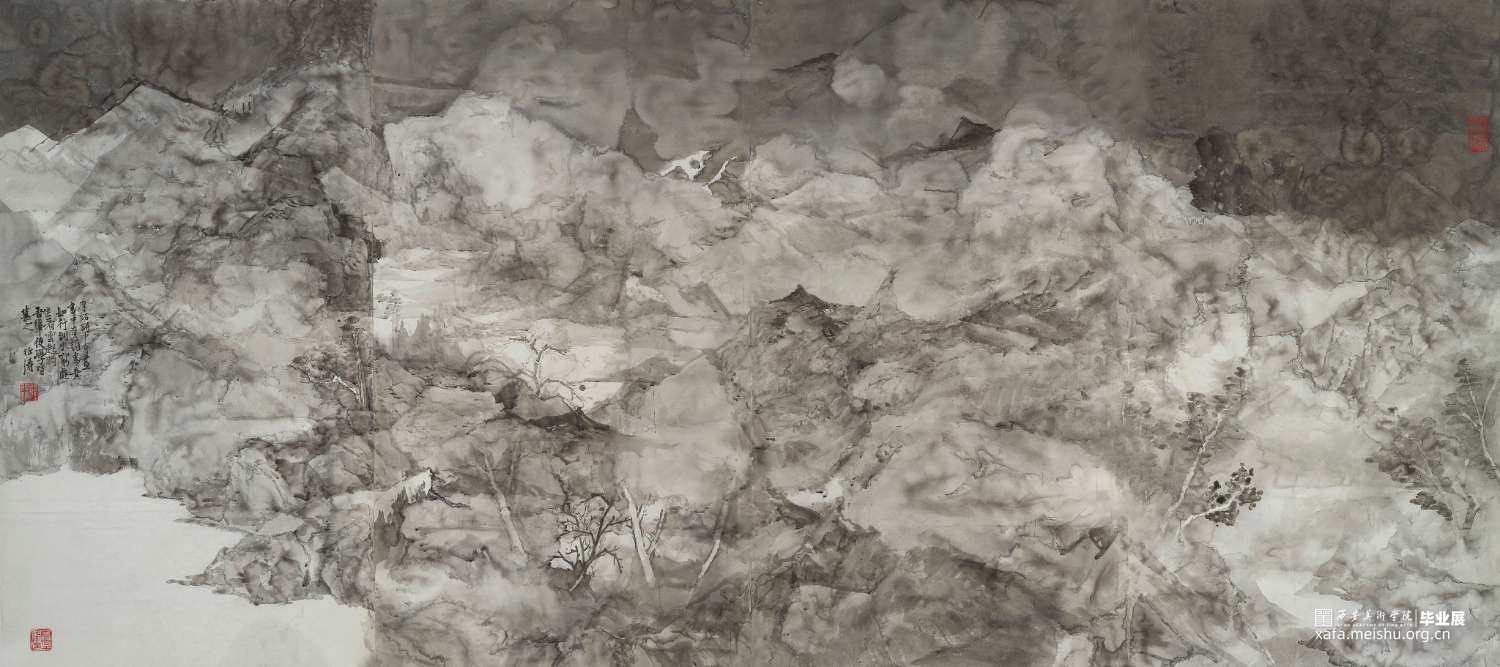 《心•辋》——径入辋川 是作者对辋川整体印象的表现,其创作灵感来源于近几年多次去辋川实地写生的所见所吾。不同的时间,不同的时节,不同的天气都会给人以不同的刺激,一切外部条件都在变化,所以作者想要表现出一种不断运动变化的辋川。而表现特点上主要在于仿效古人对于王维《辋川图》“山谷幽盘,云水飞动,意出尘外,怪生笔端”的描述,以墨代笔,展现辋川自然的原生态。