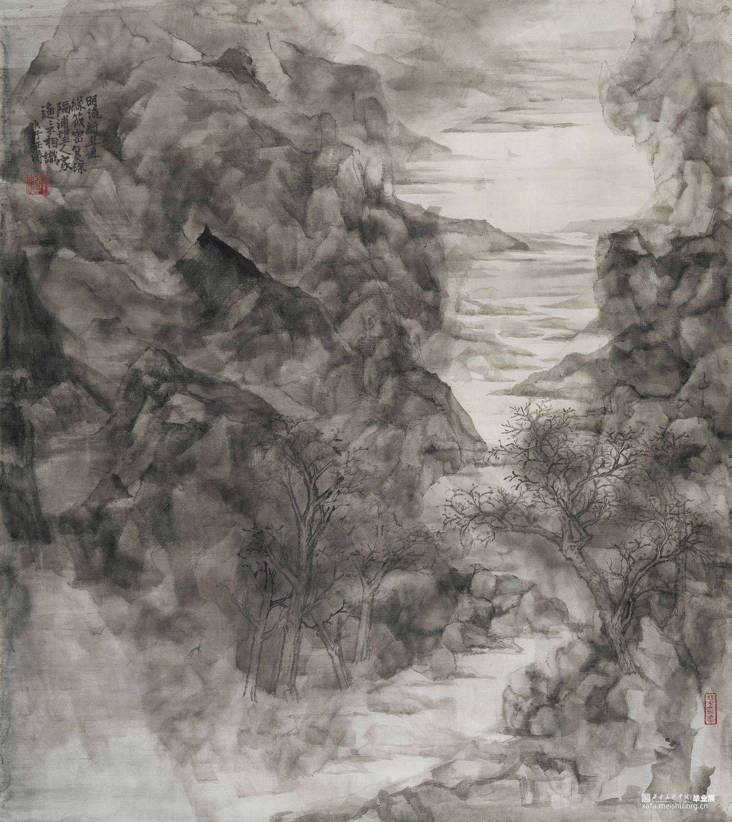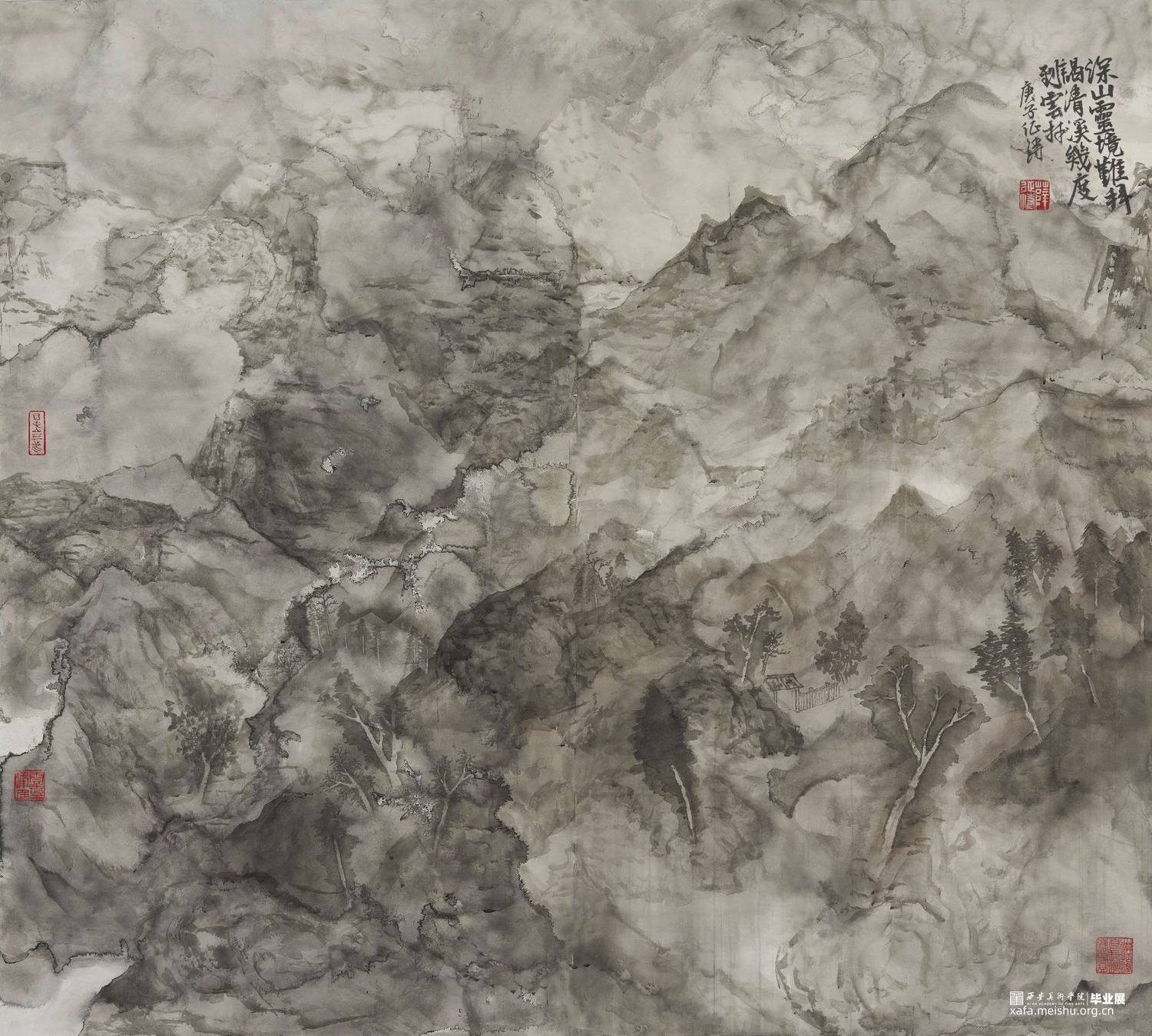 《心•辋》——云林灵境 通过对云林意象的表现以达到营造一种灵境的目的。云林意象具有两层含义,从字面意思来看,是指对云和林两种物象的表现,而更深层的含义代指隐居之所,所以,这一作品是通过对辋川山林以及当中云气的表现去烘托出这一王维隐居之地的空灵之感。