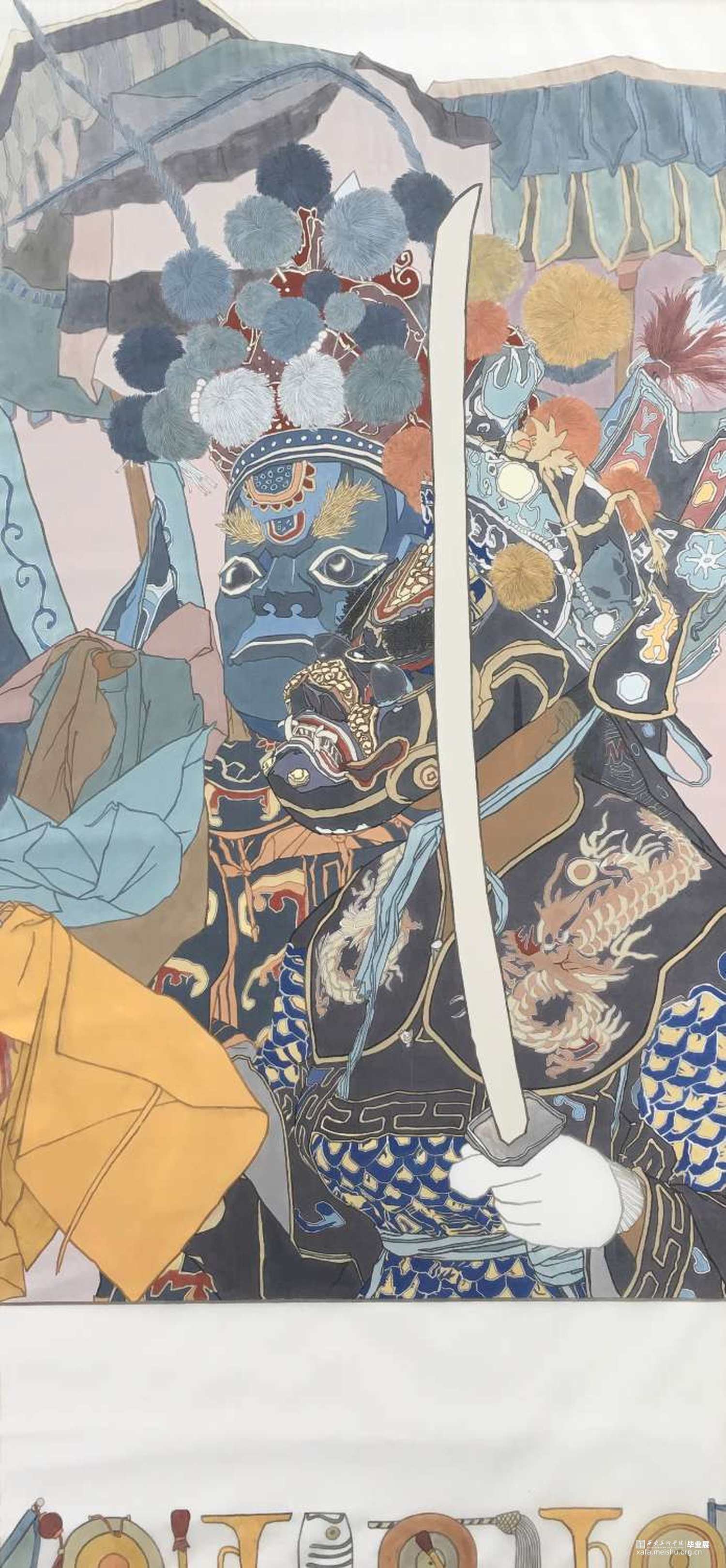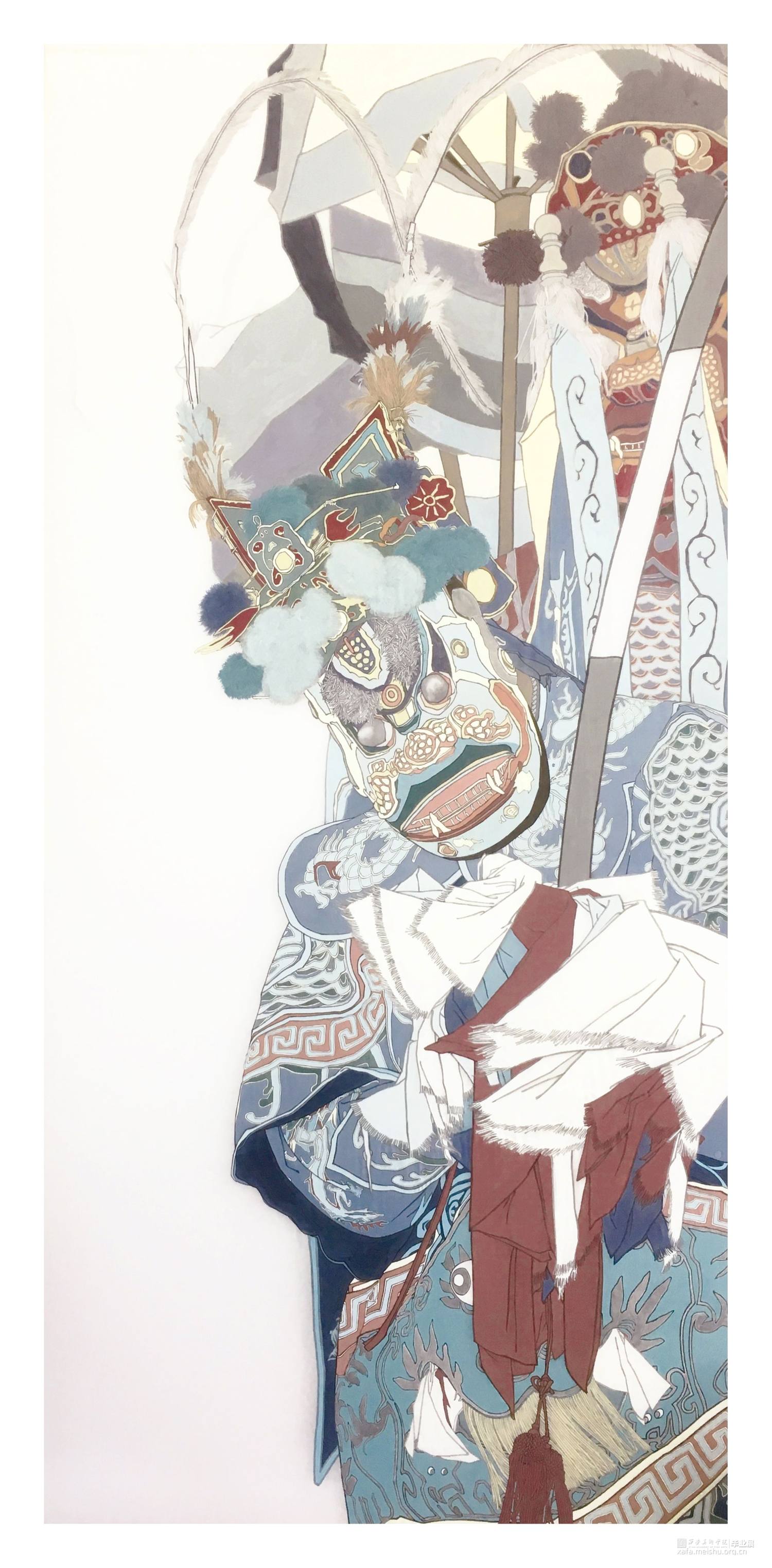 “驱傩击鼓吹长笛,瘦鬼染面惟齿白。暗中崒崒拽茅鞭,倮足朱裈行戚戚。相顾笑声冲庭燎,桃弧射矢时独叫。”祭神跳鬼、驱瘟避疫,源远流长的巫傩文化在不断变化的傩仪中传承下来,在戏剧界中被反复挖掘。但文化是多元的,绘画不应局限于绘画的界限,傩戏作为戏剧的一种形式也不该被束于戏坛。当创作的对象是经过悠长历史洗磨过后的古老文化时,也许能体味到穿越时空的观感。将古朴的意味注入画面,在现代注重形式感的构图下与重表现的戏剧形式相结合,触碰内蕴深厚的苍茫。