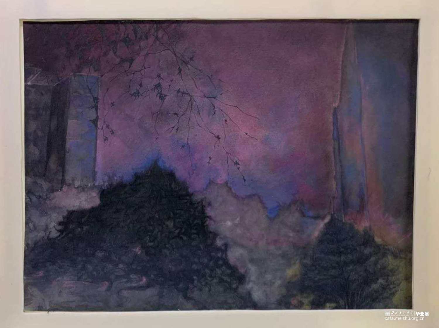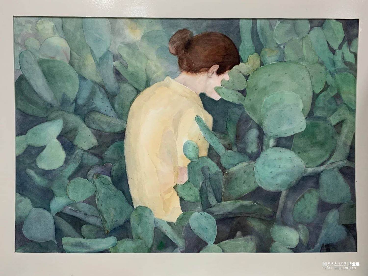 《夜幕下的垂枝》这幅作品是晚上在校园内取的场景进行创作,当时在旁边还有一同回去的舍友,我们一同看向天空的一边,夜幕的颜色和城市的灯光交错渲染了校园的外围,连校园内的树枝也有舞动的错觉,拿起手机记录了这一刻。对快毕业同行的我们虽然的短暂的美好,但是还是会保存着那份长久的友谊。在创作的同时并没有考虑它本身的色彩,是依我精神的主观色彩去表达去展现,在目光一瞬间失焦目光眩晕的同时,我也看到了创作本身的意义。《丛中》这幅作品展现出一个女子伫立在仙人掌丛中,头背对一侧仿佛有着自己的心事,在带刺的危机感周围,色彩相对压抑,时时刻刻将要笼罩着女子。但是身后的阳光却落在女子的肩膀上,温暖的颜色点缀的很少却将画面的冷色溶解。生活有时会带来紧张和压抑,来绷紧我们的神经,但是总有我们看不到的光会关心着我们,我们不曾发觉,走出阴霾也需要考验与勇气。