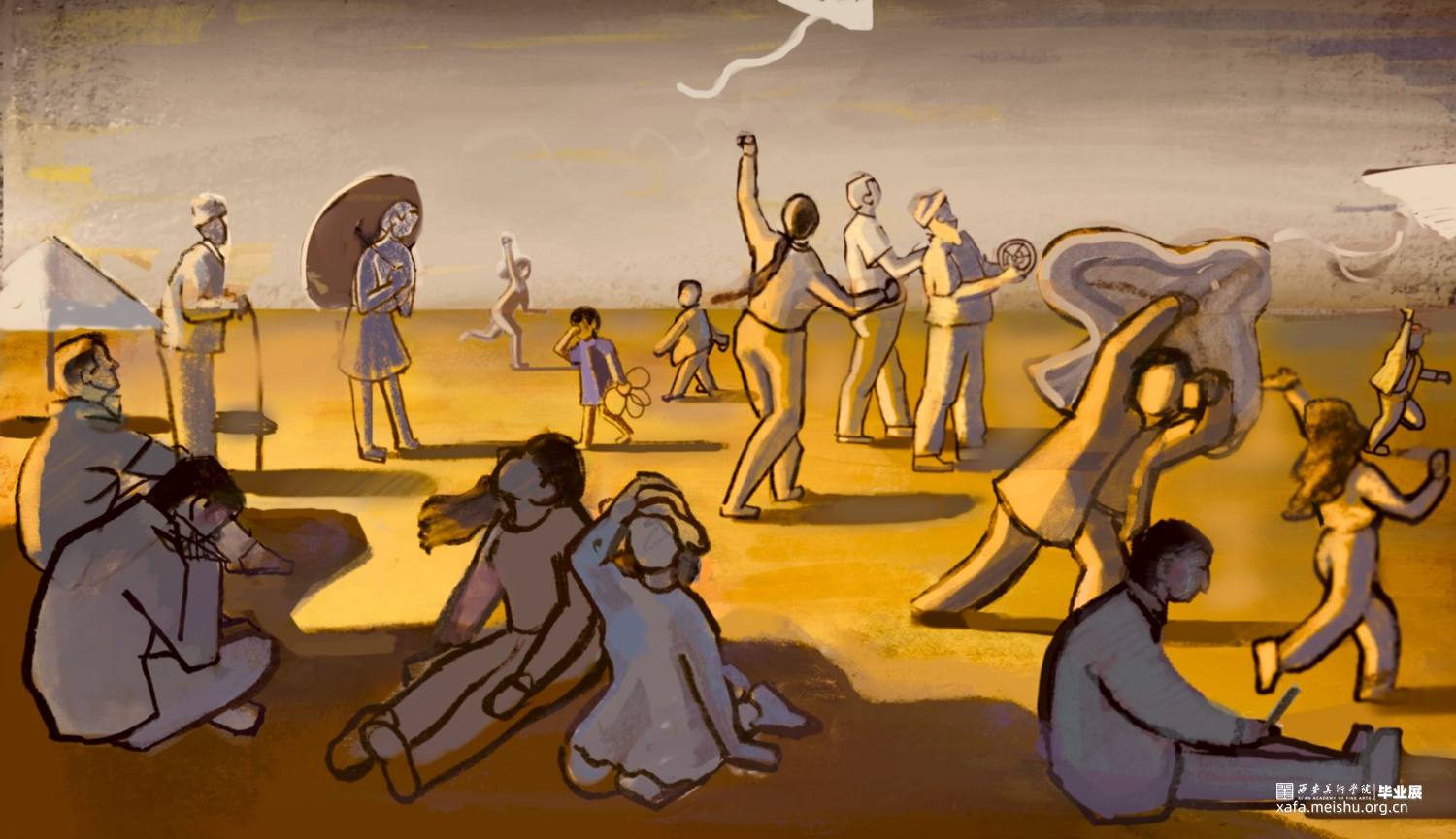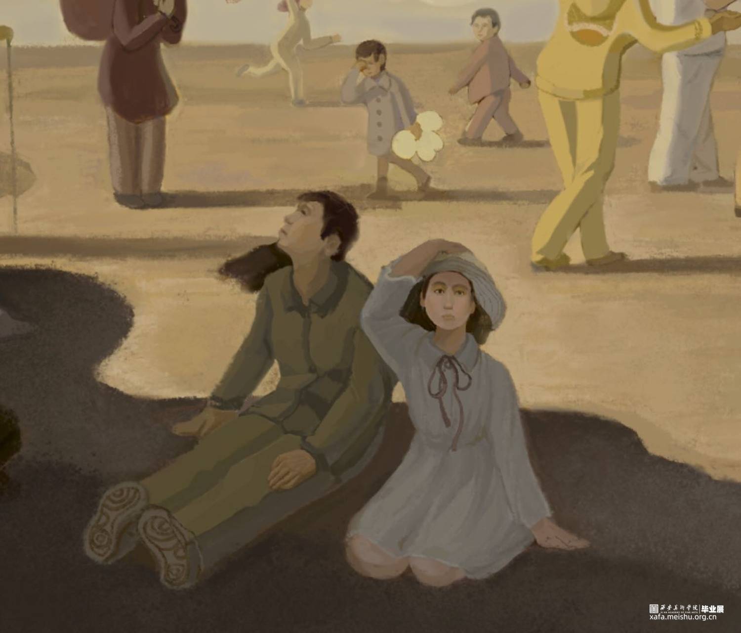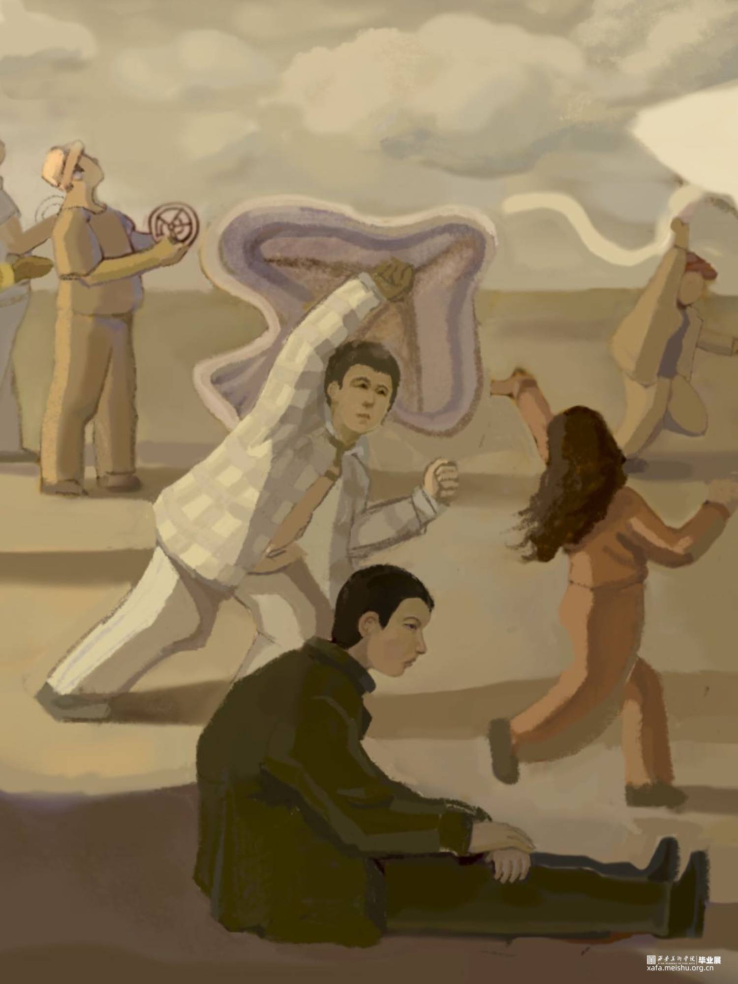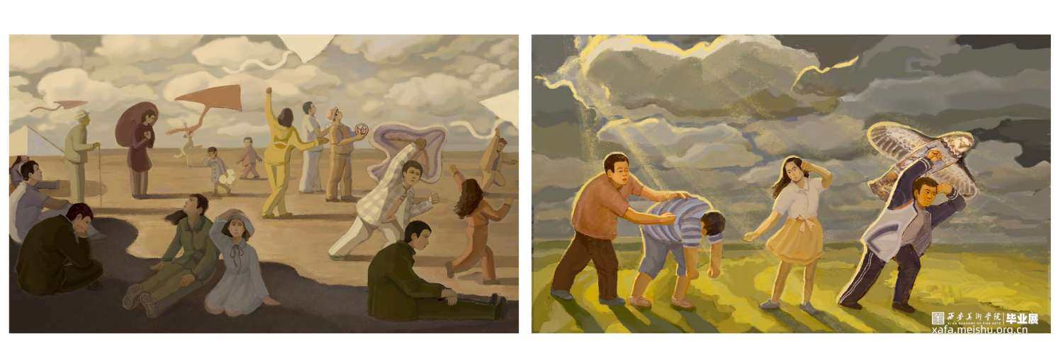 这幅作品构思于武汉封城期间,画面中描绘的是几位少年人在狂风中前行,此时乌云布满天空,风也呼啸不止,环境虽然这样艰难,但他们互相帮助,却是逆风前行,我想用这样的方式来赞扬那些勇敢的逆行者们,她们面对可怕的病毒仍然挺身而出,带着人们期盼的心愿,在众志成城的努力下,终于迎来了绚烂的光明。