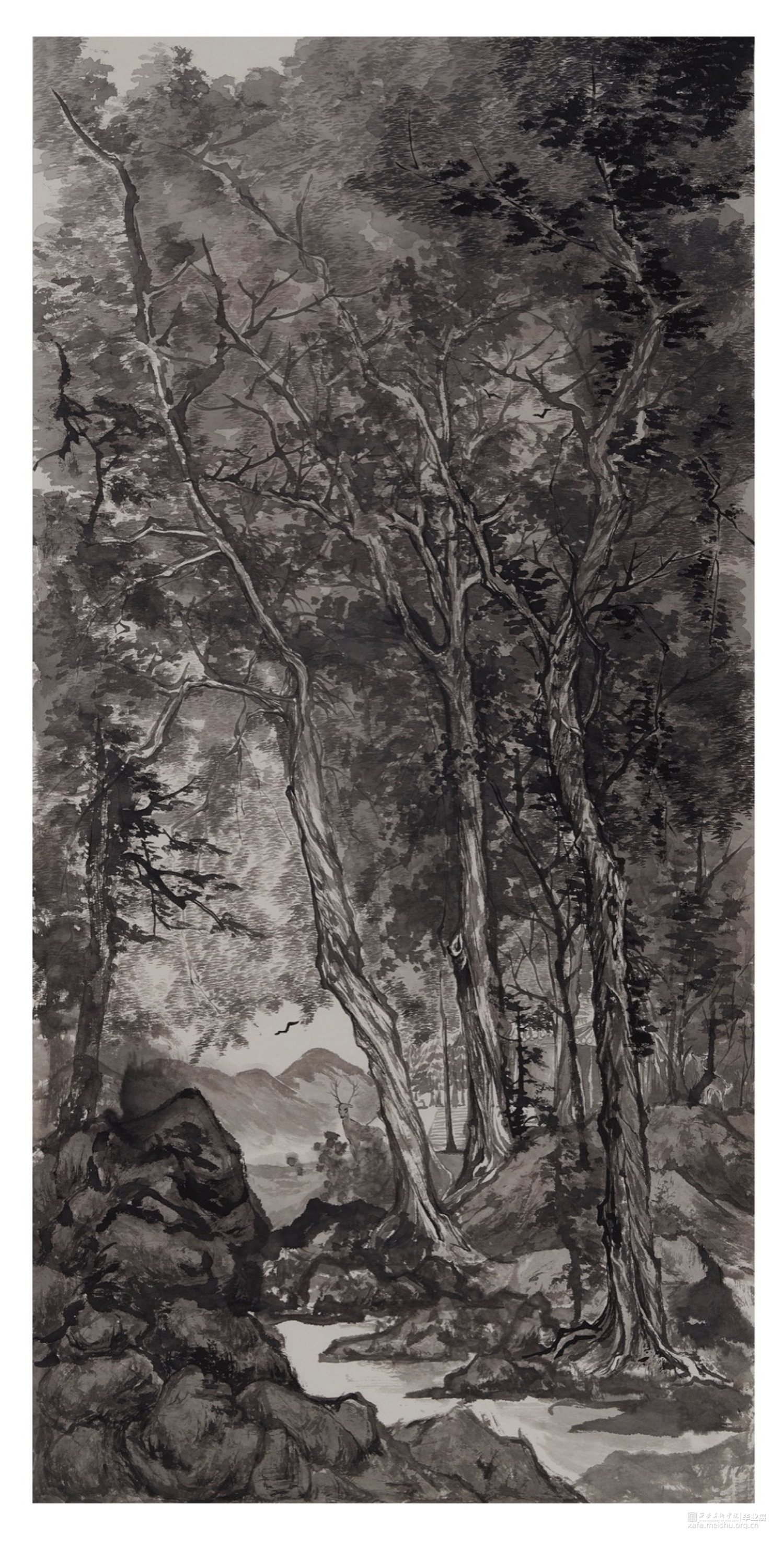 我的创作《林深时见鹿》是以树林为主题的山水画作品,是以我在南方园林中进行的的山水风景写生为基础创作的,同时融入了我自己心中的理想山水,是对我精神家园的一种表达。