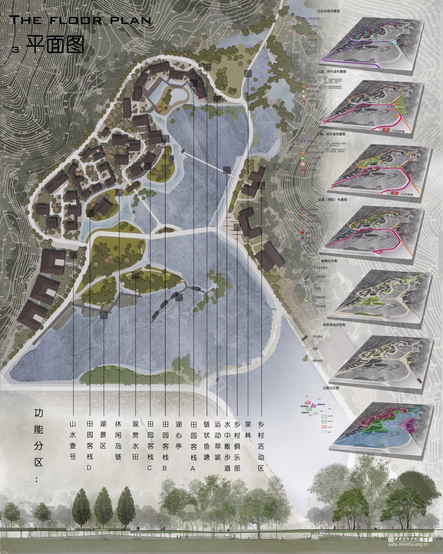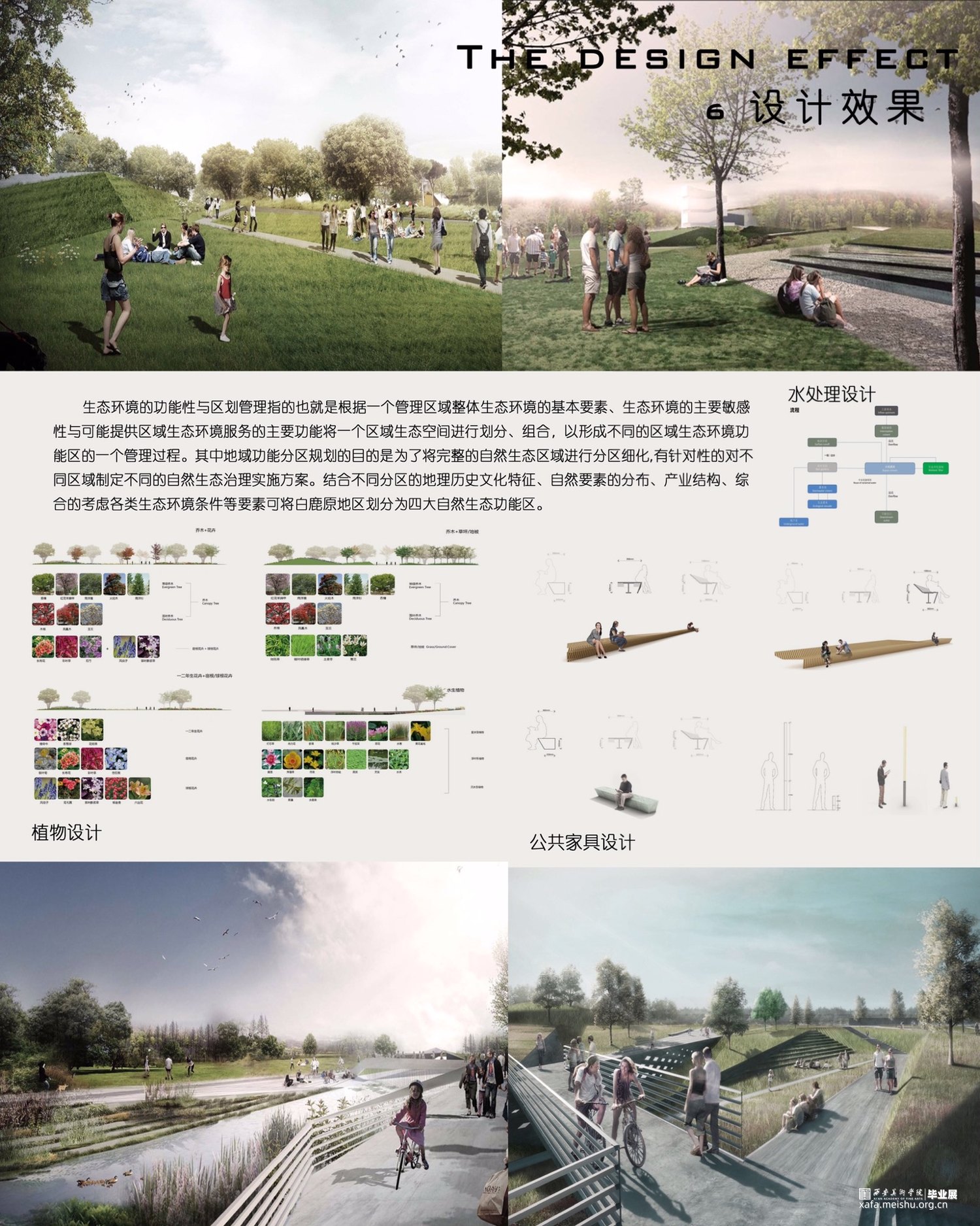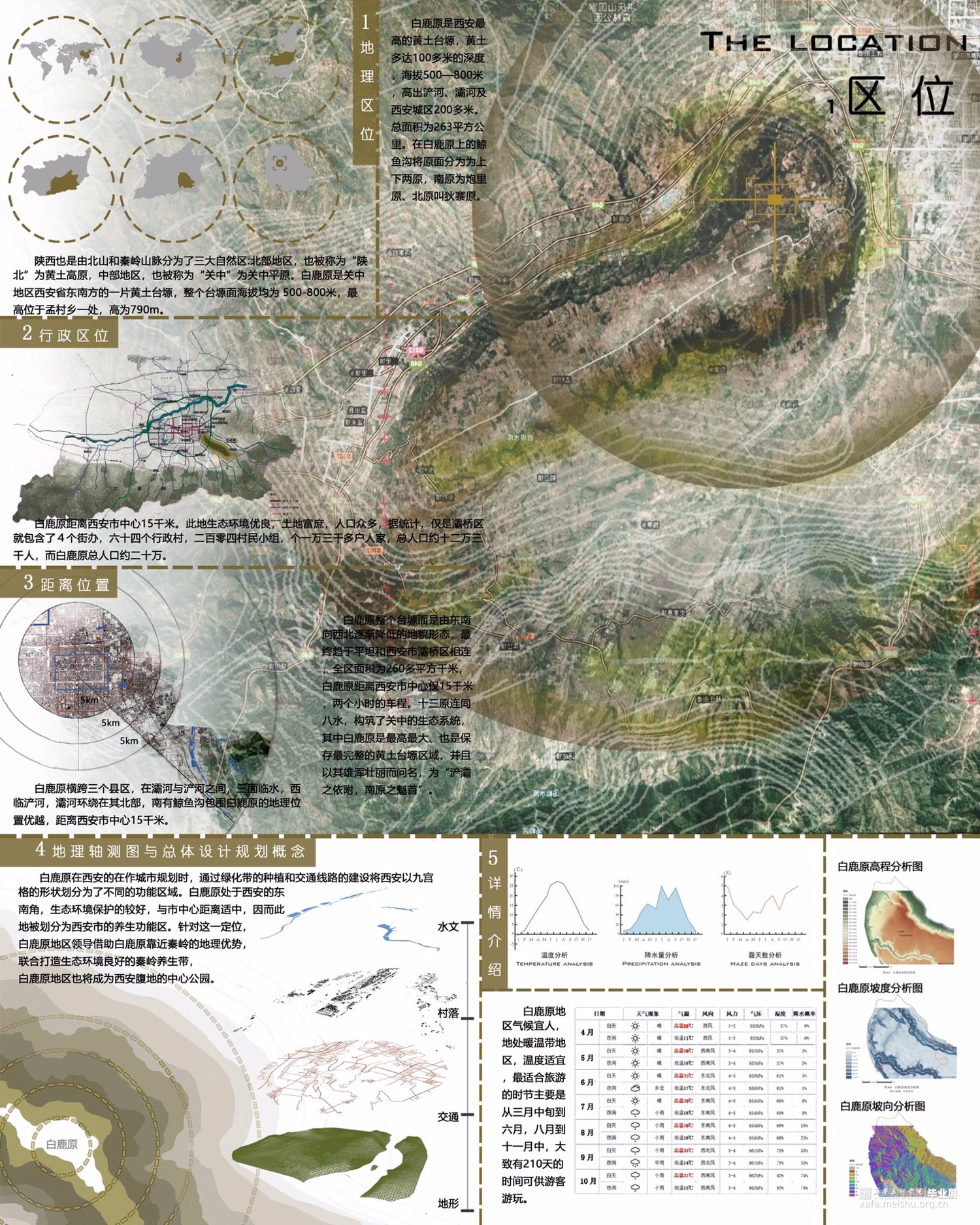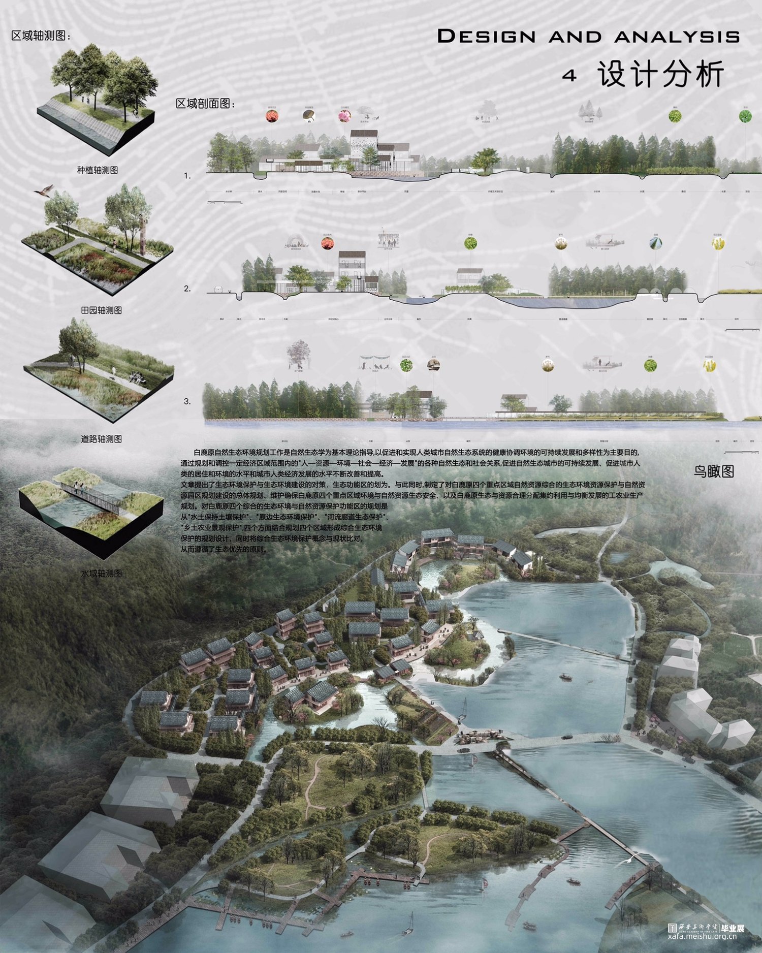 设计围绕关中核心城市西安地区生态环境保护,着眼于西安周边白鹿原生态与人文景观保护课题进行科学研究与探索,白鹿原自然生态环境景观示范区的规划设计以生态环境保护为宗旨而进行,发展环保旅游促进区域经济增长,创建优美的旅游环境推动区域经济增长,带动相关产业发展,改变区域产业结构布局。旅游经济的飞速发展,必然带动区域其他产业的发展,改变以农业为主的传统产业布局结构。设计旨在保护青山绿水的自然环境和创造可持续发展的旅游环境。设计结合国家提出建立美丽乡村的时代背景,探索符合白鹿原自身生态与人文景观可持续发展的保护理念,保护青山绿水,使白鹿原成为古城西安美好的自然与人文景观后花园,积极参与献计献策之中。