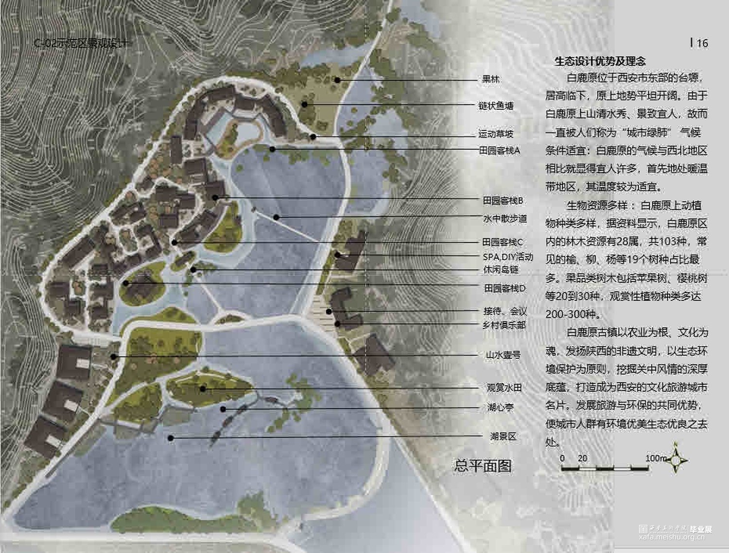 设计围绕关中核心城市西安地区生态环境保护,着眼于西安周边白鹿原生态与人文景观保护课题进行科学研究与探索,白鹿原自然生态环境景观示范区的规划设计以生态环境保护为宗旨而进行,发展环保旅游促进区域经济增长,创建优美的旅游环境推动区域经济增长,带动相关产业发展,改变区域产业结构布局。旅游经济的飞速发展,必然带动区域其他产业的发展,改变以农业为主的传统产业布局结构。设计旨在保护青山绿水的自然环境和创造可持续发展的旅游环境。设计结合国家提出建立美丽乡村的时代背景,探索符合白鹿原自身生态与人文景观可持续发展的保护理念,