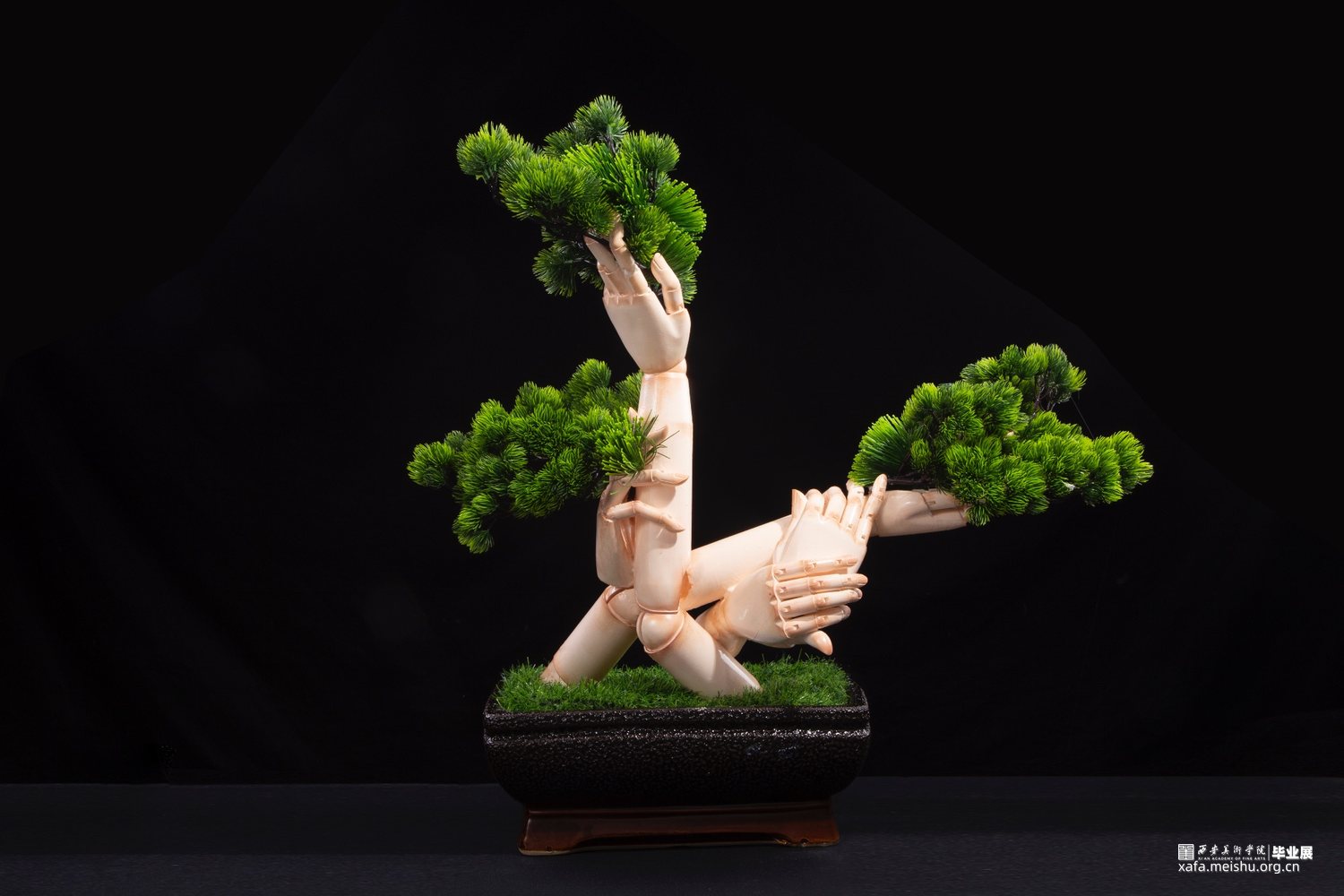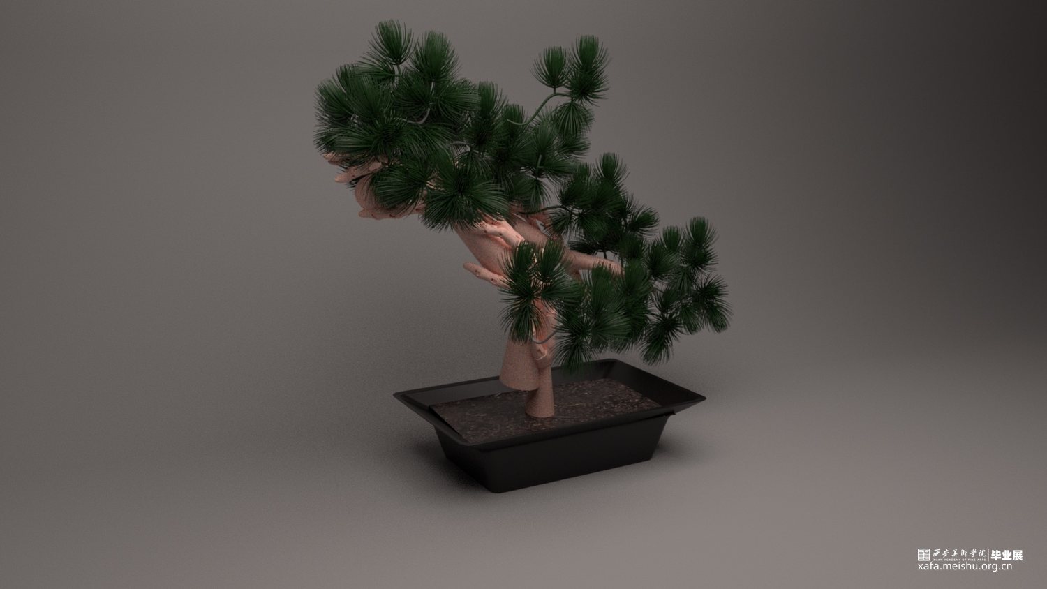 而盆景松树曲折的虬枝有时与女性身体的轮廓相像,客体化女性形象在某种意义上也如盆景松树一样呈现着非自然的状态,她们被凝视,被物化,被约束限制。